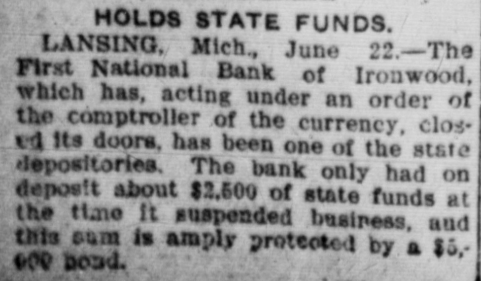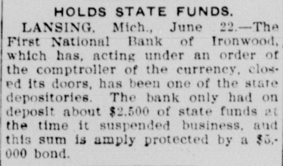 HOLDS STATE FUNDS. LANSING. Mich., June 22.-The First National Bank of Ironwood, which has, acting under an order of the comptroller of the currency, closed its doors, has been one of the state depositories. The bank only had on deposit about $2,500 of state funds at the time it suspended business, and this sum is amply protected by a $5,000 bond.