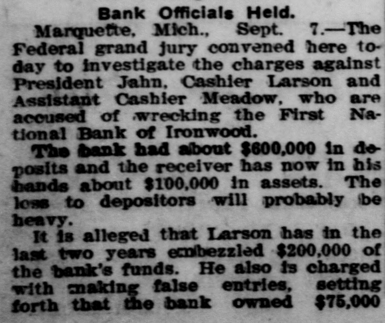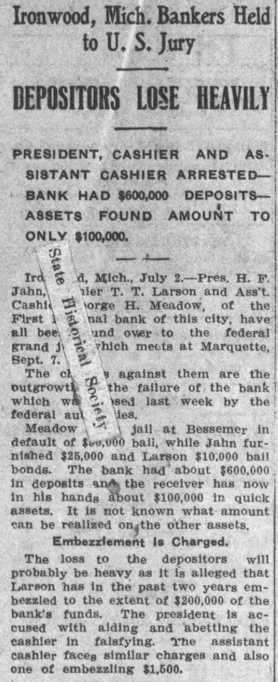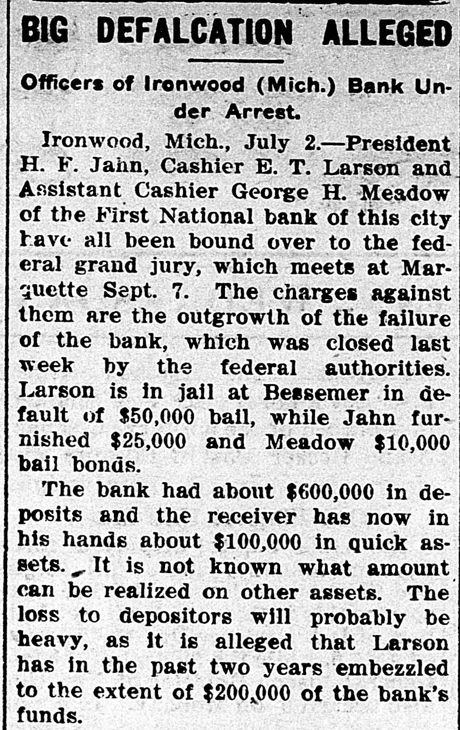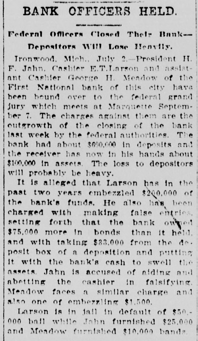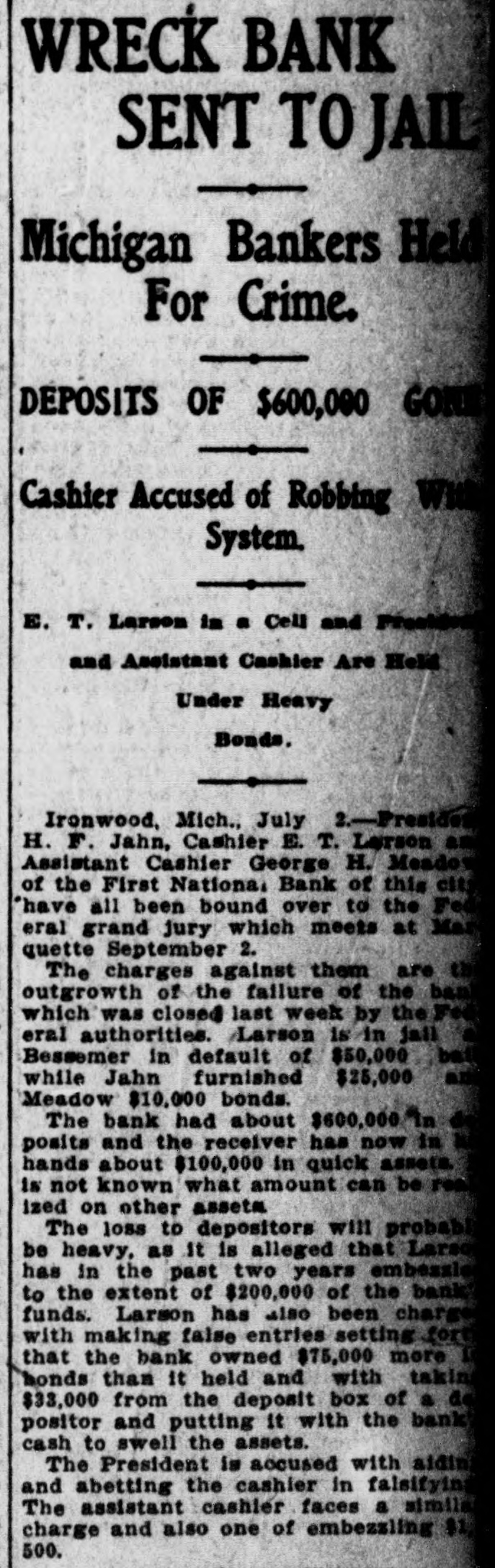 Ironwood, Mich. Bankers Held to U. S. Jury DEPOSITORS LOSE HEAVILY PRESIDENT, CASHIER AND AS. SISTANT CASHIER ARRESTEDBANK HAD $600,000 DEPOSITSASSETS FOUND AMOUNT TO ONLY $100,000. Ird d, Mich., July 2.-Pres. H. F. state hier T. T. Larson and Ass't. Jahn, Cashie orge H. Meadow, of the First nal bank of this city, have all bee und over to the federal grand j which meets at Marquette, Sept. 7. The cl against them are the the failure of the bank outgrowth which wa sed last week by the federal au ies, briefs) Meadow jail at Bessemer in default of $60,000 ball, while Jahn furnished $25,000 and Larson $10,000 bail bonds. The bank had about $600,000 in deposits and the receiver has now in his hands about $100,000 in quick assets. It is not known what amount can be realized on the other assets. Embezzlement is Charged. The loss to the depositors will probably be heavy as it is alleged that Larson has in the past two years embezzled to the extent of $200,000 of the bank's funds. The president is accused with aiding and abetting the cashier in falsfying. The assistant cashier faces similar charges and also one of embezzling $1,500.