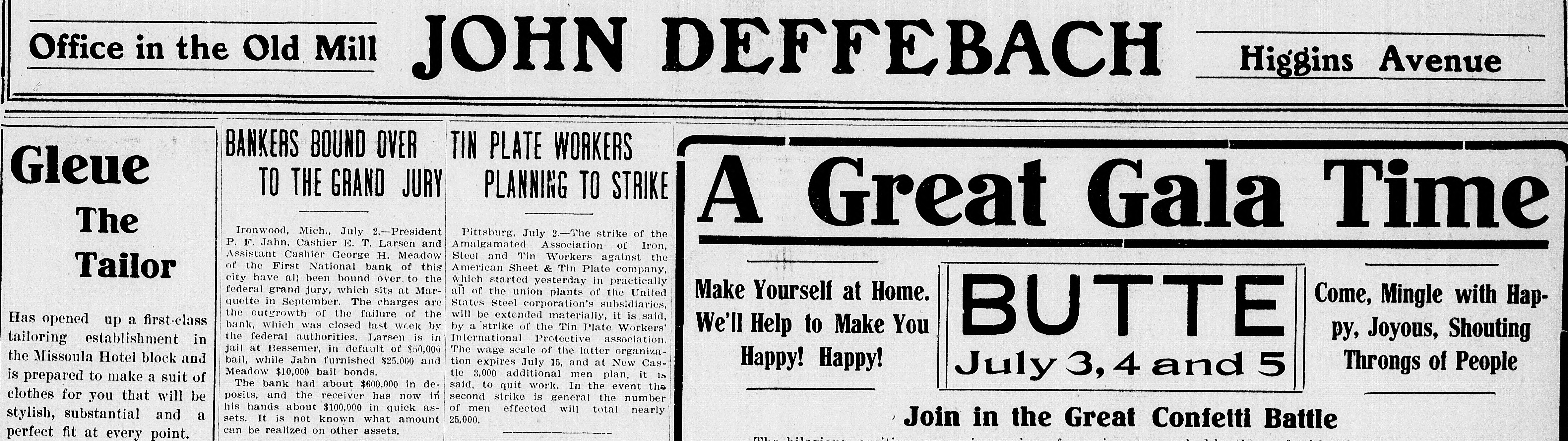 Office in the Old Mill Higgins Avenue JOHN DEFFEBACH BANKERS BOUND OVER TIN PLATE WORKERS Gleue TO THE GRAND JURY PLANNING TO STRIKE A Great Gala Time The Ironwood, Mich., July 2.-President Pittsburg, July 2.-The strike of the P. F. Jahn, Cashier E. T. Larsen and Amalgamated Association of Iron, Assistant Cashier George H. Meadow Steel and Tin Workers against the of the First National bank of this American Sheet & Tin Plate company, Tailor city have all been bound over to the which started yesterday in practically federal grand jury, which sits at Marall of the union plants of the United Make Yourself at Home. quette in September. The charges are Come, Mingle with HapStates Steel corporation's subsidiaries, the outgrowth of the failure of the will be extended materially, it is said, Has opened up a first-class bank, which was closed last week by by a strike of the Tin Plate Workers' BUTTE We'll Help to Make You the federal authorities. Larsen is in py, Joyous, Shouting International Protective association. tailoring establishment in jail at Bessemer, in default of $50,000 The wage scale of the latter organizathe Missoula Hotel block and bail, while Jahn furnished $25.000 and tion expires July 15, and at New CasHappy! Happy! Throngs of People Meadow $10,000 bail bonds. tle 3,000 additional men plan, it Is July 3, 4 and 5 is prepared to make a suit of The bank had about $600,000 in desaid, to quit work. In the event the posits, and the receiver has now in second strike is general the number clothes for you that will be his hands about $100,000 in quick asof men effected will total nearly stylish, substantial and a sets. It is not known what amount 25,000. Join in the Great Confetti Battle can be realized on other assets. perfect fit at every point.