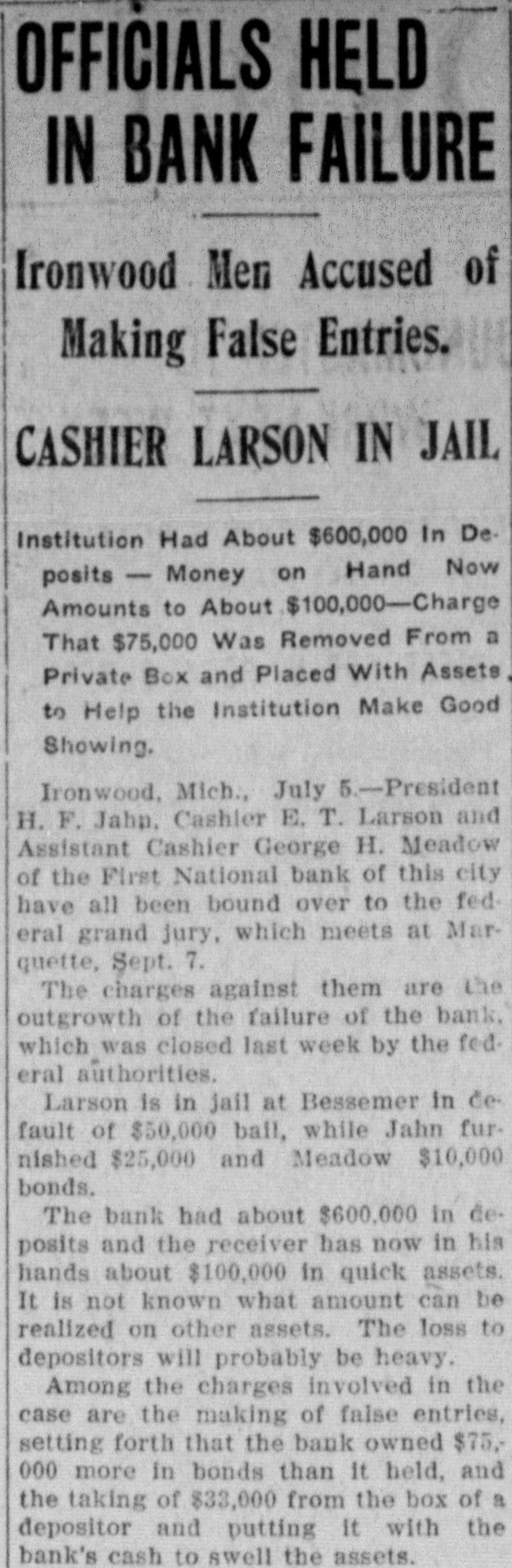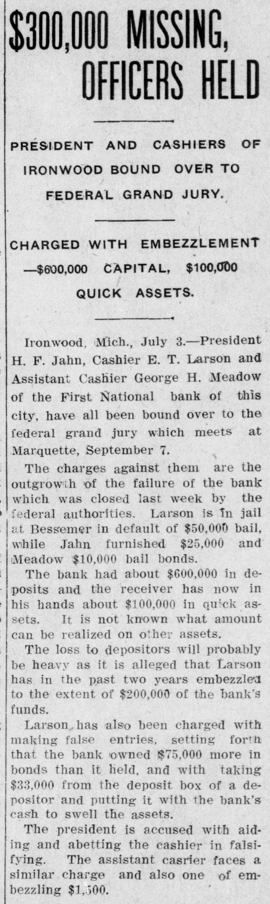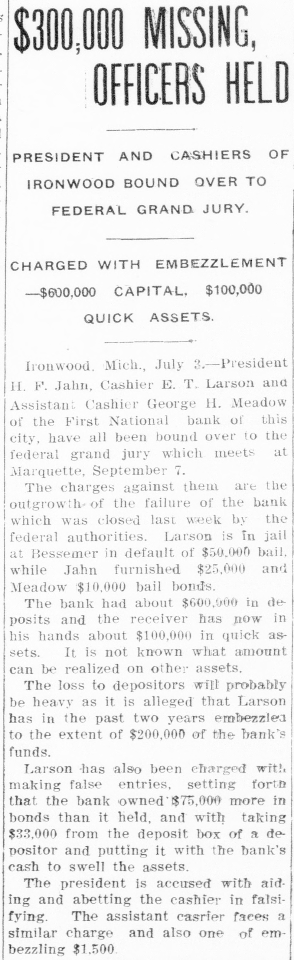 $300,000 MISSING, OFFICERS HELD PRESIDENT AND CASHIERS OF IRONWOOD BOUND OVER TO FEDERAL GRAND JURY. CHARGED WITH EMBEZZLEMENT -$600,000 CAPITAL, $100,000 QUICK ASSETS. Ironwood, Mich., July 3.-President H. F. Jahn, Cashier E. T. Larson and Assistant Cashier George H. Meadow of the First National bank of this city, have all been bound over to the federal grand jury which meets at Marquette, September 7. The charges against them are the outgrowth of the failure of the bank which was closed last week by the federal authorities. Larson is in jail at Bessemer in default of $50,000 bail, while Jahn furnished $25,000 and Meadow $10,000 bail bonds. The bank had about $600,000 in deposits and the receiver has now in his hands about $100,000 in quick assets. It is not known what amount can be realized on other assets. The loss to depositors will probably be heavy as it is alleged that Larson has in the past two years embezzled to the extent of $200,000 of the bank's funds. Larson has also been charged with making false entries, setting forth that the bank owned $75,000 more in bonds than it held, and with taking $33,000 from the deposit box of a depositor and putting it with the bank's cash to swell the assets. The president is accused with aiding and abetting the cashier in falsifying. The assistant casrier faces a similar charge and also one of embezzling $1,500.