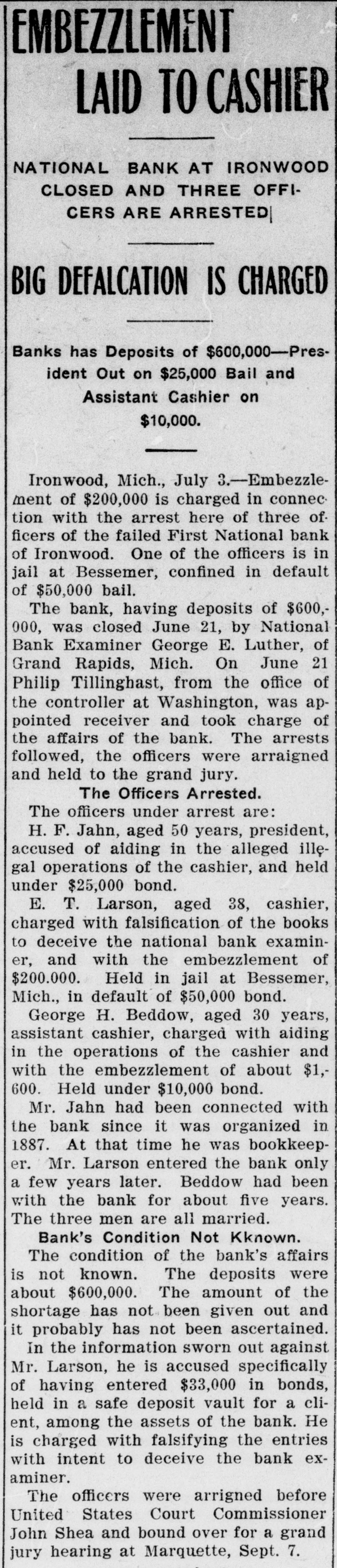 EMBEZZLEMENT LAID TO CASHIER NATIONAL BANK AT IRONWOOD CLOSED AND THREE OFFICERS ARE ARRESTED BIG DEFALCATION IS CHARGED Banks has Deposits of $600,000-President Out on $25,000 Bail and Assistant Cashier on $10,000. Ironwood, Mich., July 3.-Embezzlement of $200,000 is charged in connec tion with the arrest here of three officers of the failed First National bank of Ironwood. One of the officers is in jail at Bessemer, confined in default of $50,000 bail. The bank, having deposits of $600,000, was closed June 21, by National Bank Examiner George E. Luther, of Grand Rapids, Mich. On June 21 Philip Tillinghast, from the office of the controller at Washington, was appointed receiver and took charge of the affairs of the bank. The arrests followed, the officers were arraigned and held to the grand jury. The Officers Arrested. The officers under arrest are: H. F. Jahn, aged 50 years, president, accused of aiding in the alleged illegal operations of the cashier, and held under $25,000 bond. E. T. Larson, aged 38, cashier, charged with falsification of the books to deceive the national bank examiner, and with the embezzlement of $200.000. Held in jail at Bessemer, Mich., in default of $50,000 bond. George H. Beddow, aged 30 years, assistant cashier, charged with aiding in the operations of the cashier and with the embezzlement of about $1,600. Held under $10,000 bond. Mr. Jahn had been connected with the bank since it was organized in 1887. At that time he was bookkeeper. Mr. Larson entered the bank only a few years later. Beddow had been with the bank for about five years. The three men are all married. Bank's Condition Not Kknown. The condition of the bank's affairs is not known. The deposits were about $600,000. The amount of the shortage has not been given out and it probably has not been ascertained. In the information sworn out against Mr. Larson, he is accused specifically of having entered $33,000 in bonds, held in a safe deposit vault for a client, among the assets of the bank. He is charged with falsifying the entries with intent to deceive the bank examiner. The officers were arrigned before United States Court Commissioner John Shea and bound over for a grand jury hearing at Marquette, Sept. 7.