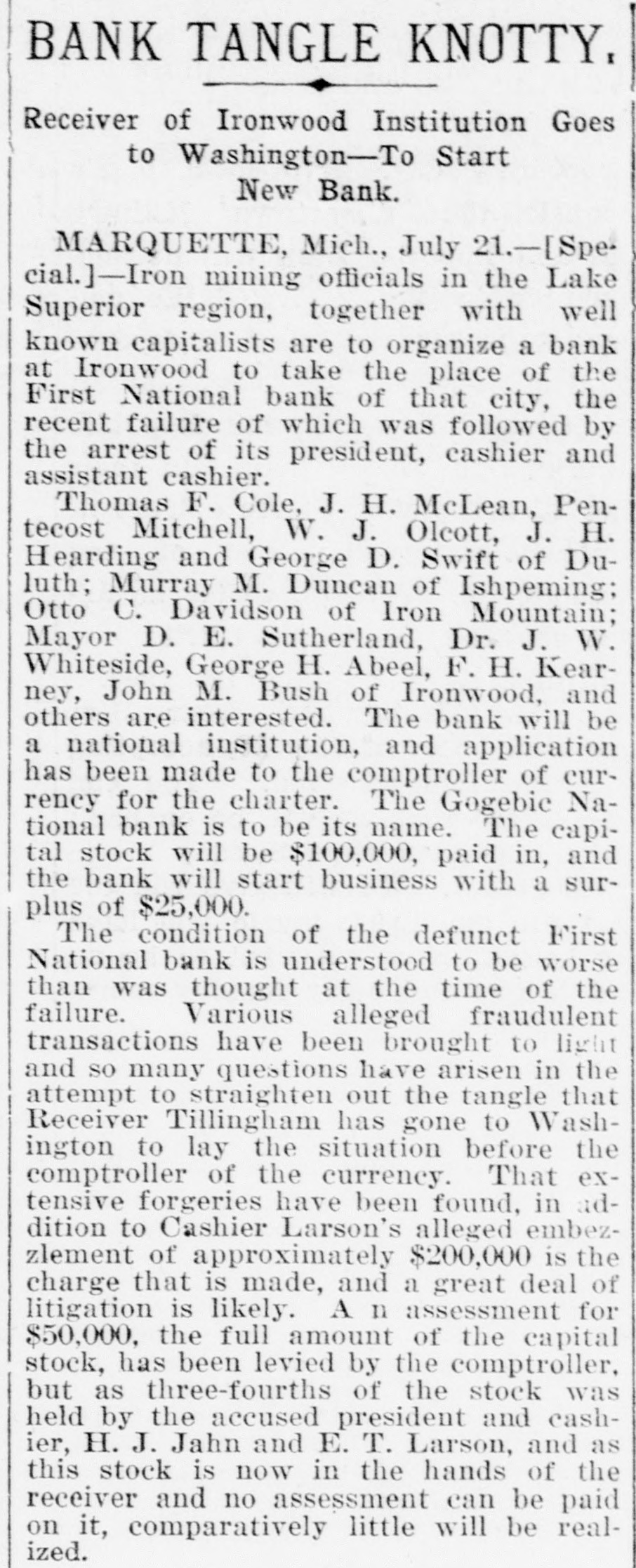 BANK TANGLE KNOTTY. Receiver of Ironwood Institution Goes to Washington-To Start New Bank. MARQUETTE, Mich., July 21.-[Spe. cial.]-Iron mining officials in the Lake Superior region, together with well known capitalists are to organize a bank at Ironwood to take the place of the First National bank of that city, the recent failure of which was followed by the arrest of its president, cashier and assistant cashier. Thomas F. Cole, J. H. McLean, Pentecost Mitchell, W. J. Olcott, J. H. Hearding and George D. Swift of Duluth; Murray M. Duncan of Ishpeming: Otto C. Davidson of Iron Mountain; Mayor D. E. Sutherland, Dr. J. W. Whiteside, George H. Abeel, F. H. Kearney, John M. Bush of Ironwood, and others are interested. The bank will be a national institution, and application has been made to the comptroller of currency for the charter. The Gogebic National bank is to be its name. The capital stock will be $100,000, paid in, and the bank will start business with a surplus of $25,000. The condition of the defunct First National bank is understood to be worse than was thought at the time of the failure. Various alleged fraudulent transactions have been brought to light and SO many questions have arisen in the attempt to straighten out the tangle that Receiver Tillingham has gone to Washington to lay the situation before the comptroller of the currency. That extensive forgeries have been found, in addition to Cashier Larson's alleged embezzlement of approximately $200,000 is the charge that is made, and a great deal of litigation is likely. A Il assessment for $50,000, the full amount of the capital stock, has been levied by the comptroller, but as three-fourths of the stock was held by the accused president and cashier, H. J. Jahn and E. T. Larson, and as this stock is now in the hands of the receiver and no assessment can be paid on it, comparatively little will be realized.