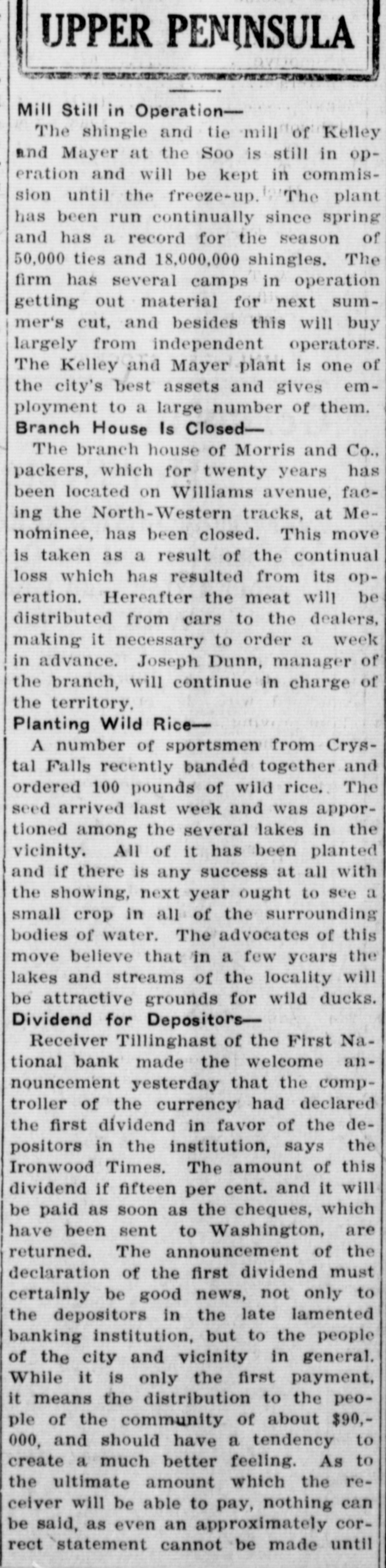 UPPER PENINSULA Mill Still in Operation— The shingle and tie mill of Kelley and Mayer at the Soo is still in operation and will be kept in commission until the freeze-up. The plant has been run continually since spring and has a record for the season of 50,000 ties and 18,000,000 shingles. The firm has several camps in operation getting out material for next summer's cut, and besides this will buy largely from independent operators. The Kelley and Mayer plant is one of the city's best assets and gives employment to a large number of them. Branch House Is Closed— The branch house of Morris and Co., packers, which for twenty years has been located on Williams avenue, facing the North-Western tracks, at Menominee, has been closed. This move is taken as a result of the continual loss which has resulted from its operation. Hereafter the meat will be distributed from cars to the dealers, making it necessary to order a week in advance. Joseph Dunn, manager of the branch, will continue in charge of the territory. Planting Wild RiceA number of sportsment from Crystal Falls recently bandéd together and ordered 100 pounds of wild rice. The seed arrived last week and was apportioned among the several lakes in the vicinity. All of it has been planted and if there is any success at all with the showing, next year ought to see a small crop in all of the surrounding bodies of water. The advocates of this move believe that in a few years the lakes and streams of the locality will be attractive grounds for wild ducks. Dividend for Depositors Receiver Tillinghast of the First National bank made the welcome announcement yesterday that the comptroller of the currency had declared the first dividend in favor of the depositors in the institution, says the Ironwood Times. The amount of this dividend if fifteen per cent. and it will be paid as soon as the cheques, which have been sent to Washington, are returned. The announcement of the declaration of the first dividend must certainly be good news, not only to the depositors in the late lamented banking institution, but to the people of the city and vicinity in general. While it is only the first payment, it means the distribution to the people of the community of about $90,000, and should have a tendency to create a much better feeling. As to the ultimate amount which the receiver will be able to pay, nothing can be said, as even an approximately correct `statement cannot be made until