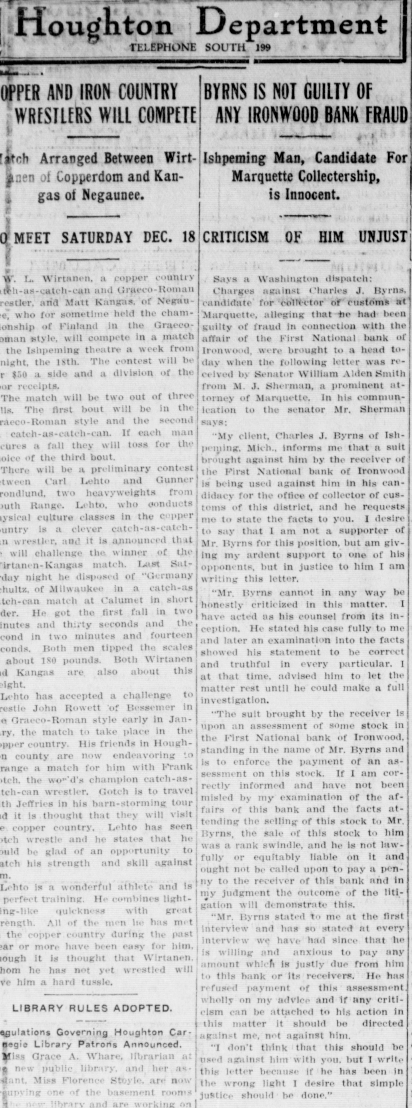 Houghton Department TELEPHONE SOUTH 199 BYRNS IS NOT GUILTY OF OPPER AND IRON COUNTRY ANY IRONWOOD BANK FRAUD WRESTLERS WILL COMPETE Ishpeming Man, Candidate For Iatch Arranged Between WirtMarquette Collectership, anen of Copperdom and Kanis Innocent. gas of Negaunee. CRITICISM OF HIM UNJUST MEET SATURDAY DEC. 18 W. L. Wirtanen, a copper country Says a Washington dispatch: teh-as-catch-can and Graeco-Roman Charges against Charles J. Byrns, candidate for collector of customs at restler, and Matt Kangas, of Negauwho for sometime held the chamMarquette, alleging that he had been guilty of fraud in connection with the onship of Finland in the Graecoaffair of the First National bank of style, will compete in a match Ironwood, were brought to a head tothe Ishpeming theatre a week from night, the 18th. The contest will be day when the following letter was re$50 a side and a division of the ceived by Senator William Alden Smith from M. J. Sherman, a prominent atreceipts. The match will be two out of three torney of Marquette, In his communication to the senator Mr. Sherman 11s. The first bout will be in the ráeco-Roman style and the second says: cateh-as-cateh-can. If each man "My client, Charles J. Byrns of Ishcures a fall they will toss for the peming, Mich., informs me that a suit of the third bout. brought against him by the receiver of There will be a preliminary contest the First National bank of Ironwood tween Carl Lehto and Gunner is being used against him in his canrondlund, two heavyweights from didacy for the office of collector of cusouth Range. Lehto, who conducts toms of this district, and he requests ysical culture classes in the copper me to state the facts to you. I desire untry is a clever catch-as-catchto say that I am not a supporter of wrestler, and it is announced that Mr. Byrns for this position, but am givwill challenge the winner of the ing my ardent support to one of his irtanen-Kangas match. Last Satopponents, but in justice to him I am day night he disposed of "Germany writing this letter. hultz, of Milwaukee in a catch-as "Mr. Byrns cannot in any way be tch-can match at Calumet in short honestly criticized in this matter. I He got the first fall in two have acted as his counsel from its ininutes and thirty seconds and the ception. He stated his case fully to me in two minutes and fourteen and later an examination into the facts conds. Both men tipped the scales showed his statement to be correct about 180 pounds. Both Wirtanen and truthful in every particular. I Kangas are also about this at that time, advised him to let the eight. matter rest until he could make a full Lehto has accepted a challenge to investigation. restle John Rowett of Bessemer in "The suit brought by the receiver is Graeco-Roman style early in Janupon an assessment of some stock in the match to take place in the the First National bank of Ironwood, pper country. His friends in Houghstanding in the name of Mr. Byrns and county are now endeavoring to is to enforce the payment of an asrange a match for him with Frank sessment on this stock. If I am corthe wor'd's champion catch-asrectly informed and have not been tch-can wrestler. Gotch is to travel misled by my examination of the afJeffries in his barn-storming tour fairs of this bank and the facts atit is thought that they will visit tending the selling of this stock to Mr. copper country. Lehto has seen Byrns, the sale of this stock to him wrestle and he states that he was a rank swindle, and he is not lawbe glad of an opportunity to fully or equitably liable on it and atch his strength and skill against ought not be called upon to pay a penny to the receiver of this bank and in Lehto is a wonderful athlete and is my judgment the outcome of the litiperfect training. He combines lightgation will demonstrate this. ing-like quickness with great "Mr. Byrns stated to me at the first rèngth. All of the men lie has met interview and has so stated at every the copper country during the past interview we have had since that he or more have been easy for him, is willing and anxious to pay any hough it is thought that Wirtanen. amount which is justly due from him hom he has not yet wrestled will to this bank or its receivers. He has him a hard tussle. refused payment of this assessment wholly on my advice and if any critiLIBRARY RULES ADOPTED. elsm can be attached to his action in this matter it should be directed egulations Governing Houghton Caragainst me, not against him. negie Library Patrons Announced. "I don't think that this should be Miss Grace A. Whare, librarian at used against him with you, but I write new public library, and her as. this letter because if he has been in stant, Miss Florence Stoyle, are now the wrong light I desire that simple eupying one of the basement rooms justice should be done." new library and are working on