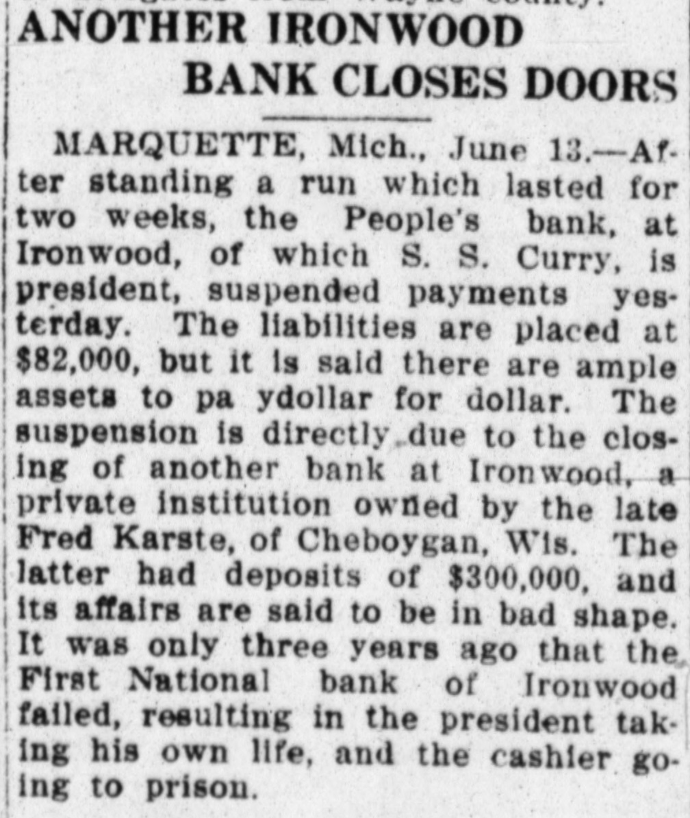 ANOTHER IRONWOOD BANK CLOSES DOORS MARQUETTE, Mich., June 13.-After standing a run which lasted for two weeks, the People's bank, at Ironwood, of which S. S. Curry, is president, suspended payments yesterday. The liabilities are placed at $82,000, but it Is said there are ample assets to pa ydollar for dollar. The suspension is directly due to the closing of another bank at Ironwood, a private institution owned by the late Fred Karste, of Cheboygan, Wis. The latter had deposits of $300,000. and its affairs are said to be in bad shape. It was only three years ago that the, First National bank of Ironwood failed, resulting in the president taking his own life, and the cashier going to prison.