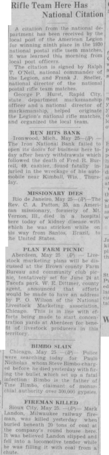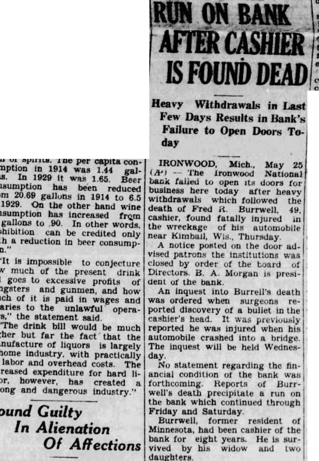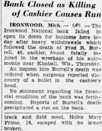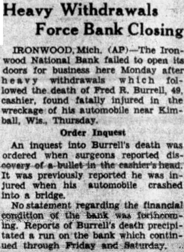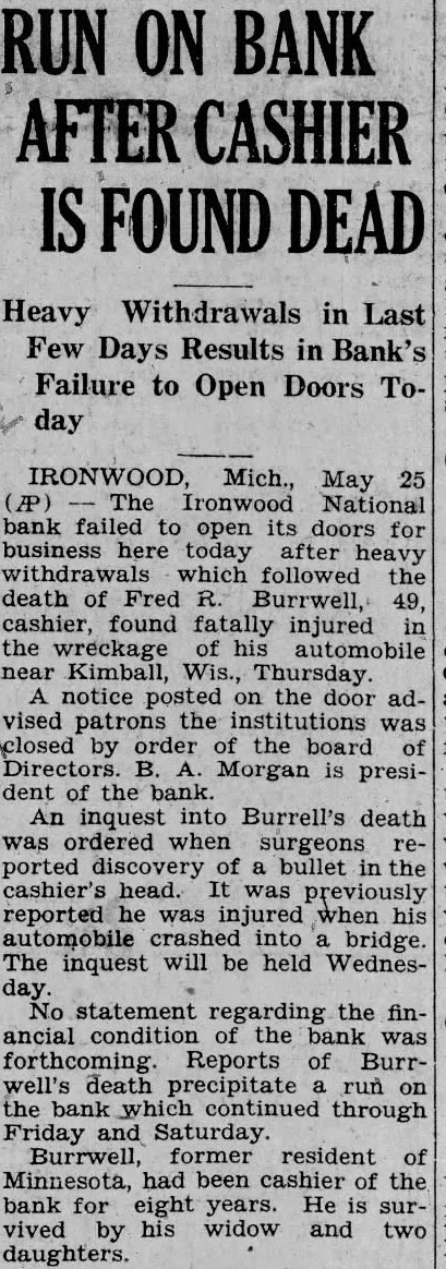 RUN ON BANK CASHIER FOUND Heavy Withdrawals in Last Few Days Results in Bank's Failure to Open Doors Today Mich., May 25 The fronwood National bank falied to open its doors for business here today after heavy withdrawals which followed death of Fred Burrwell, 49, cashier, found fatally injured his automobile near Kimbail, Wis., Thursday. notice posted the door advised the institutions was closed by order the board of Directors. B. Morgan is president the bank. An inquest into Burrell's death ordered when surgeons reported discovery bullet in the cashier's head. was previously reported was injured when his automobile crashed into bridge. The inquest will be held Wednesday. No statement regarding the financial condition the bank was forthcoming. Reports of Burrwell's death precipitate run on the bank which continued through Friday and Saturday Burrwell, former resident of Minnesota, had been cashier of the bank for eight years. He survived by his widow and two daughters.