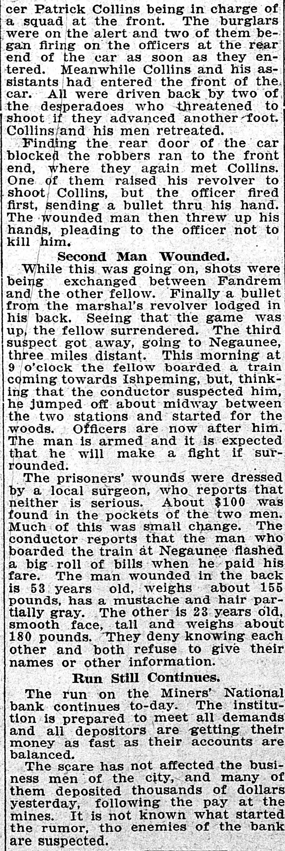 cer Patrick Collins being in charge of a squad at the front. The burglars were on the alert and two of them began firing on the officers at the rear end of the car as soon as they entered. Meanwhile Collins and his assistants had entered the front of the car. All were driven back by two of the desperadoes who threatened to shoot if they advanced another foot. Collins and his men retreated. Finding the rear door of the car blocked the robbers ran to the front end, where they again met Collins. One of them raised his revolver to shoot Collins, but the officer fired first, sending a bullet thru his hand. The wounded man then threw up his hands, pleading to the officer not to kill him. Second Man Wounded. While this was going on, shots were being exchanged between Fandrem and the other fellow. Finally a bullet from the marshal's revolver lodged in his back. Seeing that the game was up, the fellow surrendered. The third suspect got away, going to Negaunee, three miles distant. This morning at 9 o'clock the fellow boarded a train coming towards Ishpeming, but, thinking that the conductor suspected him, he jumped off about midway between the two stations and started for the woods. Officers are now after him. The man is armed and it is expected that he will make a fight if surrounded. The prisoners' wounds were dressed by a local surgeon, who reports that neither is serious. About $100 was found in the pockets of the two men. Much of this was small change. The conductor reports that the man who boarded the train at Negaunee flashed a big roll of bills when he paid his fare. The man wounded in the back is 53 years old, weighs about 155 pounds, has a mustache and hair partially gray. The other is 23 years old, smooth face, tall and weighs about 180 pounds. They deny knowing each other and both refuse to give their names or other information. Run Still Continues. The run on the Miners' National bank continues to-day. The institution is prepared to meet all demands and all depositors are getting their money as fast as their accounts are balanced. The scare has not affected the business men of the city, and many of them deposited thousands of dollars yesterday, following the pay at the mines. It is not known what started the rumor, tho enemies of the bank are suspected.
