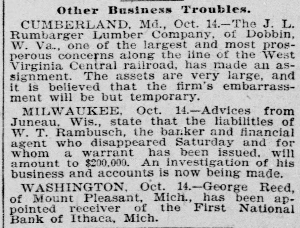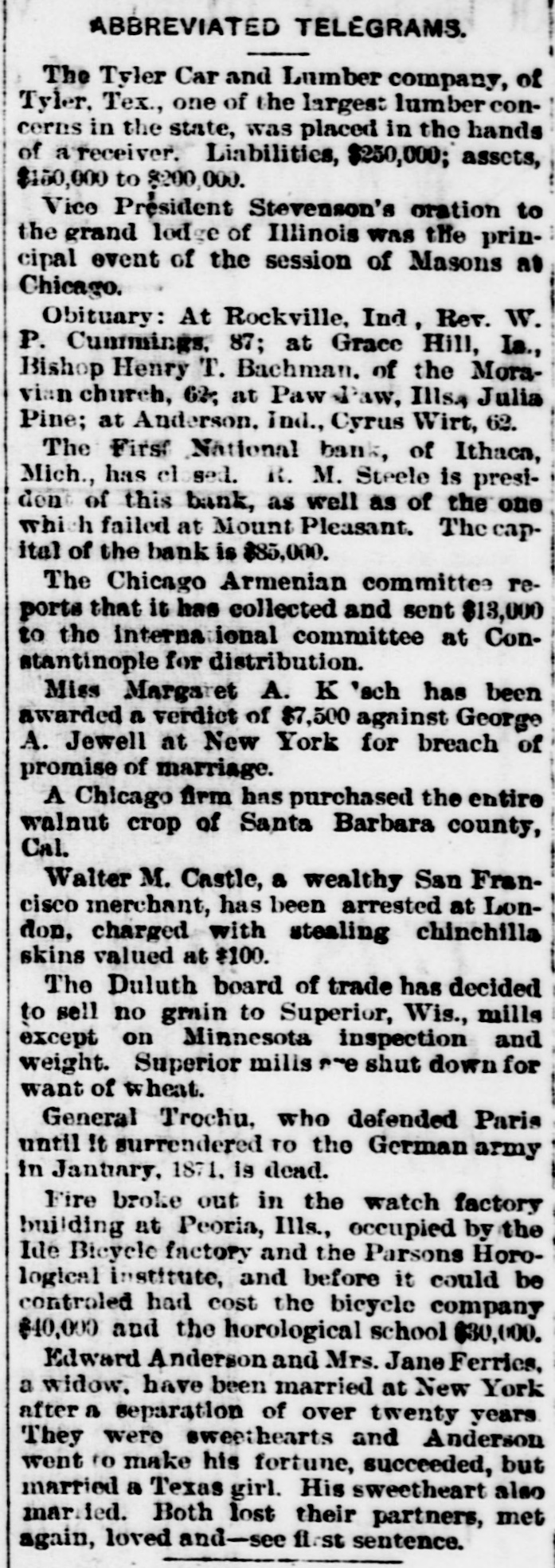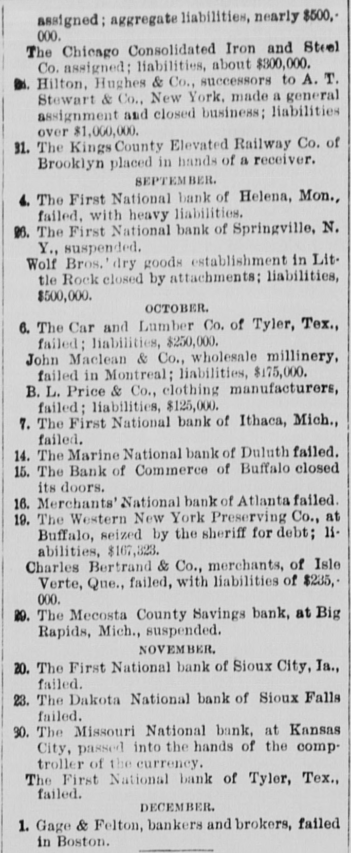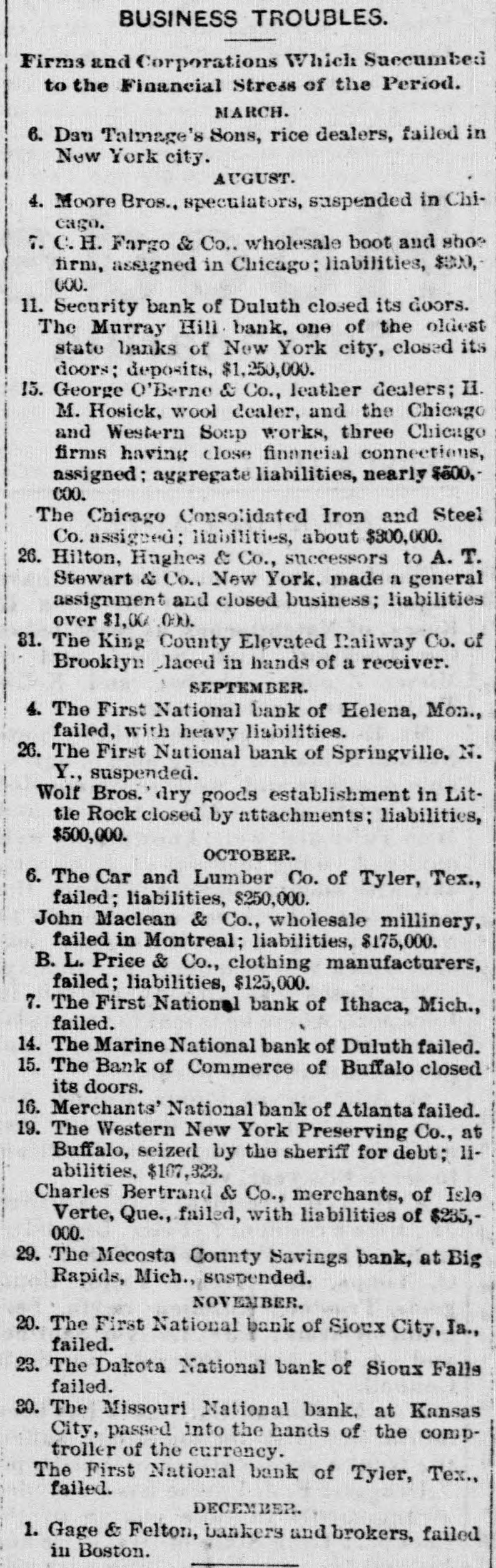 BUSINESS TROUBLES. Firms and Corporations Which Succumbed to the Financial Stress of the Period. MARCH. 6. Dan Taimage's Sons, rice dealers, failed in New York city. AUGUST. 4. Moore Bros., speculators, suspended in Chicago. 7. C.H. Fargo & Co., wholesale boot and shoe firm, assigned in Chicago: liabilities, $300, 000. 11. Security bank of Duluth closed its doors. The Murray Hill bank, one of the oldest state banks of New York city, closed its doors; deposits, $1,250,000. 15. George O'Berne & Co., leather dealers; II. M. Hosick, wool dealer, and the Chicago and Western Sonp works, three Chicago firms having close financial connections, assigned: aggregate liabilities, nearly $500,000. The Chicago Consolidated Iron and Steel Co. assigned; liabilities, about $300,000. 26. Hilton, Hughes & Co., successors to A. T. Stewart & Co., New York. made a general assignment and closed business; liabilities over $1,00 000. 31. The King County Elevated Railway Co. of Brooklyn laced in hands of a receiver. SEPTEMBER. 4. The First National bank of Helena, Mon., failed, with heavy liabilities. 26. The First National bank of Springville, N. Y., suspended. Wolf Bros. dry goods establishment in Little Rock closed by attachments; liabilities, $500,000. OCTOBER. 6. The Car and Lumber Co. of Tyler, Tex., failed; liabilities, $250,000. John Maclean & Co., wholesale millinery, failed in Montreal; liabilities, $175,000. B. L. Price & Co., clothing manufacturers, failed; liabilities, $125,000. 7. The First National bank of Ithaca, Mich., failed. 14. The Marine National bank of Duluth failed. 15. The Bank of Commerce of Buffalo closed its doors. 16. Merchants' National bank of Atlanta failed. 19. The Western New York Preserving Co., at Buffalo, seized by the sheriff for debt; liabilities, $107,323. Charles Bertrand & Co., merchants, of Isle Verte, Que., failed, with liabilities of $235,000. 29. The Mecosta County Savings bank, at Big Rapids, Mich., suspended. NOVEMBER. 20. The First National bank of Sioux City, Ia., failed. 23. The Dakota National bank of Sioux Falls failed. 30. The Missouri National bank, at Kansas City, passed into the hands of the comptroller of the currency. The First National bank of Tyler, Tex., failed. DECEMBER. 1. Gage & Felton, bankers and brokers, failed in Boston.
