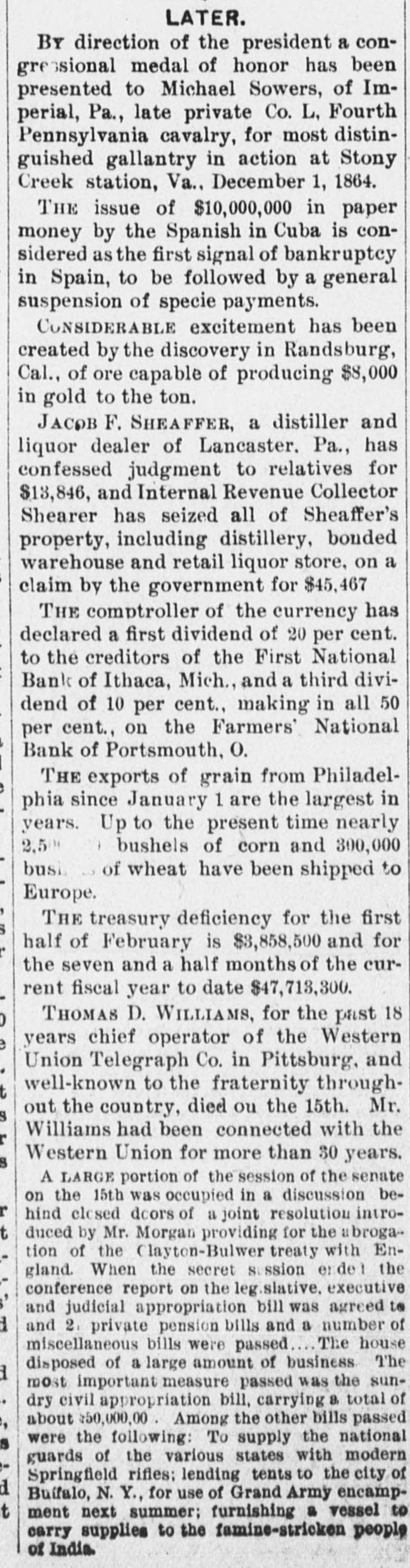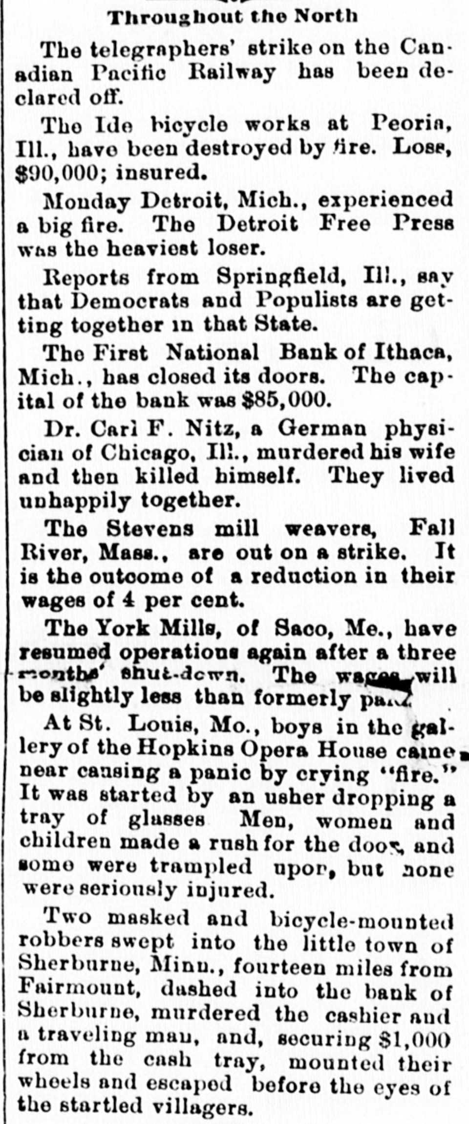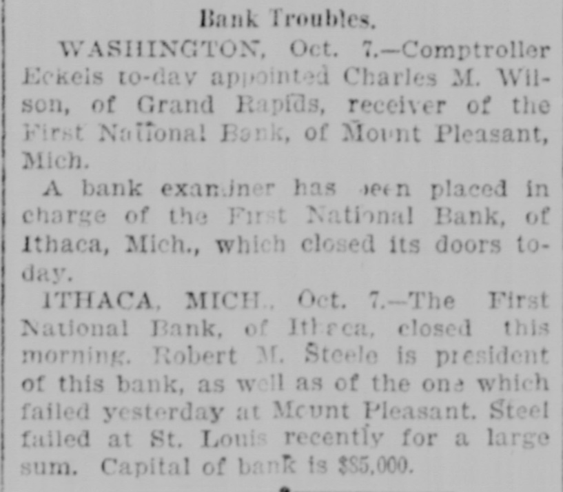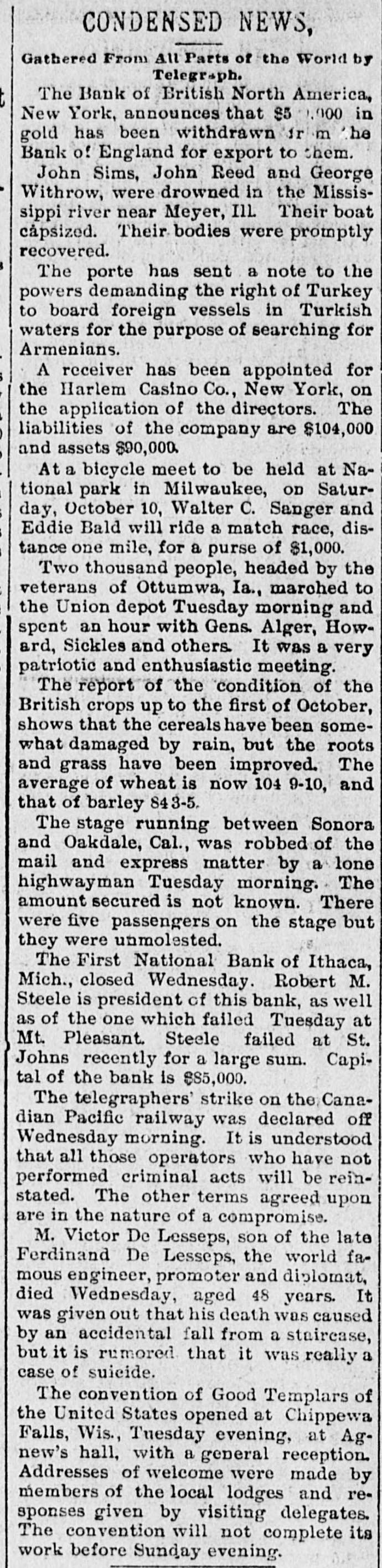 BUSINESS TROUBLES. Firms and Corporations Which Succumbed to the Financial Stress of the Period. MARCH. 6. Dan Taimage's Sons, rice dealers, failed in New York city. AUGUST. 4. Moore Bros., speculators, suspended in Chicago. 7. C.H. Fargo & Co., wholesale boot and shoe firm, assigned in Chicago: liabilities, $300, 000. 11. Security bank of Duluth closed its doors. The Murray Hill bank, one of the oldest state banks of New York city, closed its doors; deposits, $1,250,000. 15. George O'Berne & Co., leather dealers; II. M. Hosick, wool dealer, and the Chicago and Western Sonp works, three Chicago firms having close financial connections, assigned: aggregate liabilities, nearly $500,000. The Chicago Consolidated Iron and Steel Co. assigned; liabilities, about $300,000. 26. Hilton, Hughes & Co., successors to A. T. Stewart & Co., New York. made a general assignment and closed business; liabilities over $1,00 000. 31. The King County Elevated Railway Co. of Brooklyn laced in hands of a receiver. SEPTEMBER. 4. The First National bank of Helena, Mon., failed, with heavy liabilities. 26. The First National bank of Springville, N. Y., suspended. Wolf Bros. dry goods establishment in Little Rock closed by attachments; liabilities, $500,000. OCTOBER. 6. The Car and Lumber Co. of Tyler, Tex., failed; liabilities, $250,000. John Maclean & Co., wholesale millinery, failed in Montreal; liabilities, $175,000. B. L. Price & Co., clothing manufacturers, failed; liabilities, $125,000. 7. The First National bank of Ithaca, Mich., failed. 14. The Marine National bank of Duluth failed. 15. The Bank of Commerce of Buffalo closed its doors. 16. Merchants' National bank of Atlanta failed. 19. The Western New York Preserving Co., at Buffalo, seized by the sheriff for debt; liabilities, $107,323. Charles Bertrand & Co., merchants, of Isle Verte, Que., failed, with liabilities of $235,000. 29. The Mecosta County Savings bank, at Big Rapids, Mich., suspended. NOVEMBER. 20. The First National bank of Sioux City, Ia., failed. 23. The Dakota National bank of Sioux Falls failed. 30. The Missouri National bank, at Kansas City, passed into the hands of the comptroller of the currency. The First National bank of Tyler, Tex., failed. DECEMBER. 1. Gage & Felton, bankers and brokers, failed in Boston.