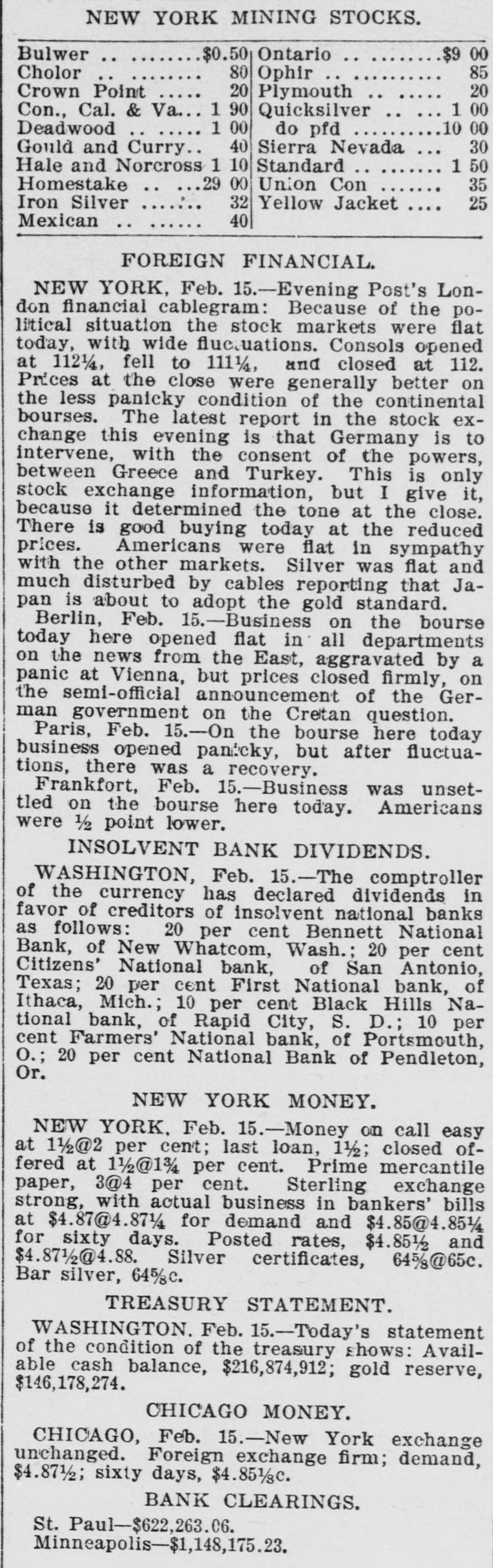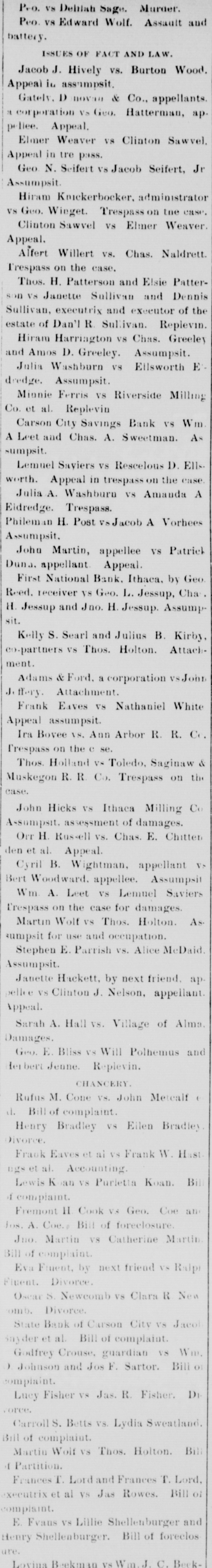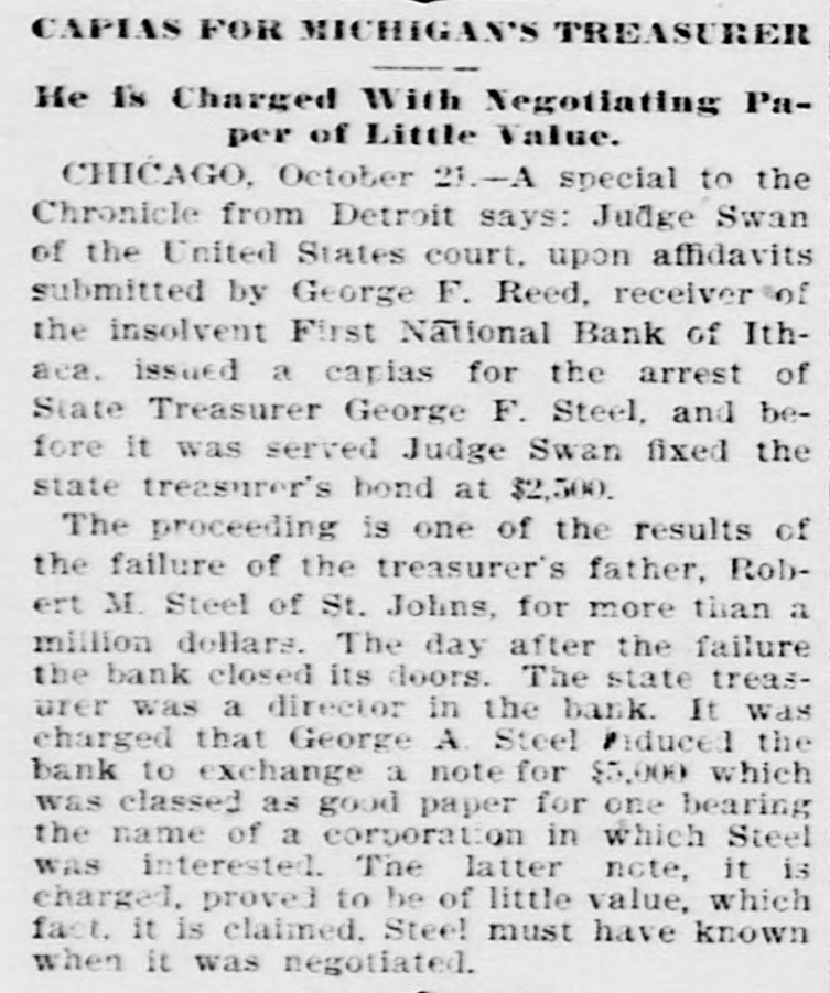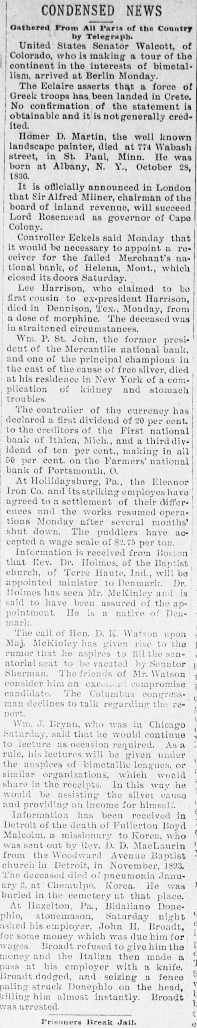 BUSINESS TROUBLES. Firms and Corporations Which Succumbed to the Financial Stress of the Period. MARCH. 6. Dan Taimage's Sons, rice dealers, failed in New York city. AUGUST. 4. Moore Bros., speculators, suspended in Chicago. 7. C.H. Fargo & Co., wholesale boot and shoe firm, assigned in Chicago: liabilities, $300, 000. 11. Security bank of Duluth closed its doors. The Murray Hill bank, one of the oldest state banks of New York city, closed its doors; deposits, $1,250,000. 15. George O'Berne & Co., leather dealers; II. M. Hosick, wool dealer, and the Chicago and Western Sonp works, three Chicago firms having close financial connections, assigned: aggregate liabilities, nearly $500,000. The Chicago Consolidated Iron and Steel Co. assigned; liabilities, about $300,000. 26. Hilton, Hughes & Co., successors to A. T. Stewart & Co., New York. made a general assignment and closed business; liabilities over $1,00 000. 31. The King County Elevated Railway Co. of Brooklyn laced in hands of a receiver. SEPTEMBER. 4. The First National bank of Helena, Mon., failed, with heavy liabilities. 26. The First National bank of Springville, N. Y., suspended. Wolf Bros. dry goods establishment in Little Rock closed by attachments; liabilities, $500,000. OCTOBER. 6. The Car and Lumber Co. of Tyler, Tex., failed; liabilities, $250,000. John Maclean & Co., wholesale millinery, failed in Montreal; liabilities, $175,000. B. L. Price & Co., clothing manufacturers, failed; liabilities, $125,000. 7. The First National bank of Ithaca, Mich., failed. 14. The Marine National bank of Duluth failed. 15. The Bank of Commerce of Buffalo closed its doors. 16. Merchants' National bank of Atlanta failed. 19. The Western New York Preserving Co., at Buffalo, seized by the sheriff for debt; liabilities, $107,323. Charles Bertrand & Co., merchants, of Isle Verte, Que., failed, with liabilities of $235,000. 29. The Mecosta County Savings bank, at Big Rapids, Mich., suspended. NOVEMBER. 20. The First National bank of Sioux City, Ia., failed. 23. The Dakota National bank of Sioux Falls failed. 30. The Missouri National bank, at Kansas City, passed into the hands of the comptroller of the currency. The First National bank of Tyler, Tex., failed. DECEMBER. 1. Gage & Felton, bankers and brokers, failed in Boston.