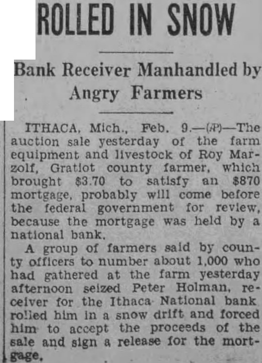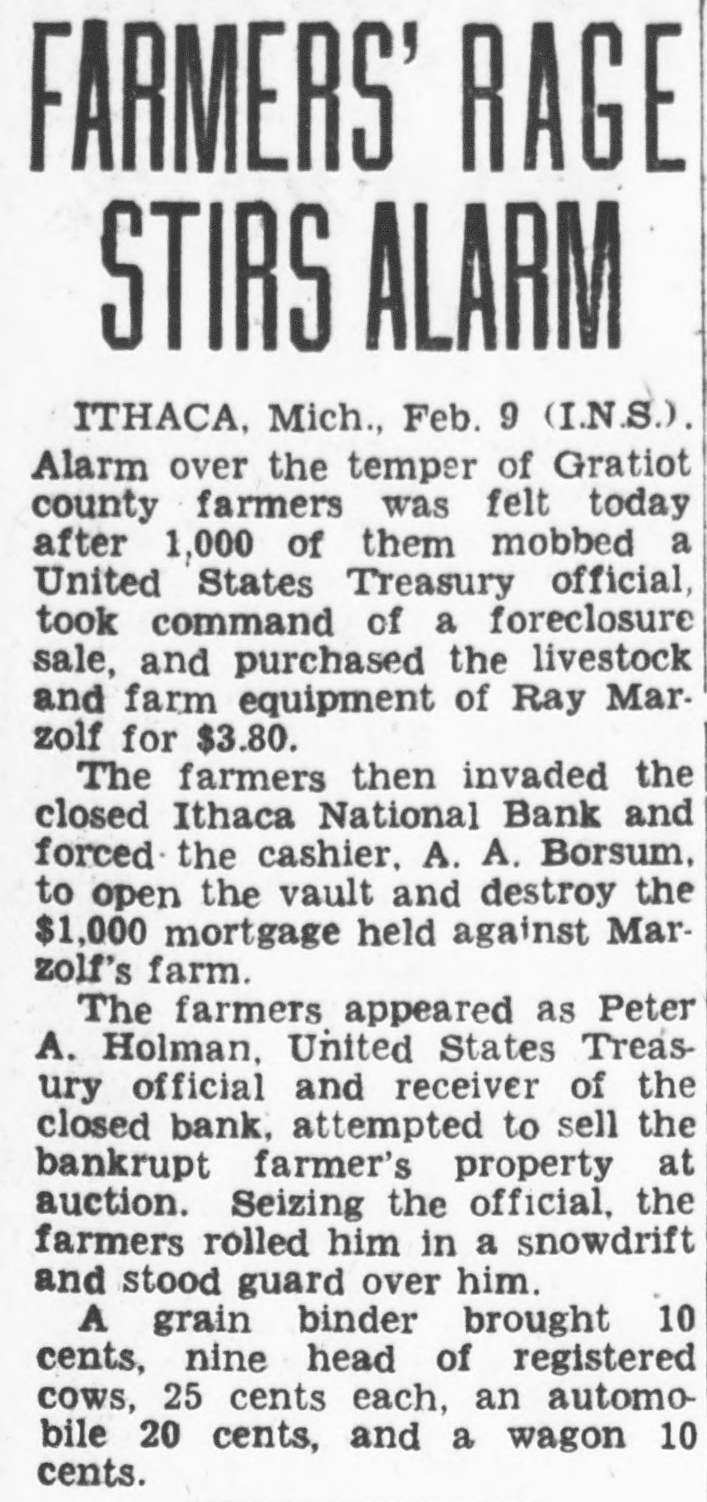 FARMERS' RAGE STIRS ALARM ITHACA, Mich., Feb. 9 (I.N.S.). Alarm over the temper of Gratiot county farmers was felt today after 1,000 of them mobbed a United States Treasury official, took command of a foreclosure sale, and purchased the livestock and farm equipment of Ray Marzolf for $3.80. The farmers then invaded the closed Ithaca National Bank and forced the cashier, A. A. Borsum, to open the vault and destroy the $1,000 mortgage held against Marzolf's farm. The farmers appeared as Peter A. Holman, United States Treasury official and receiver of the closed bank, attempted to sell the bankrupt farmer's property at auction. Seizing the official, the farmers rolled him in a snowdrift and stood guard over him. A grain binder brought 10 cents, nine head of registered cows, 25 cents each, an automobile 20 cents, and a wagon 10 cents.