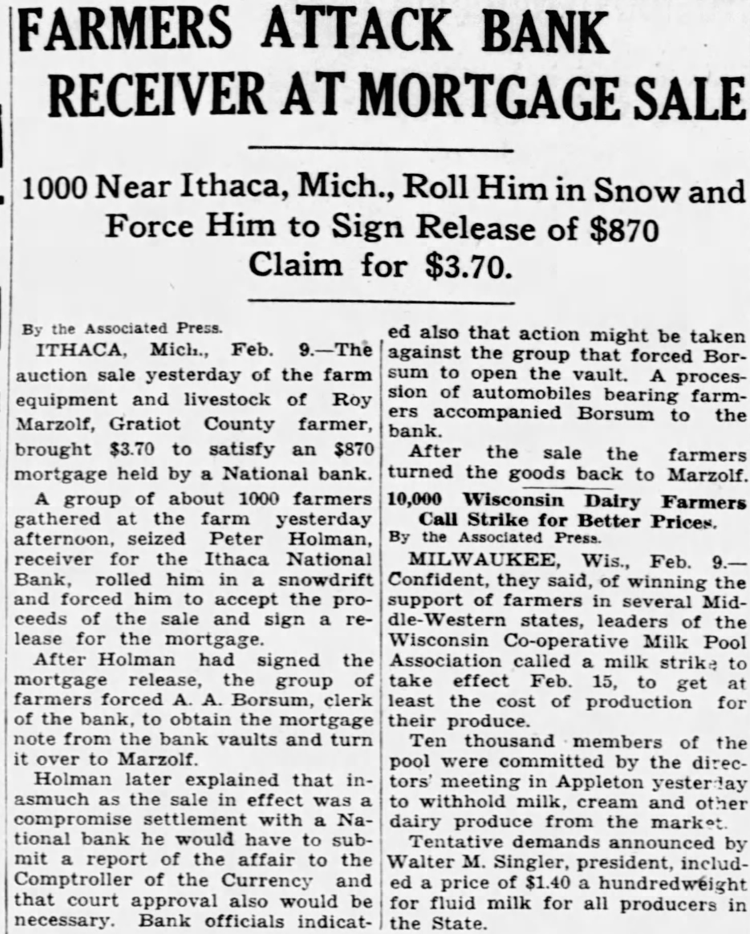 Associated Press. ITHACA, Mich., Feb. auction sale yesterday of the farm equipment and livestock of Roy Marzolf, Gratiot County farmer, brought $3.70 to satisfy an $870 mortgage held by National bank. group of about 1000 farmers gathered at the farm yesterday afternoon, seized Peter Holman, receiver for the Ithaca National Bank, rolled him snowdrift and forced him to accept the ceeds of the sale and sign for the mortgage. After Holman had signed the mortgage release, the group of farmers forced clerk of the bank, obtain the note from the bank vaults and turn over to Marzolf. Holman later explained that asmuch the sale in effect compromise settlement with tional bank he would have to subreport the affair to the Comptroller of the Currency and that court approval also would be Bank officials indicat- ed also that action might be taken against the group that forced Borsum open the vault. procession of bearing farmaccompanied Borsum to the bank. After the sale the farmers turned the goods back to Marzolf. 10,000 Wisconsin Dairy Farmers Call Strike for Better Prices. Associated Press. Wis., Feb. Confident, they said, of the support of farmers in several Midstates, of the Wisconsin Co-operative Milk Pool Association called milk strike take effect Feb. 15, to get least the cost of production for their produce. Ten thousand members of the pool were committed by the directors' meeting in Appleton to withhold milk, cream and other dairy produce from the Tentative demands announced Walter Singler, president, includprice of for fluid milk for all producers in the State.