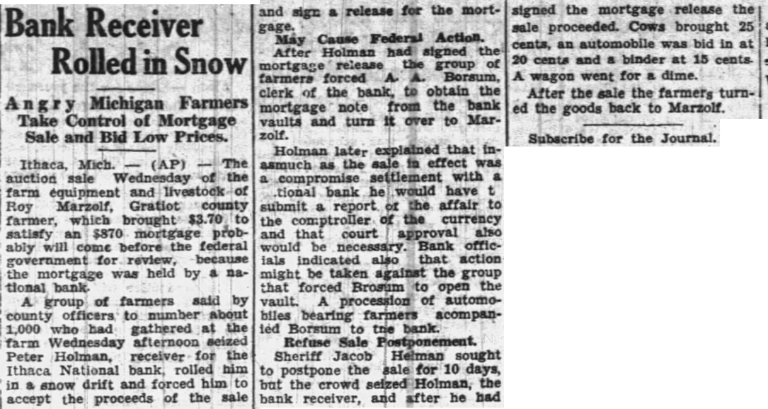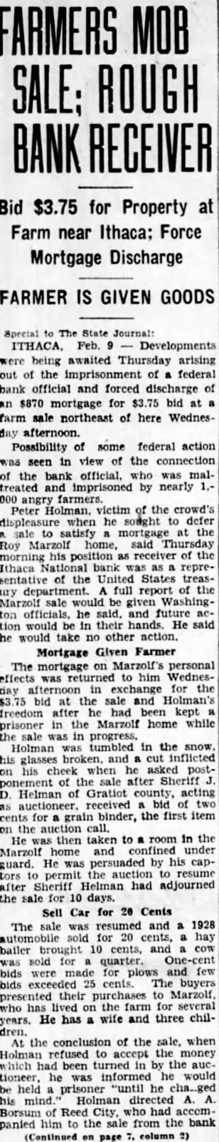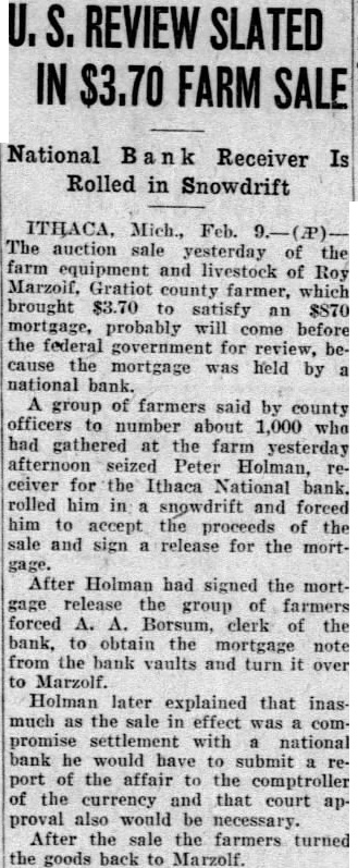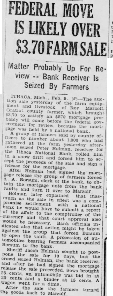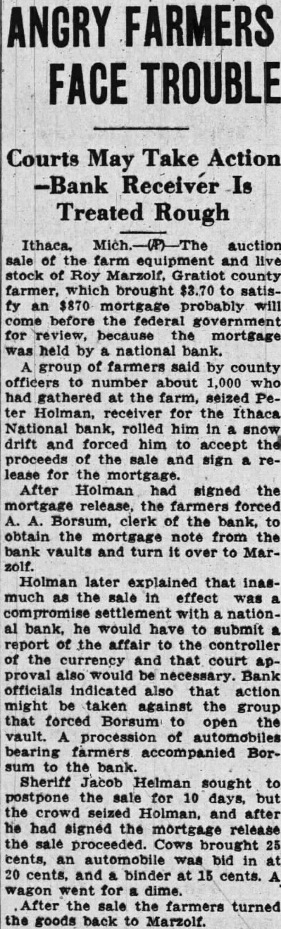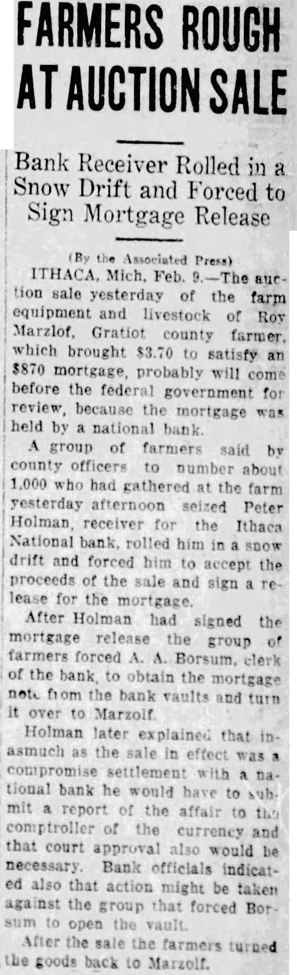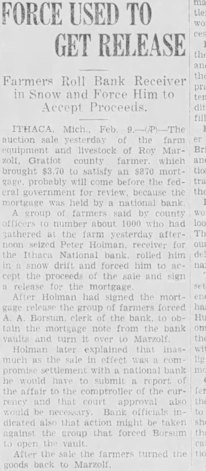 Courts May Take Action -Bank Receiver Is Treated Rough sale of the farm equipment and live stock of Roy Marzolf, Gratiot county farmer, which brought $3.70 to satisfy an $870 mortgage probably will come before the federal government for review, because the mortgage was held by national bank. A group of farmers said by county officers to number about 1,000 who had gathered at the farm, seized Peter Holman, receiver for the Ithaca National bank, rolled him in a snow drift and forced him to accept the proceeds of the sale and sign a release for the mortgage. After Holman had signed the mortgage release, the farmers forced A. A. Borsum, clerk of the bank, to obtain the mortgage note from the bank vaults and turn it over to Marzolf. Holman later explained that inasmuch as the sale in effect was a compromise settlement with national bank, he would have to submit a report of the affair to the controller of the currency and that court approval also would be necessary. Bank officials indicated also that action might be taken against the group that forced Borsum to open the vault. A procession of automobiles bearing farmers accompanied Borsum to the bank. Sheriff Jacob Helman sought to postpone the sale for 10 days, but the crowd seized Holman, and after he had signed the mortgage release the sale proceeded. Cows brought 25 cents, an automobile was bid in at 20 cents, and a binder at 15 cents. A wagon went for dime. After the sale the farmers turned the goods back to Marzolf.