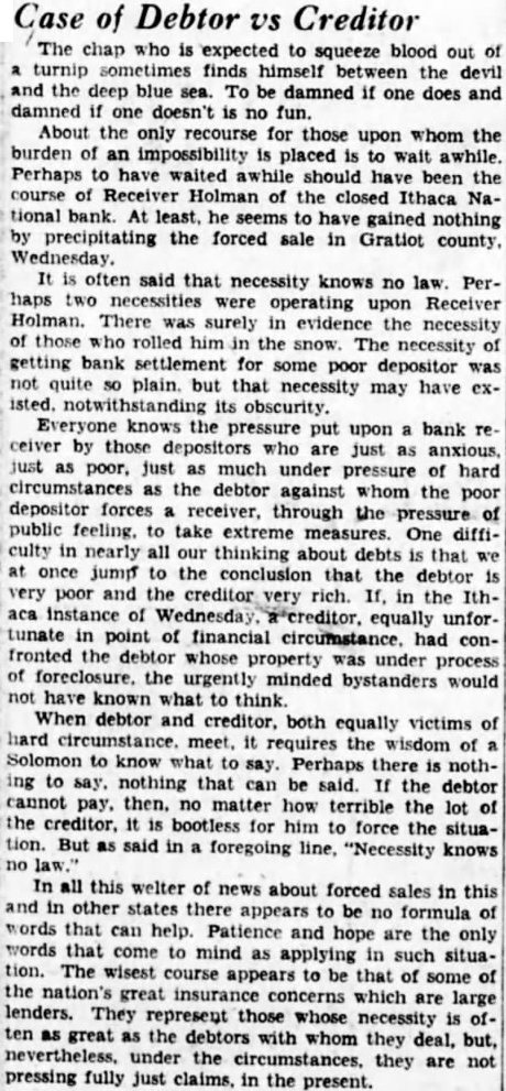 Case of Debtor Creditor chap who is expected to squeeze blood out of turnip sometimes finds himself the and the deep blue sea. To damned if one does and damned one doesn't no About the only recourse for the upon whom burden of an impossibility placed awhile. wait Perhaps have waited awhile should been the course Holman the closed Ithaca National bank. At least, seems have gained nothing precipitating the forced sale in Gratiot Wednesday. It often said that necessity knows no law. Perhaps two necessities upon Receiver Holman. There surely evidence the necessity those rolled him the snow. The necessity getting bank settlement for some poor was not quite plain. but that necessity have may exits obscurity. pressure upon bank ceiver those depositors are just just just much under pressure of hard circumstances the debtor against whom the poor depositor forces receiver, through the of public feeling. extreme measures. One difficulty nearly thinking about debts that once jump to the conclusion that the debtor poor and the in the Ithaca instance equally unfortunate point of financial had confronted whose property under process of foreclosure. the urgently minded bystanders would have known what think. When debtor equally victims circumstance. meet, the wisdom of Perhaps there nothnothing that said. the debtor cannot pay. then. no how terrible the lot it for him force the situation. But as said foregoing line, "Necessity knows In all this welter of news about forced sales in this and in other states there appears be no formula words that can help. Patience are the only words that come to mind applying such situaThe wisest course appears that some of the nation's great insurance which are large lenders. They represent those whose as great the debtors whom deal, under the they are pressing fully just claims, in the present.