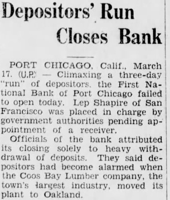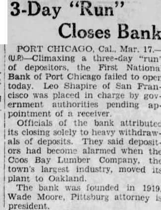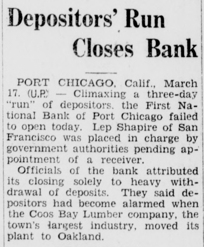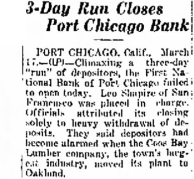 To Appoint Receiver remain in charge of until the comptroller of currency names receiver,' said this morning. do when that will be. was to the instituion as reof the directors adopting asking such action and heavy withwrawals Announcement of the impendabandonment of the Coos Bay Company's plant and its to an Oakland site infear among depositors of an official said of depositors three days ago. Every made to stop it through demands but the point eventually reached where money was exhausted.' Confidence Holds Businessmen of Port Chicago optimistic in spite of closing. They said that might have been avertsome word been forthcomfrom Armstrong Cork Comand Inc. definite date for starting of their projected $4, plants. would have supplied the confidence" business"There have been that the companies are not the plants here and that to the uneasiness. that Port Chicago itself in an industrial the bank's closing Van Winkle, presthe Chamber of Com- that he had checked the lineoleum compadecided not to build and received information that no conform the It was rumor. out in other that quarters seemed unlikely since companies have alrealy more than in of the sites. $283,000 Resources declared that the fact government has taken bank is "no deterrent revival. last report of M. Pacini, of the institution, showed resources of