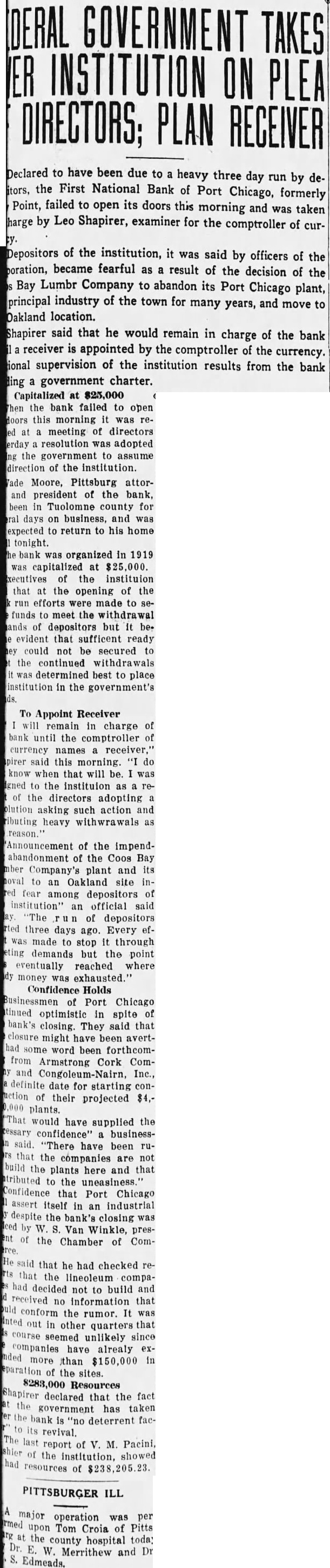 Capitalized at $25,000 the bank failed to open this morning it was remeeting of directors resolution was adopted the government to assume of the institution. Moore, Pittsburg attorpresident of the bank, in Tuolomne county for days on business, and was to return to his home tonight. organized in 1919 capitalized at $25,000. of the instituion at the opening of the efforts were made to seto meet the withdrawal of depositors but it be. evident that sufficent ready could not be secured the continued withdrawals determined best to place institution in the government's