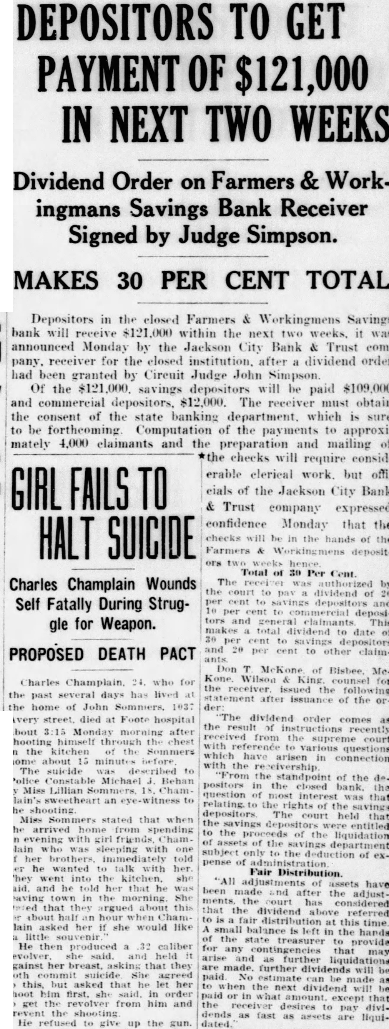 DEPOSITORS TO GET PAYMENT OF $121,000 IN NEXT TWO WEEKS Dividend Order on Farmers & Workingmans Savings Bank Receiver Signed by Judge Simpson. MAKES 30 PER CENT TOTAL Depositors in the closed Farmers & Workingmens Savings bank will receive $121,000 within the next two weeks, it was announced Monday by the Jackson City Bank & Trust company. receiver for the closed institution, after a dividend order had been granted by Circuit Judge John Simpson. Of the $121,000. savings depositors will be paid $109,000 and commercial depositors, $12,000. The receiver must obtain the consent of the state banking department. which is sure to be fortheoming Computation of the payments to approximately 4,000 elaimants and the preparation mailing of *the checks require considerable clerical work. but offiGIRL FAILS TO eials of the Jackson City Bank & Trust company expressed confidence Monday that the HALT SUICIDE be in the hands of the Farmers & ors Total of 30 Per Cent. Charles Champlain Wounds The by the court to pay dividend of Self Fatally During Strug- depositors and deposigle for Weapon. claimants makes dividend to date 30 depositors and 20 to other PROPOSED DEATH PACT claimDon McKone of harles for for the the several has after of the orthe home of John "The dividend order comes as the recently from the supreme court with which arisen connection with the "From the standpoint of the positors in the closed bank. question of was relating to the the depositors. held the savings entitled to the the the subject the deduction of expense Fair Distribution "All have and after the considered the dividend referred to fair distribution at in the hands of the provide for any contingencies that further are further dividends be paid be made as the desires pay dividends as (ast as assets liqui-