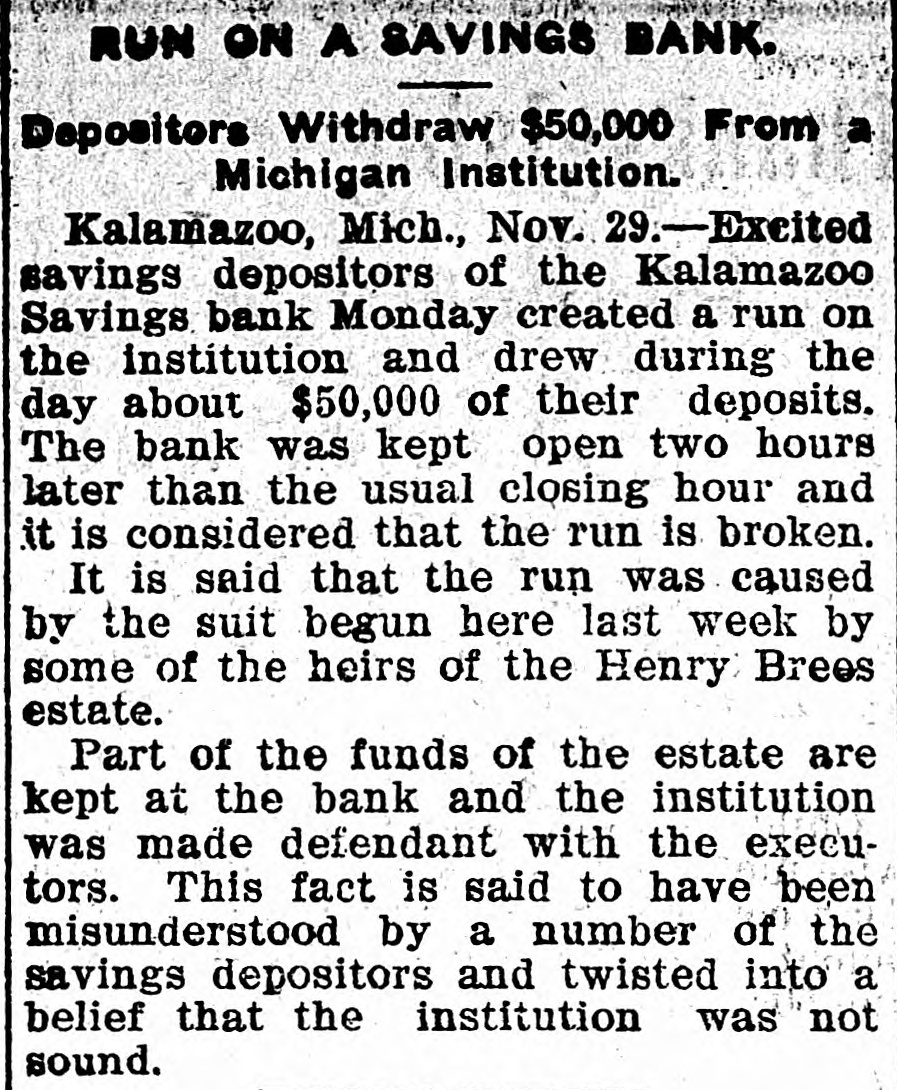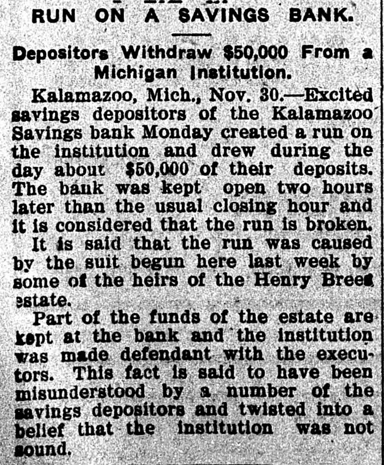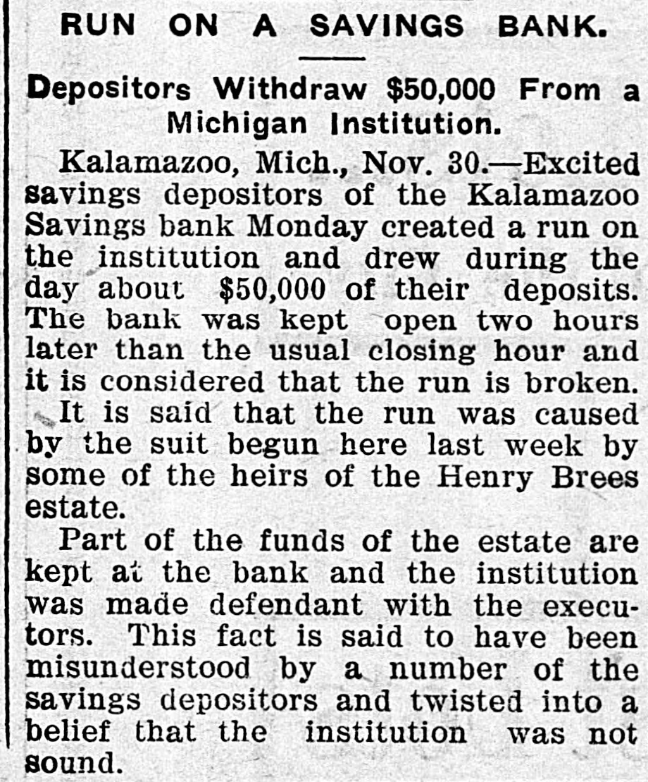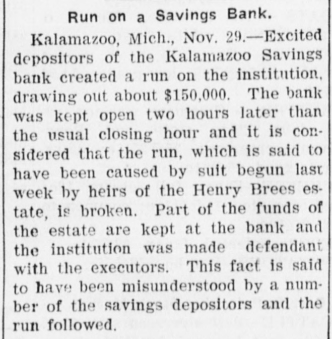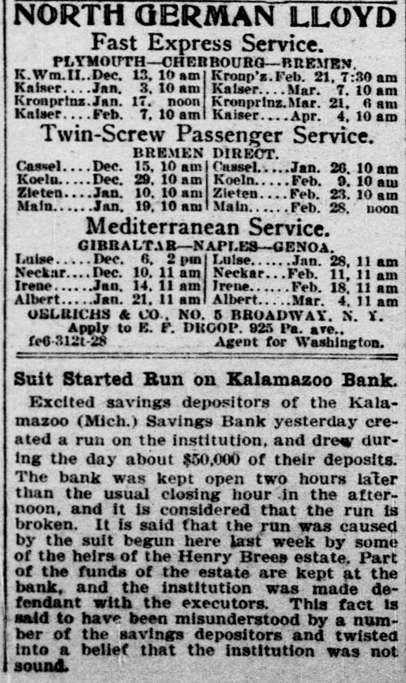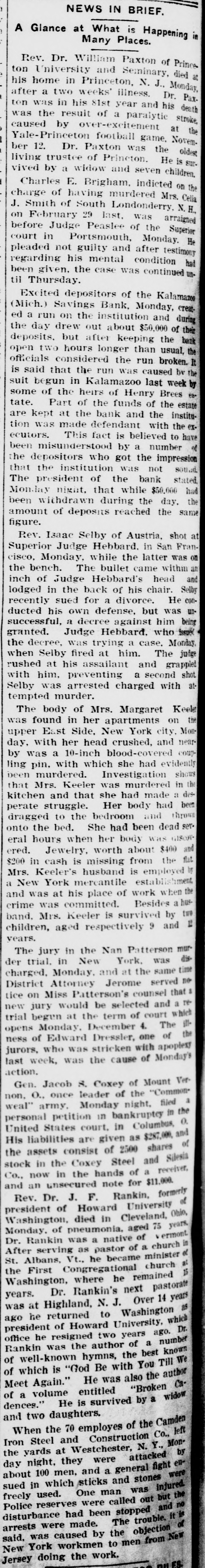 NEWS IN BRIEF. Glance at What is Happening in Many Places. Rev. Dr. William Paxton of Prince. n University and Seminary, died at $ home in Princeton, N. J., Monday, ter a two weeks' illness. Dr. Pax. ni was in his 81st year and his death is the result of a paralytic stroke. used by over-excitement at the le-Princeton football game. Novemr 12. Dr. Paxton was the oldest ring trustee of Princton. He is surchildren. seven pur U Aq per Charles E. Brigham. indicted on the arge of having murdered Mrs. Celia Smith of South Londonderry, N.H., February 29 last. was arraigned fore Judge Peaslee of the Superior urt in Portsmouth, Monday. He eaded not guilty and after testimony garding his mental condition had en given. the case was continued unThursday. Excited depositors of the Kalamazoo lich.) Savings Bank, Monday, creata run on the institution and during mays JO 000'09$ a no deem Aep a posits. but after keeping the bank II the Tensn than hours OM1 uo icials considered the run by broken. the said that the run was caused it begun in Kalamazoo last week by me of the heirs of Henry Brees este. Part of the funds of the estate institue kept at the bank and the the exwas made defendant with have n en utors. This fact misunderstood is by a believed to number impression of e depositors who got the sound. at the institution was not stated he president of the bank had onday night, that while $50,000 the en withdrawn during the day. same mount of deposits reached the Rev. ure. Isaac Selby of Austria, shot Fran- at perior Judge Hebbard. in San was on Monday, while the latter within an e sco, bench. The bullet came head and ch dged of cently in the sued Judge for back a of his Hebbard's divorce. chair. He was un- con- Selby cted his own defense, but him being e anted. ccessful, decree, a was Judge decree trying a Hebbard. against case. The who issued Monday, judge Selby fired at him. grappled en shed at his assailant and shot th him, preventing a second with atcharged arreeste SEM 191 1 The body of Mrs. Margaret on the Keele found in her apartments Monis y, per with East her Side. head New York crushed, blood-covered and city. coup- neara 10-inch evidently g was pin, with which she had shows murdered. Investigation the at en tchen Mrs. and struggle. that Keeler she was Her had body made murdered had a in been thrown des-Aas deed pur moorpaq any 01 passe the bed. She had been GISCOV al to hours when her body was $400 and Jewelry, worth about the flat in mong st cash 11! pa 00 Keeler's husband is establishment rS. New York mercantile when the -sny E Jo place at SUM d was committed. Besides by two II pue paaraans 6 SI Exelet SW 1 nd. ildren, aged respectively ars. jury in the Nan Patterson dis- mur1° e The on strict arged, trial. in Miss Monday. Attorney New be and Patterson's at Jerome York. selected the counsel was and same served a that re- no $ time which w al ss ens of jury begun who at Monday. Edward would was the term stricken Dressler, December of 4. of with one court of The ill- Monday's apoplexy the canse am SUM meak *S.10.1 -19A E am patts 74814 am 10 Jo TOXOO teader 'S aguo "O thon Gen. 'u 18 eal" army. Monday bankruptey in jo esident up died e is ., d ock Rev. nited an in rsonal now assets Dr. in the liabilities States J. the petition are unsecured consist F. Coxey in court, of Howard in note hands given Steel 2500 of as for a Rankin, and Cleveland, University shares $287,000, $11,000. Columbus, of O. formerly Ohio, receiver, and Silesia of 15