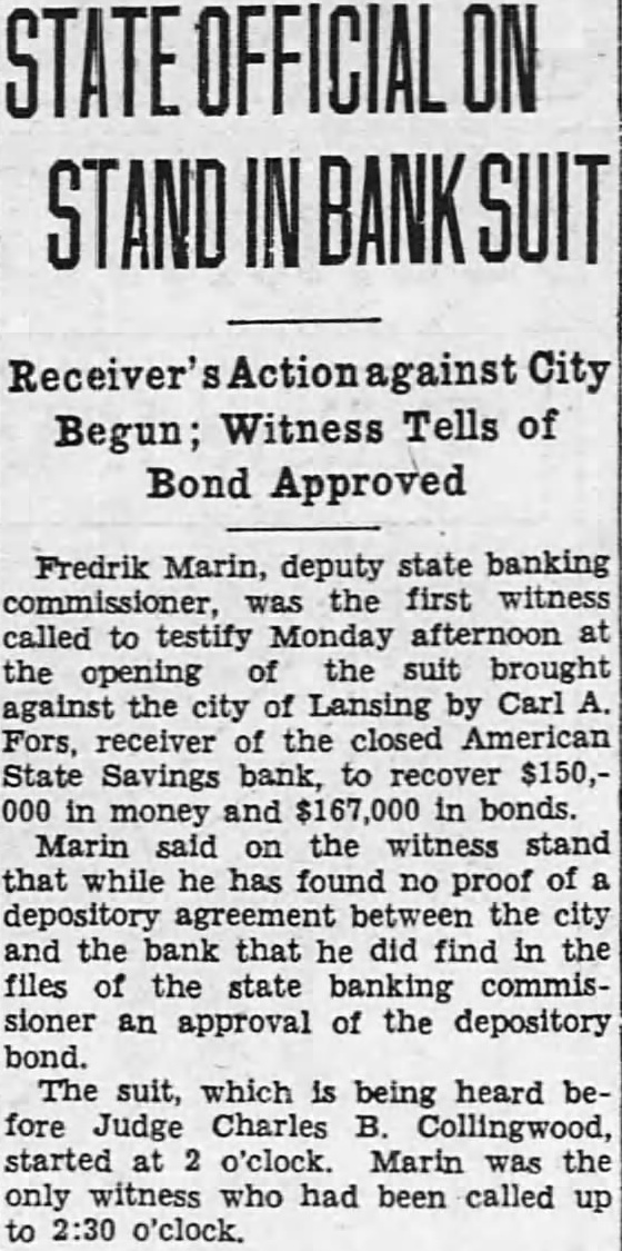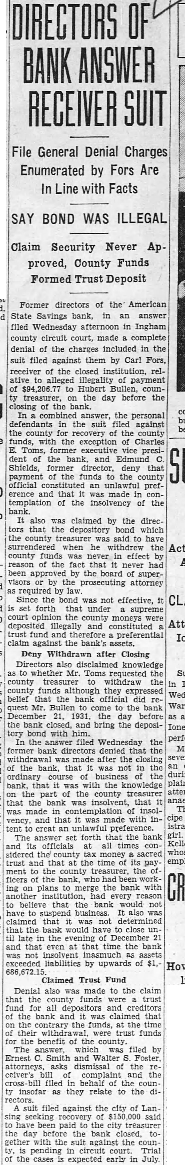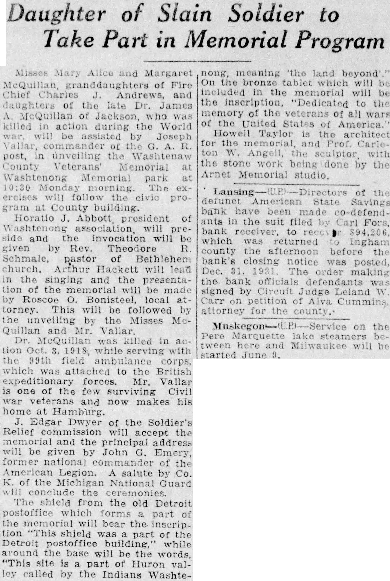 Daughter of Slain Soldier to Take Part in Memorial Program Misses Mary Alice and Margaret McQuillan, granddaughters of Fire Chief Charles J. Andrews, and daughters of the late Dr. James A. McQuillan of Jackson, who was killed in action during the World will be assisted by Joseph commander of the G. A. R. post, in unveiling the Washtenaw County Veterans' Memorial at Washtenong Memorial Monday The ercises will follow the civic pro. gram at County building. Horatio J. Abbott president of will side and the invocation will be given by Rev. Theodore Schmale, pastor of Bethlehem church. Arthur Hackett will lead in the singing and the presentation of the memorial be made by Roscoe O. Bonisteel, local torney. This will be followed by the unveiling by the Misses Mc. Quillan and Mr. Vallar. Dr. McQuillan was killed in tion Oct serving with the 39th field which was to the British forces. Mr. Vallar is one of the surviving Civil and now makes his home at Edgar Dwyer of the Soldier's Relief commission will accept the memorial and the principal address will be given by John G. Emery former of Legion. A salute by Co. K. of the Michigan National Guard will conclude the The shield from the old Detroit postoffice which forms part of the memorial will bear the inscription shield was part of the Detroit postoffice building. while around the base will be the words, "This site is part of Huron valley called by the Indians Washte- nong, meaning land beyond On the bronze tablet which will in the memorial will the inscription, "Dedicated to the memory of the veterans of all wars of the United States of America. Howell Taylor is the architect for the and Prof. ton W. Angell, the sculptor with the stone work being by the Arnet Memorial studio, Lansing of the defunct American Savings bank have been made in the suit filed Carl bank to which was returned Ingham county the afternoon the closing notice Dec. The order the bank officials signed by Judge Leland Carr petition of Alva for the county. on Pere Marquette tween here Milwaukee be June 9.