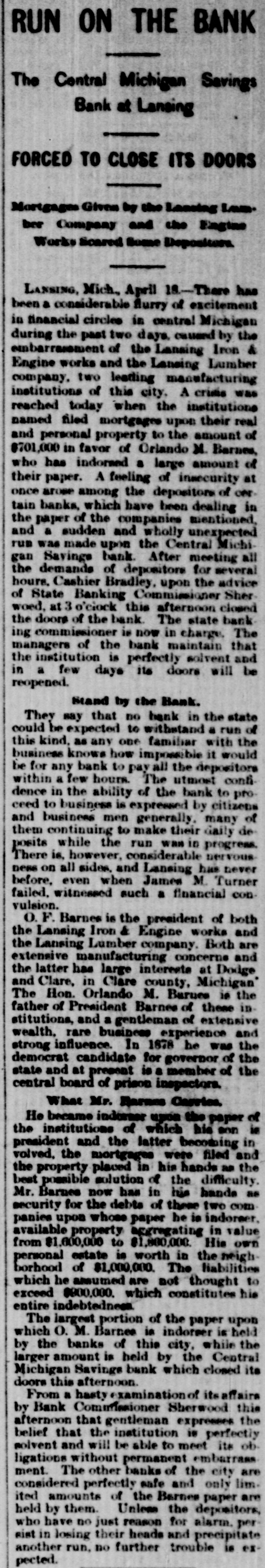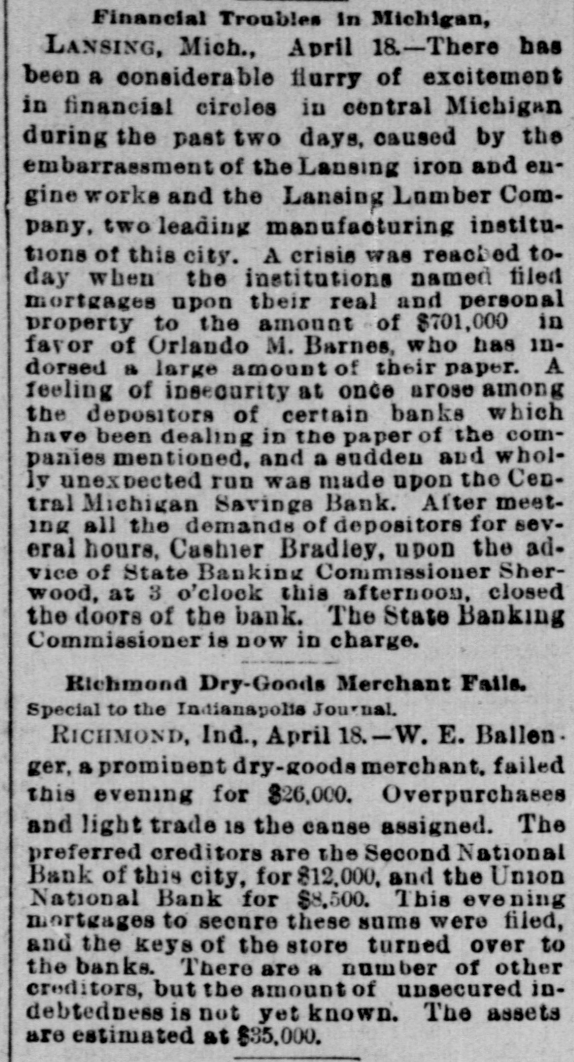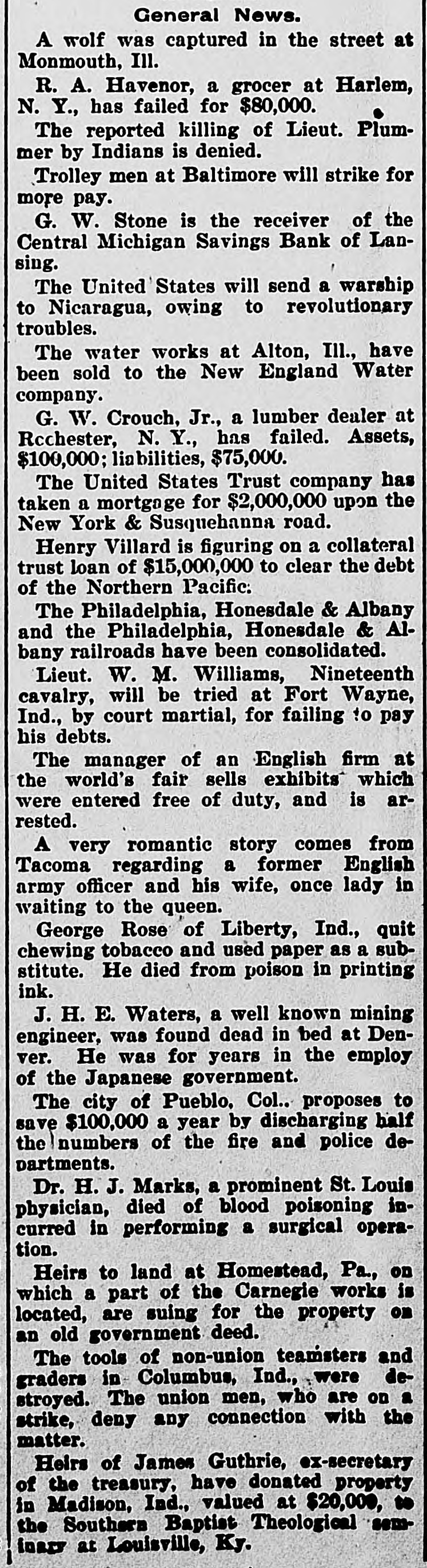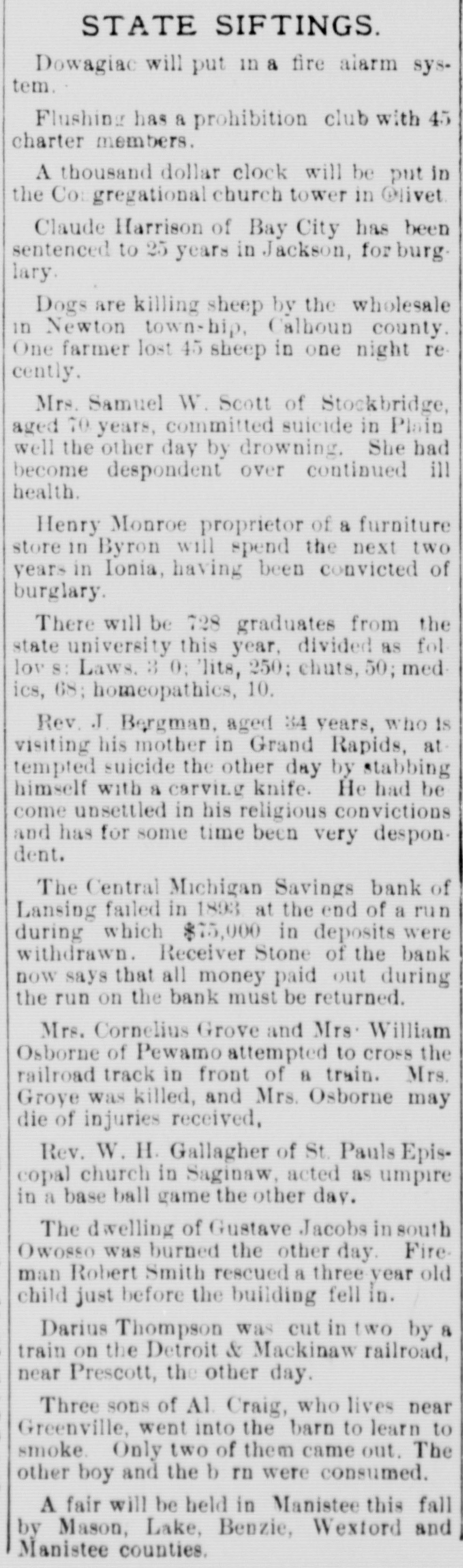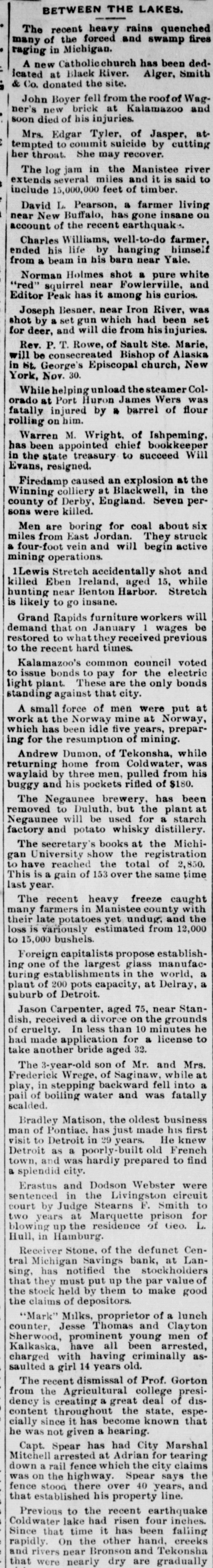 BETWEEN THE LAKES. The recent heavy rains quenched many of the forced and swamp fires raging in Michigan. A new Catholicchurch has been dedicated at Black River. Alger, Smith & Co. donated the site. John Boyer fell from the roof of Wagner's new brick at Kalamazoo and soon died of his injuries. Mrs. Edgar Tyler, of Jasper, attempted to commit suicide by cutting her throat. She may recover. The log jam in the Manistee river extends several miles and it is said to include 15,000,000 feet of timber. David L. Pearson, a farmer living near New Buffalo, has gone insane on account of the recent earthquak... Charles Williams, well-to-do farmer, ended his life by hanging himself from a beam in his barn near Yale. Norman Holmes shot a pure white "red" squirrel near Fowlerville, and Editor Peak has it among his curios. Joseph Besner, near Iron River, was shot by a set gun which had been set for deer, and will die from his injuries. Rev. P. T. Rowe, of Sault Ste. Marie, will be consecreated Bishop of Alaska in St. George's Episcopal church, New York, Nov. 30. While helping unload the steamer Colorado at Port Huron James Wers was fatally injured by a barrel of flour rolling on him. Warren M. Wright, of Ishpeming, has been appointed chief bookkeeper in the state treasury to succeed Will Evans, resigned. Firedamp caused an explosion at the Winning colliery at Blackwell, in the county of Derby, England. Seven persons were killed. Men are boring for coal about six miles from East Jordan. They struck a four-foot vein and will begin active mining operations. 1Lewis Stretch accidentally shot and killed Eben Ireland, aged 15, while hunting near Benton Harbor. Stretch is likely to go insane. Grand Rapids furniture workers will demand that on January 1 wages be restored to what they received previous to the recent hard times. Kalamazoo's common council voted to issue bonds to pay for the electric light plant. These are the only bonds standing against that city. A small force of men were put at work at the Norway mine at Norway, which has been idle five years, preparing for the resumption of mining. Andrew Dumon, of Tekonsha, while returning home from Coldwater, was waylaid by three men, pulled from his buggy and his pockets rifled of $180. The Negaunee brewery, has been removed to Duluth, but the plant at Negaunee will be used for a starch factory and potato whisky distillery. The secretary's books at the Michigan University show the registration to have reached the total of 2,850. This is a gain of 153 over the same time last year. The recent heavy freeze caught many farmers in Manistee county with their late potatoes yet undug, and the loss is variously estimated from 12,000 to 15,000 bushels. Foreign capitalists propose establishing one of the largest glass manufacturing establishments in the world, a plant of 200 pots capacity, at Delray, a suburb of Detroit. Jason Carpenter, aged 75, near Standish, received a divorce on the grounds of cruelty. In less than 10 minutes he had made application for a license to take another bride aged 32. The 3-year-old son of Mr. and Mrs. Frederick Wrege, of Saginaw, while at play, in stepping backward fell into a pail of boiling water and was fatally scalded. Bradley Matison, the oldest business man of Pontiac. has just made his first visit to Detroit in 29 years. He knew Detroit as a poorly-built old French town, and was hardly prepared to find a splendid city. Erastus and Dodson Webster were sentenced in the Livingston circuit court by Judge Stearns F. Smith to two years at Marquette prison for blowing up the residence of Geo. L. Hull, in Hamburg. Receiver Stone, of the defunct Central Michigan Savings bank, at Lansing, has notified the stockholders that they must put up the par value of the stock held by them to make good the claims of depositors. "Mark" Milks, proprietor of a lunch counter, Jesse Thomas and Clayton Sherwood, prominent young men of Kalkaska, have all been arrested, charged with having criminally assaulted a girl 14 years old. The recent dismissal of Prof. Gorton from the Agricultural college presidency is creating a great deal of discontent throughout the state, especially since it has become known that he was not given a hearing. Capt. Spear has had City Marshal Mitchell arrested at Adrian for tearing down a rail fence which the city claims was on the highway. Spear says the fence stood there over 40 years, and that established his property line.