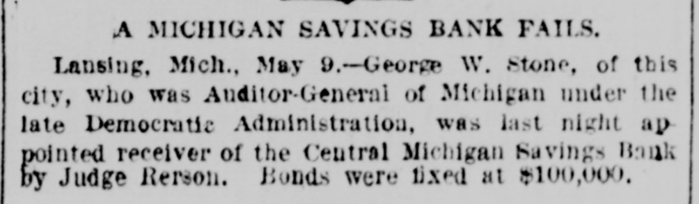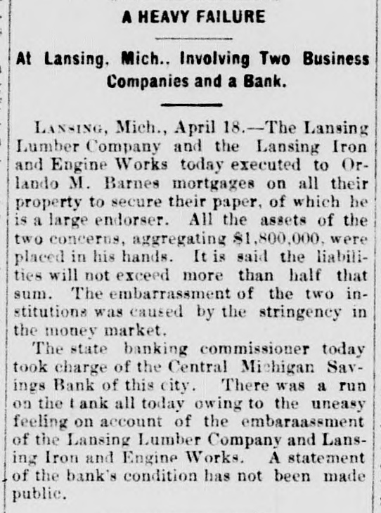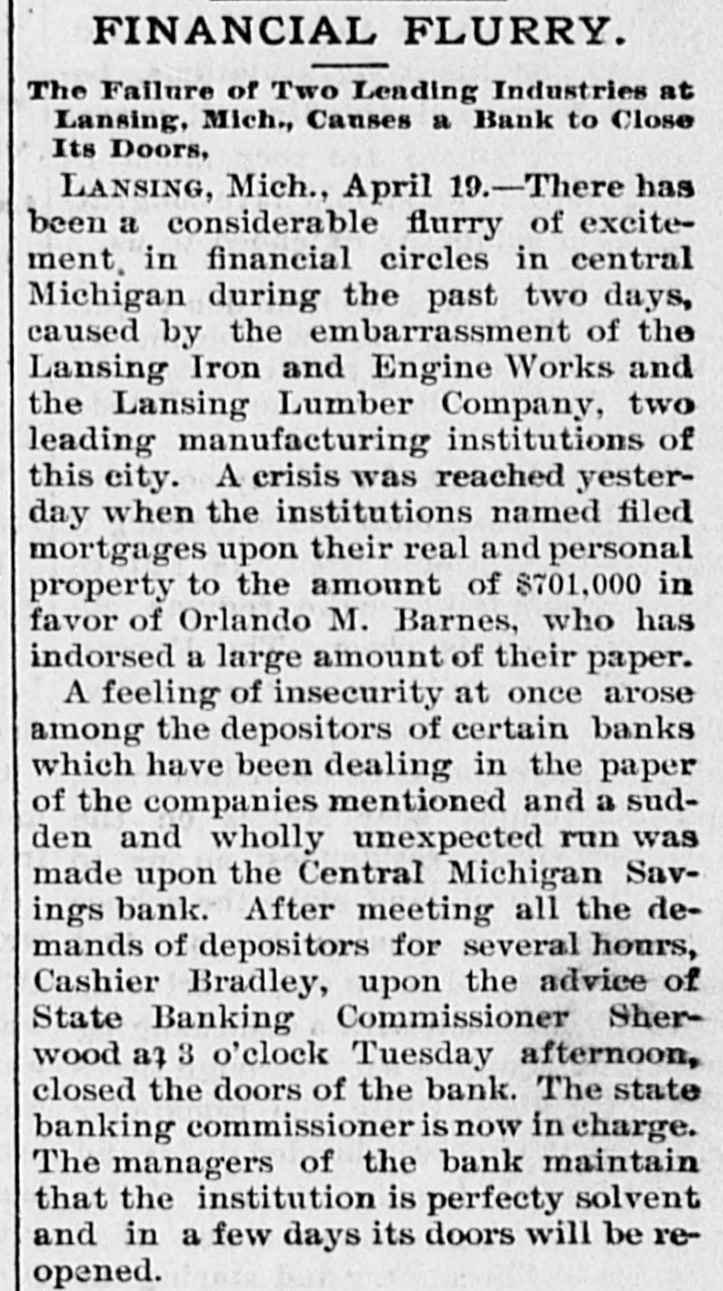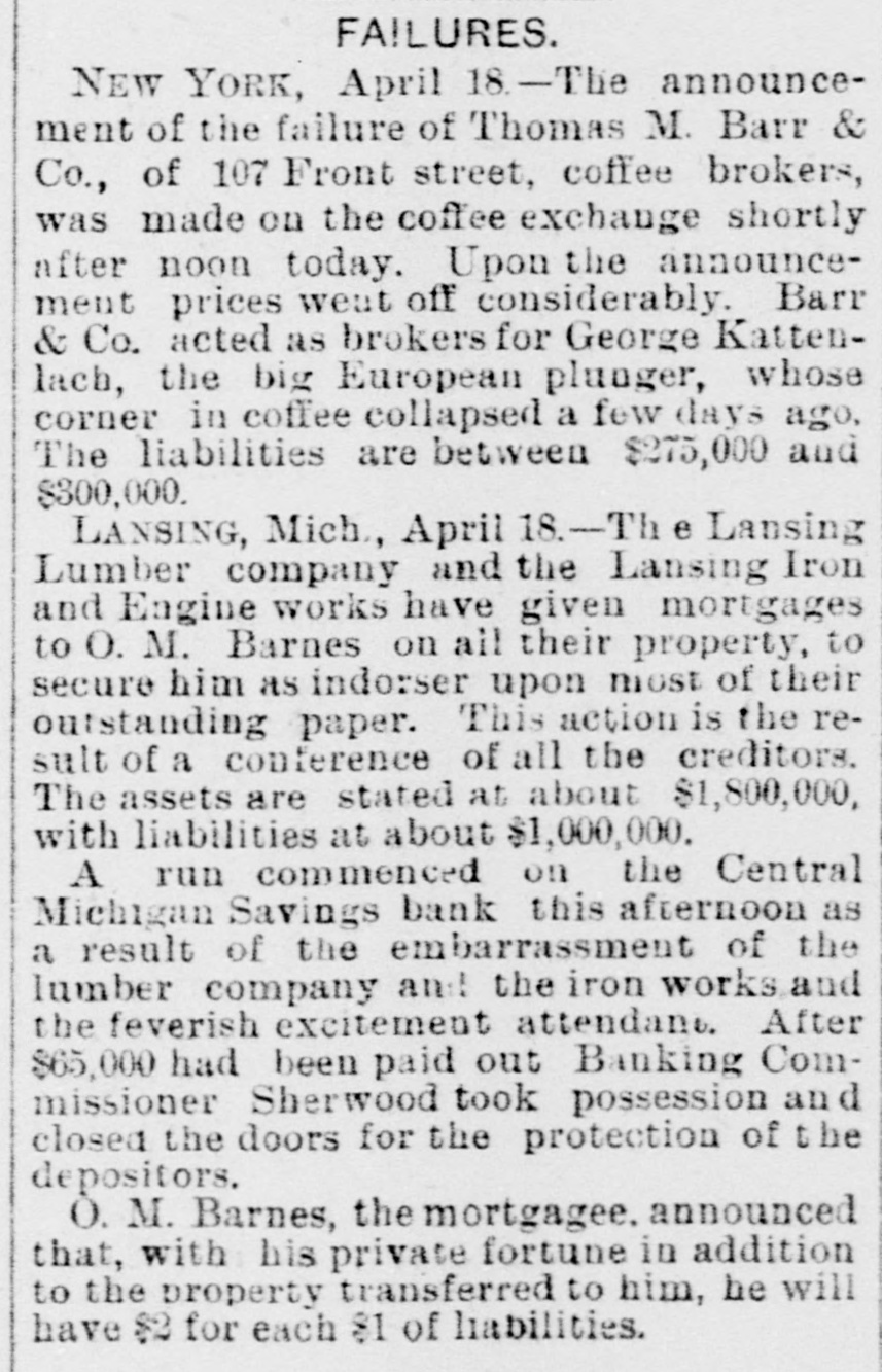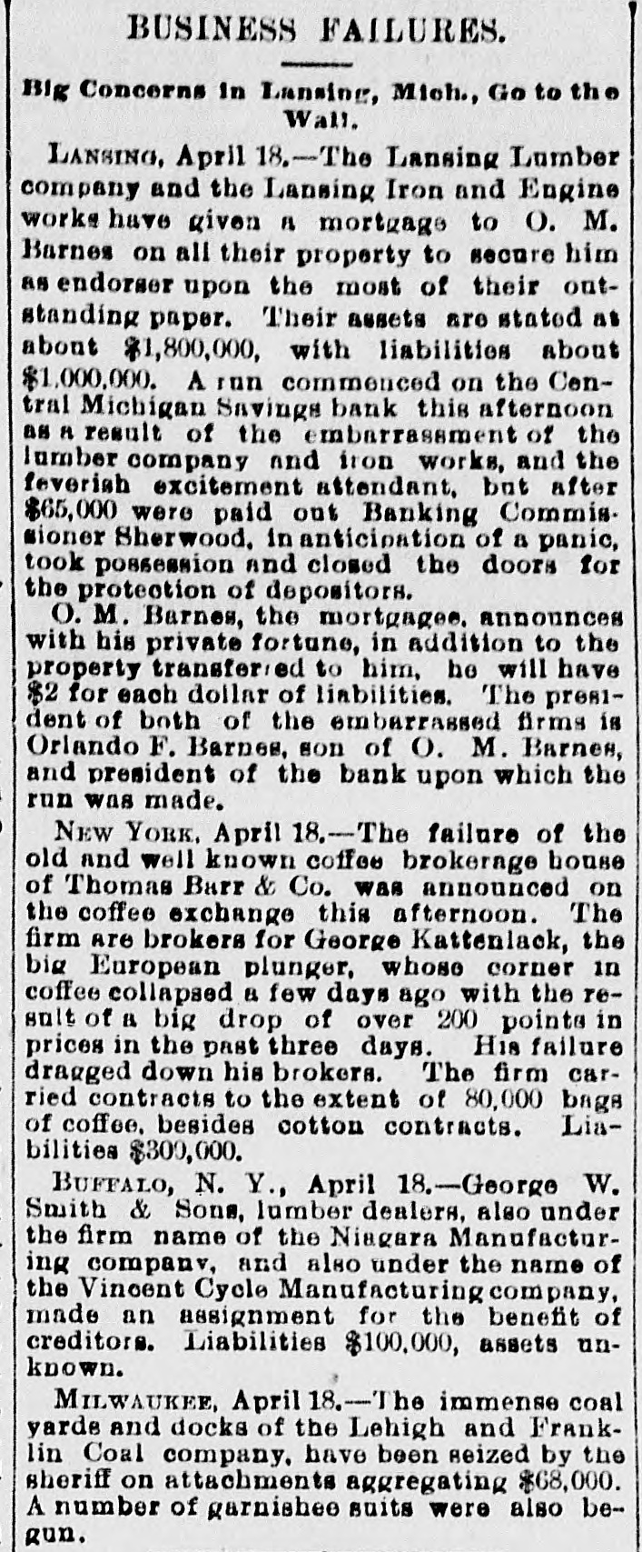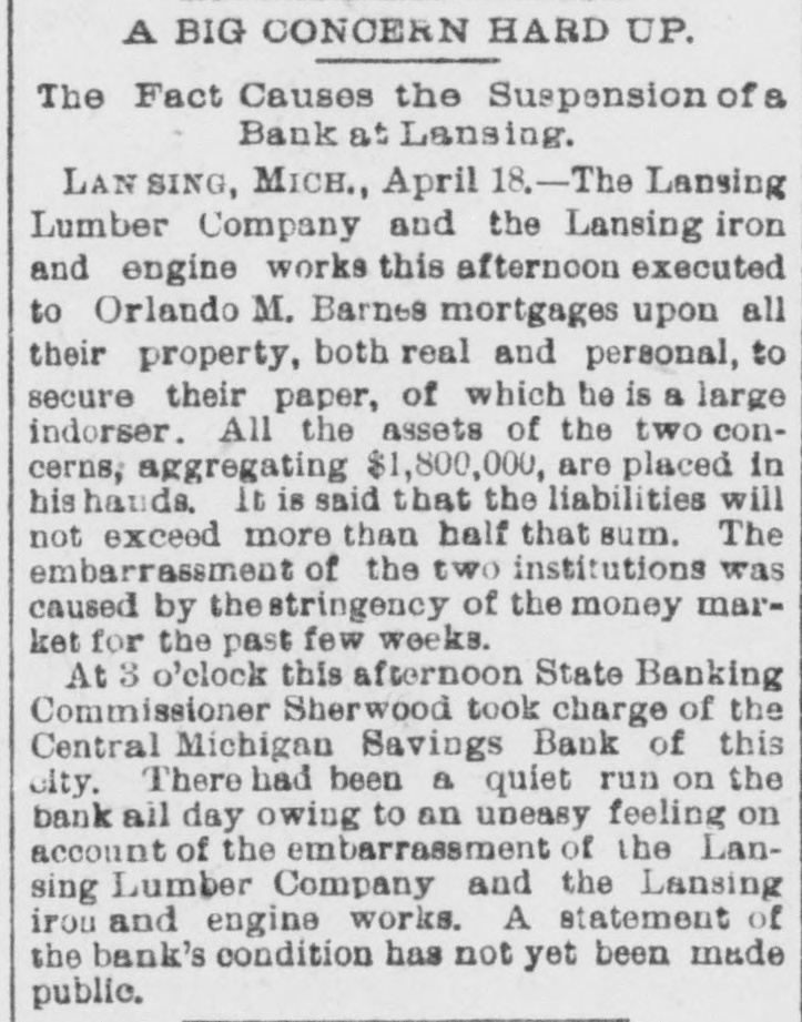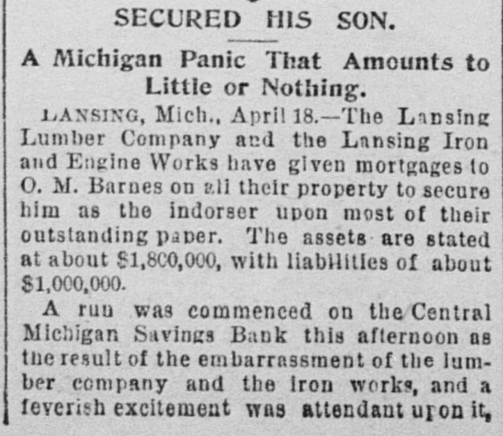 BETWEEN THE LAKES. The recent heavy rains quenched many of the forced and swamp fires raging in Michigan. A new Catholicchurch has been dedicated at Black River. Alger, Smith & Co. donated the site. John Boyer fell from the roof of Wagner's new brick at Kalamazoo and soon died of his injuries. Mrs. Edgar Tyler, of Jasper, attempted to commit suicide by cutting her throat. She may recover. The log jam in the Manistee river extends several miles and it is said to include 15,000,000 feet of timber. David L. Pearson, a farmer living near New Buffalo, has gone insane on account of the recent earthquak... Charles Williams, well-to-do farmer, ended his life by hanging himself from a beam in his barn near Yale. Norman Holmes shot a pure white "red" squirrel near Fowlerville, and Editor Peak has it among his curios. Joseph Besner, near Iron River, was shot by a set gun which had been set for deer, and will die from his injuries. Rev. P. T. Rowe, of Sault Ste. Marie, will be consecreated Bishop of Alaska in St. George's Episcopal church, New York, Nov. 30. While helping unload the steamer Colorado at Port Huron James Wers was fatally injured by a barrel of flour rolling on him. Warren M. Wright, of Ishpeming, has been appointed chief bookkeeper in the state treasury to succeed Will Evans, resigned. Firedamp caused an explosion at the Winning colliery at Blackwell, in the county of Derby, England. Seven persons were killed. Men are boring for coal about six miles from East Jordan. They struck a four-foot vein and will begin active mining operations. 1Lewis Stretch accidentally shot and killed Eben Ireland, aged 15, while hunting near Benton Harbor. Stretch is likely to go insane. Grand Rapids furniture workers will demand that on January 1 wages be restored to what they received previous to the recent hard times. Kalamazoo's common council voted to issue bonds to pay for the electric light plant. These are the only bonds standing against that city. A small force of men were put at work at the Norway mine at Norway, which has been idle five years, preparing for the resumption of mining. Andrew Dumon, of Tekonsha, while returning home from Coldwater, was waylaid by three men, pulled from his buggy and his pockets rifled of $180. The Negaunee brewery, has been removed to Duluth, but the plant at Negaunee will be used for a starch factory and potato whisky distillery. The secretary's books at the Michigan University show the registration to have reached the total of 2,850. This is a gain of 153 over the same time last year. The recent heavy freeze caught many farmers in Manistee county with their late potatoes yet undug, and the loss is variously estimated from 12,000 to 15,000 bushels. Foreign capitalists propose establishing one of the largest glass manufacturing establishments in the world, a plant of 200 pots capacity, at Delray, a suburb of Detroit. Jason Carpenter, aged 75, near Standish, received a divorce on the grounds of cruelty. In less than 10 minutes he had made application for a license to take another bride aged 32. The 3-year-old son of Mr. and Mrs. Frederick Wrege, of Saginaw, while at play, in stepping backward fell into a pail of boiling water and was fatally scalded. Bradley Matison, the oldest business man of Pontiac. has just made his first visit to Detroit in 29 years. He knew Detroit as a poorly-built old French town, and was hardly prepared to find a splendid city. Erastus and Dodson Webster were sentenced in the Livingston circuit court by Judge Stearns F. Smith to two years at Marquette prison for blowing up the residence of Geo. L. Hull, in Hamburg. Receiver Stone, of the defunct Central Michigan Savings bank, at Lansing, has notified the stockholders that they must put up the par value of the stock held by them to make good the claims of depositors. "Mark" Milks, proprietor of a lunch counter, Jesse Thomas and Clayton Sherwood, prominent young men of Kalkaska, have all been arrested, charged with having criminally assaulted a girl 14 years old. The recent dismissal of Prof. Gorton from the Agricultural college presidency is creating a great deal of discontent throughout the state, especially since it has become known that he was not given a hearing. Capt. Spear has had City Marshal Mitchell arrested at Adrian for tearing down a rail fence which the city claims was on the highway. Spear says the fence stood there over 40 years, and that established his property line.