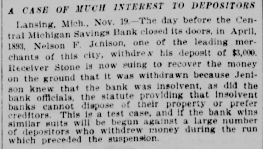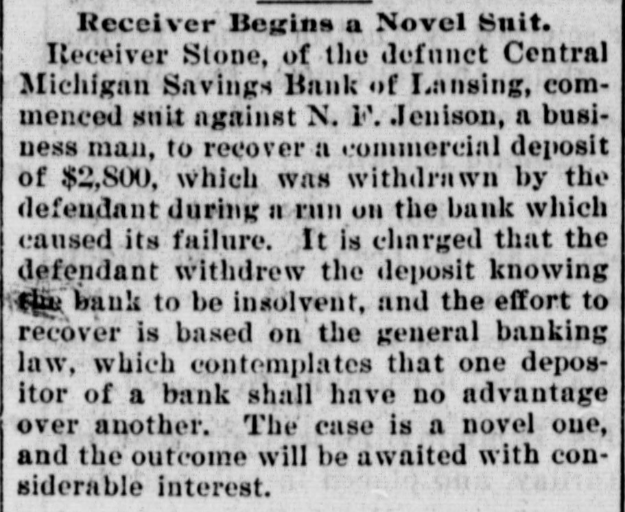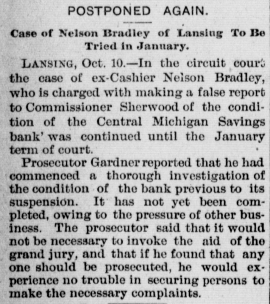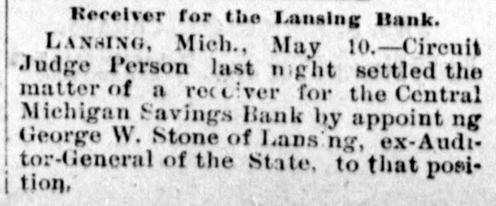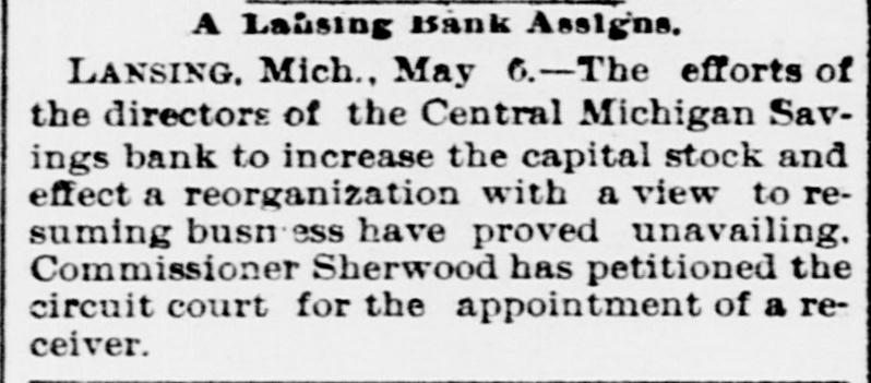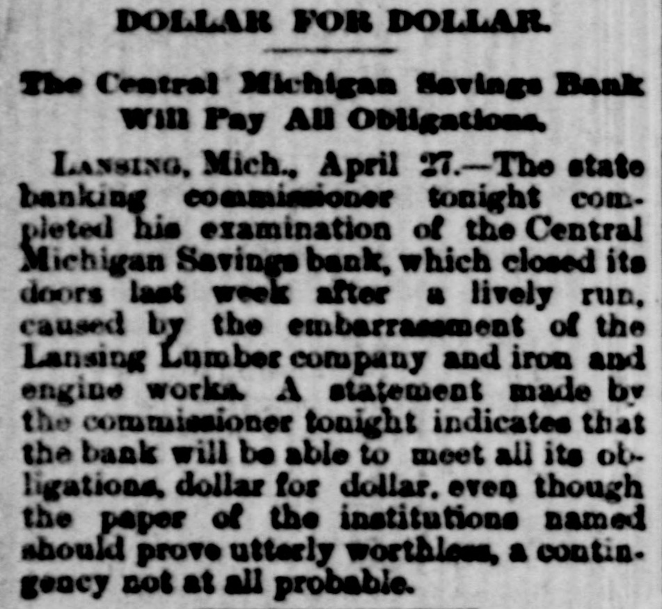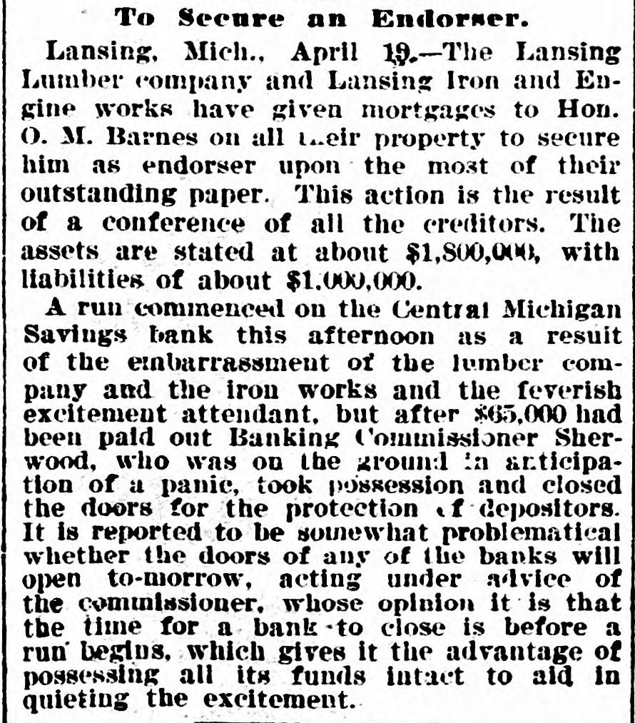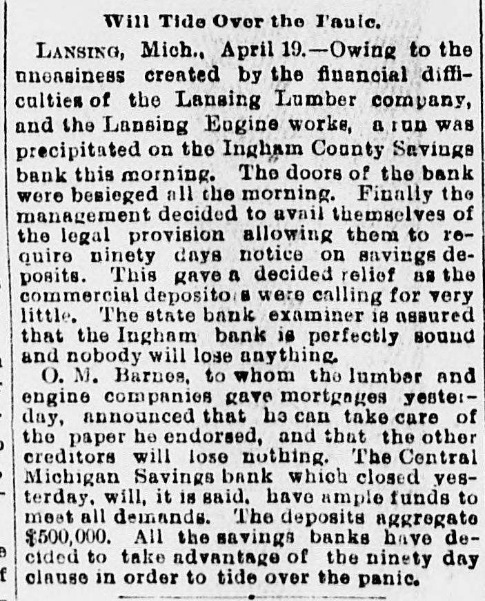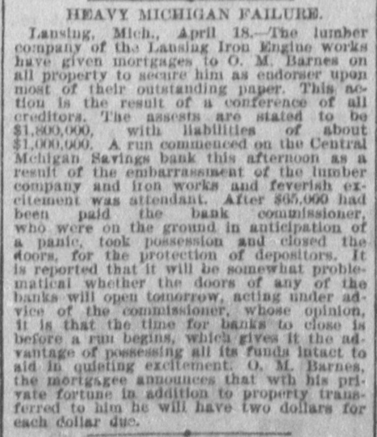 BETWEEN THE LAKES. The recent heavy rains quenched many of the forced and swamp fires raging in Michigan. A new Catholicchurch has been dedicated at Black River. Alger, Smith & Co. donated the site. John Boyer fell from the roof of Wagner's new brick at Kalamazoo and soon died of his injuries. Mrs. Edgar Tyler, of Jasper, attempted to commit suicide by cutting her throat. She may recover. The log jam in the Manistee river extends several miles and it is said to include 15,000,000 feet of timber. David L. Pearson, a farmer living near New Buffalo, has gone insane on account of the recent earthquak... Charles Williams, well-to-do farmer, ended his life by hanging himself from a beam in his barn near Yale. Norman Holmes shot a pure white "red" squirrel near Fowlerville, and Editor Peak has it among his curios. Joseph Besner, near Iron River, was shot by a set gun which had been set for deer, and will die from his injuries. Rev. P. T. Rowe, of Sault Ste. Marie, will be consecreated Bishop of Alaska in St. George's Episcopal church, New York, Nov. 30. While helping unload the steamer Colorado at Port Huron James Wers was fatally injured by a barrel of flour rolling on him. Warren M. Wright, of Ishpeming, has been appointed chief bookkeeper in the state treasury to succeed Will Evans, resigned. Firedamp caused an explosion at the Winning colliery at Blackwell, in the county of Derby, England. Seven persons were killed. Men are boring for coal about six miles from East Jordan. They struck a four-foot vein and will begin active mining operations. 1Lewis Stretch accidentally shot and killed Eben Ireland, aged 15, while hunting near Benton Harbor. Stretch is likely to go insane. Grand Rapids furniture workers will demand that on January 1 wages be restored to what they received previous to the recent hard times. Kalamazoo's common council voted to issue bonds to pay for the electric light plant. These are the only bonds standing against that city. A small force of men were put at work at the Norway mine at Norway, which has been idle five years, preparing for the resumption of mining. Andrew Dumon, of Tekonsha, while returning home from Coldwater, was waylaid by three men, pulled from his buggy and his pockets rifled of $180. The Negaunee brewery, has been removed to Duluth, but the plant at Negaunee will be used for a starch factory and potato whisky distillery. The secretary's books at the Michigan University show the registration to have reached the total of 2,850. This is a gain of 153 over the same time last year. The recent heavy freeze caught many farmers in Manistee county with their late potatoes yet undug, and the loss is variously estimated from 12,000 to 15,000 bushels. Foreign capitalists propose establishing one of the largest glass manufacturing establishments in the world, a plant of 200 pots capacity, at Delray, a suburb of Detroit. Jason Carpenter, aged 75, near Standish, received a divorce on the grounds of cruelty. In less than 10 minutes he had made application for a license to take another bride aged 32. The 3-year-old son of Mr. and Mrs. Frederick Wrege, of Saginaw, while at play, in stepping backward fell into a pail of boiling water and was fatally scalded. Bradley Matison, the oldest business man of Pontiac. has just made his first visit to Detroit in 29 years. He knew Detroit as a poorly-built old French town, and was hardly prepared to find a splendid city. Erastus and Dodson Webster were sentenced in the Livingston circuit court by Judge Stearns F. Smith to two years at Marquette prison for blowing up the residence of Geo. L. Hull, in Hamburg. Receiver Stone, of the defunct Central Michigan Savings bank, at Lansing, has notified the stockholders that they must put up the par value of the stock held by them to make good the claims of depositors. "Mark" Milks, proprietor of a lunch counter, Jesse Thomas and Clayton Sherwood, prominent young men of Kalkaska, have all been arrested, charged with having criminally assaulted a girl 14 years old. The recent dismissal of Prof. Gorton from the Agricultural college presidency is creating a great deal of discontent throughout the state, especially since it has become known that he was not given a hearing. Capt. Spear has had City Marshal Mitchell arrested at Adrian for tearing down a rail fence which the city claims was on the highway. Spear says the fence stood there over 40 years, and that established his property line.