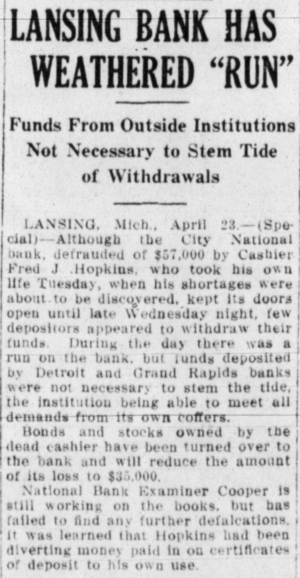 LANSING BANK HAS WEATHERED "RUN" Funds From Outside Institutions Not Necessary to Stem Tide of Withdrawals LANSING. Mich., April 23.-(Special)-Although the City National bank, defrauded of $57,000 by Cashier Fred J .Hopkins, who took his own life Tuesday, when his shortages were about to be discovered. kept its doors open until late Wednesday night, few depositors appeared to withdraw their funds. During the day there was a run on the bank. but Tunds deposited by Detroit and Grand Rapids banks were not necessary to stem the tide, the institution being able to meet all demands from its own coffers. Bonds and stocks owned by the dead cashier have been turned over to the bank and will reduce the amount of its loss to $35,000. National Bank Examiner Cooper is still working on the books. but has failed to find any further defalcations. It was learned that Hopkins had been diverting money paid in on certificates of deposit to his own use.