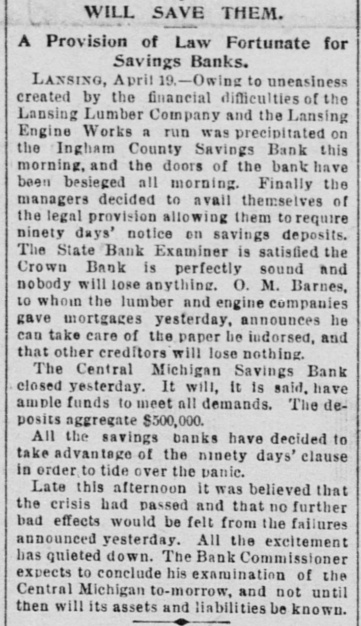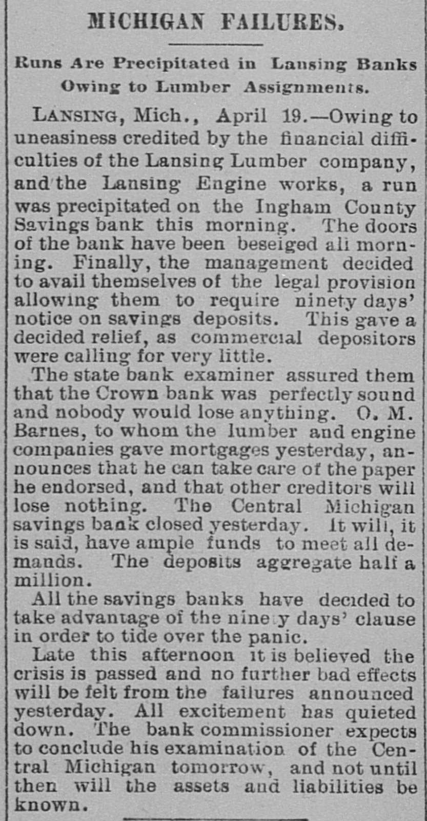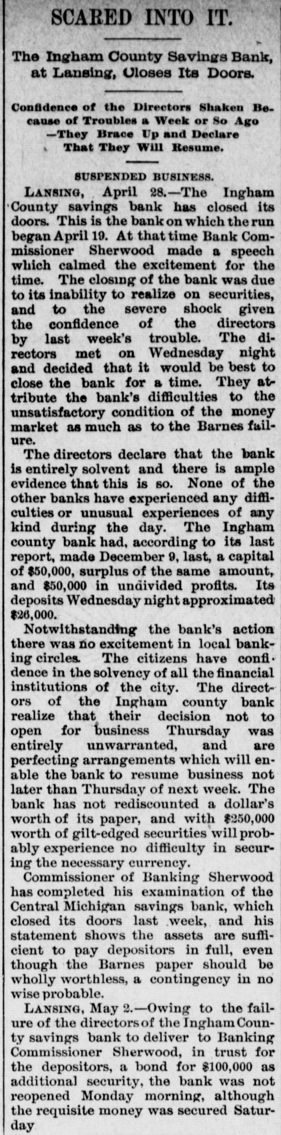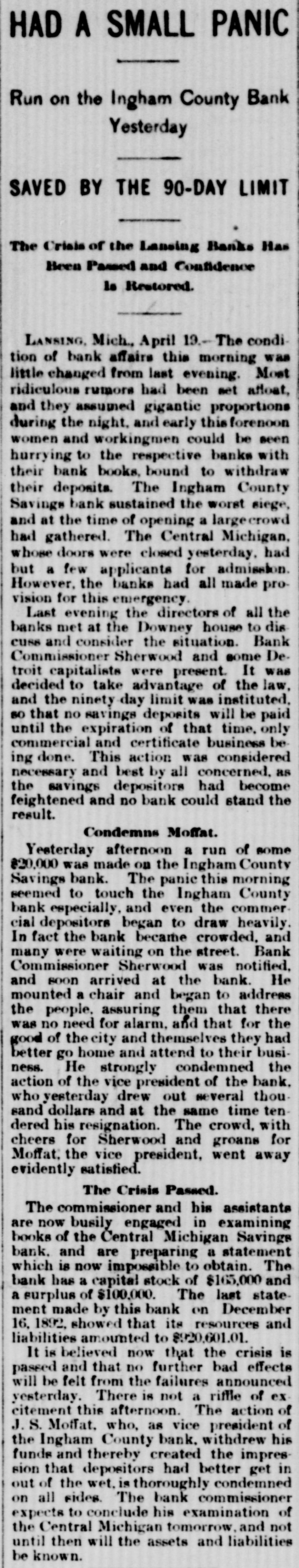 HAD A SMALL PANIC Run on the Ingham County Bank Yesterday SAVED BY THE 90-DAY LIMIT The Crisis of the Laneing Banks Has Been Passed and Confidence le Restored. LANSING, Mich. April 19.- The condition of bank affairs this morning was little changed from last evening. Most ridiculous rumore had been net affoat, and they assumed gigantic proportions during the night. and early this forenoon women and workingmen could be seen hurrying to the respective banks with their bank books. bound to withdraw their deposits. The Ingham County Savings bank sustained the worst siege, and at the time of opening a largecrowd had gathered. The Central Michigan, whose doors were closed yesterday. had but a few applicants for admission. However, the banks had all made provision for this emergency. Last evening the directors of all the banks met at the Downey house to dis cuss and consider the situation. Bank Commissioner Sherwood and some Detroit capitalists were present. It was decided to take advantage of the law. and the ninety day limit was instituted. so that no savings deposits will be paid until the expiration of that time. only commercial and certificate business be ing done. This action was considered necessary and best by all concerned, as the savings depositors had become feightened and no bank could stand the result. Condemns Moffat. Yesterday afternoon a run of some $20,000 was made on the Ingham County Savings bank. The panic this morning seemed to touch the Ingham County bank especially, and even the commercial depositors began to draw heavily. In fact the bank became crowded. and many were waiting on the street. Bank Commissioner Sherwood was notified. and soon arrived at the bank. He mounted a chair and began to address the people. assuring them that there was no need for alarm. and that for the good of the city and themselves they had better go home and attend to their business. He strongly condemned the action of the vice president of the bank. who yesterday drew out several thou. sand dollars and at the same time tendered his resignation. The crowd. with cheers for Sherwood and groans for Moffat. the vice president, went away evidently satisfied. The Crisis Passed. The commissioner and his assistants are now busily engaged in examining books of the Central Michigan Savings bank. and are preparing a statement which is now impossible to obtain. The bank has a capital stock of $165,000 and a surplus of $100,000. The last state. ment made by this bank on December 16. 1892. showed that its resources and liabilities amounted to $920,601.01. It is believed now that the crisis is passed and that no further bad effects will be felt from the failures announced yesterday. There is not a riffle of ex eitement this afternoon. The action of J.S. Moffat. who, as vice president of the Ingham County bank. withdrew his funds and thereby created the impression that depositors had better get in out of the wet. is thoroughly condemned on all sides. The bank commissioner expects to conclude his examination of the Central Michigan tomorrow. and not until then will the assets and liabilities be known.