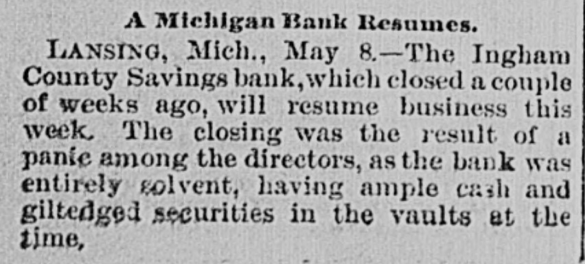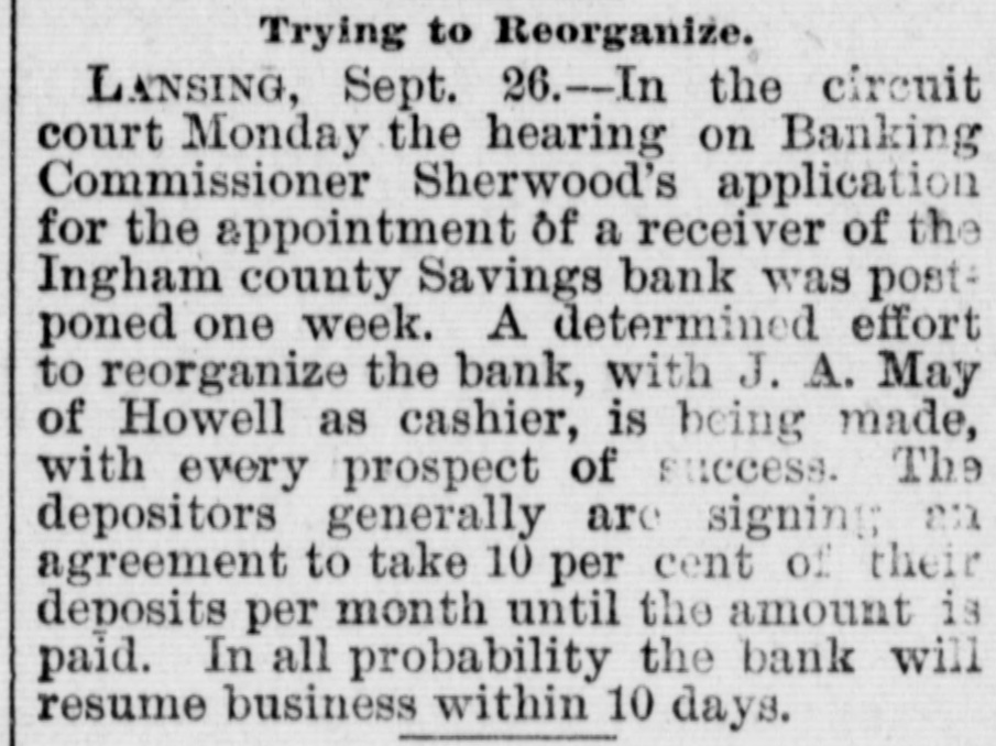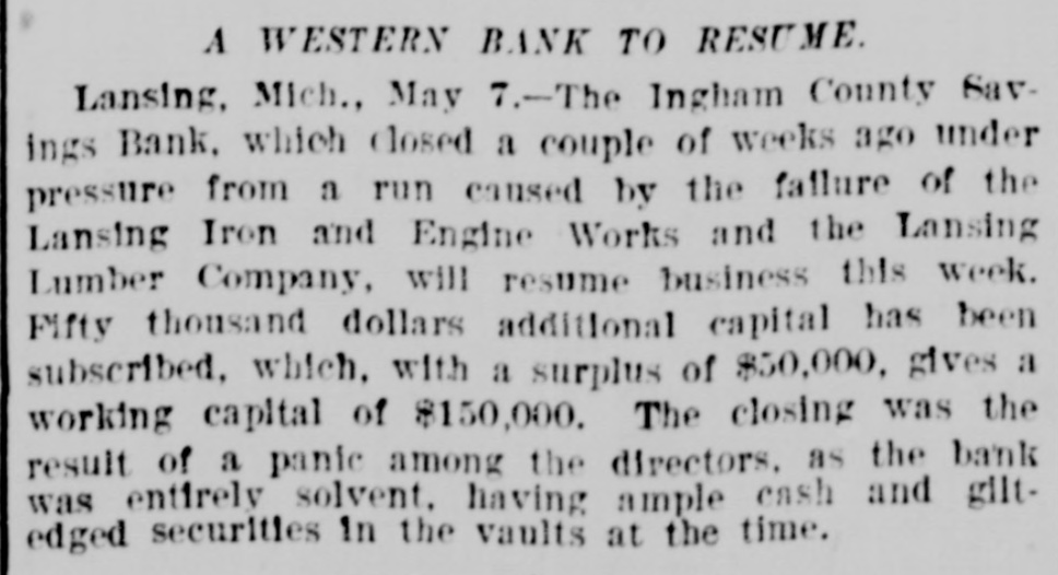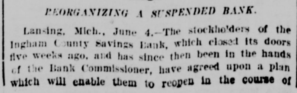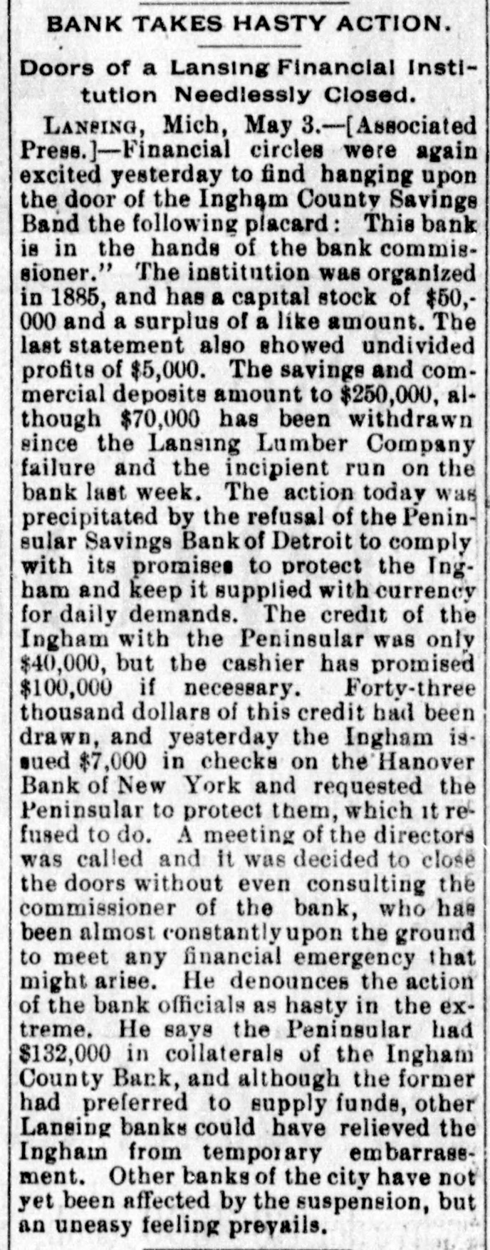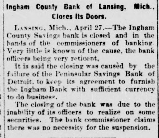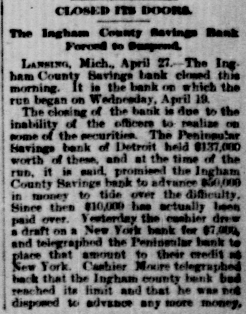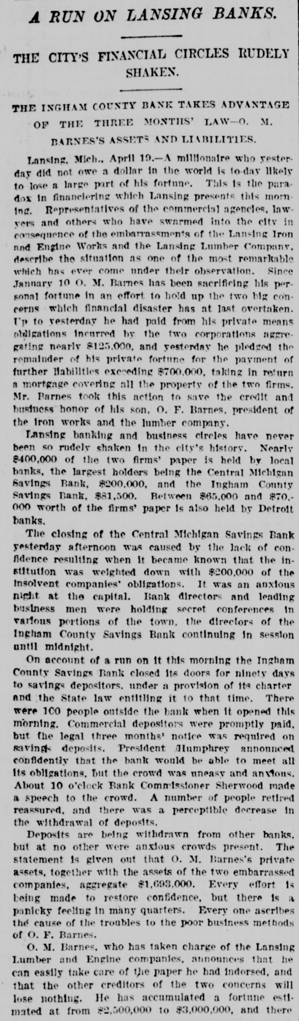 HAD A SMALL PANIC Run on the Ingham County Bank Yesterday SAVED BY THE 90-DAY LIMIT The Crisis of the Laneing Banks Has Been Passed and Confidence le Restored. LANSING, Mich. April 19.- The condition of bank affairs this morning was little changed from last evening. Most ridiculous rumore had been net affoat, and they assumed gigantic proportions during the night. and early this forenoon women and workingmen could be seen hurrying to the respective banks with their bank books. bound to withdraw their deposits. The Ingham County Savings bank sustained the worst siege, and at the time of opening a largecrowd had gathered. The Central Michigan, whose doors were closed yesterday. had but a few applicants for admission. However, the banks had all made provision for this emergency. Last evening the directors of all the banks met at the Downey house to dis cuss and consider the situation. Bank Commissioner Sherwood and some Detroit capitalists were present. It was decided to take advantage of the law. and the ninety day limit was instituted. so that no savings deposits will be paid until the expiration of that time. only commercial and certificate business be ing done. This action was considered necessary and best by all concerned, as the savings depositors had become feightened and no bank could stand the result. Condemns Moffat. Yesterday afternoon a run of some $20,000 was made on the Ingham County Savings bank. The panic this morning seemed to touch the Ingham County bank especially, and even the commercial depositors began to draw heavily. In fact the bank became crowded. and many were waiting on the street. Bank Commissioner Sherwood was notified. and soon arrived at the bank. He mounted a chair and began to address the people. assuring them that there was no need for alarm. and that for the good of the city and themselves they had better go home and attend to their business. He strongly condemned the action of the vice president of the bank. who yesterday drew out several thou. sand dollars and at the same time tendered his resignation. The crowd. with cheers for Sherwood and groans for Moffat. the vice president, went away evidently satisfied. The Crisis Passed. The commissioner and his assistants are now busily engaged in examining books of the Central Michigan Savings bank. and are preparing a statement which is now impossible to obtain. The bank has a capital stock of $165,000 and a surplus of $100,000. The last state. ment made by this bank on December 16. 1892. showed that its resources and liabilities amounted to $920,601.01. It is believed now that the crisis is passed and that no further bad effects will be felt from the failures announced yesterday. There is not a riffle of ex eitement this afternoon. The action of J.S. Moffat. who, as vice president of the Ingham County bank. withdrew his funds and thereby created the impression that depositors had better get in out of the wet. is thoroughly condemned on all sides. The bank commissioner expects to conclude his examination of the Central Michigan tomorrow. and not until then will the assets and liabilities be known.