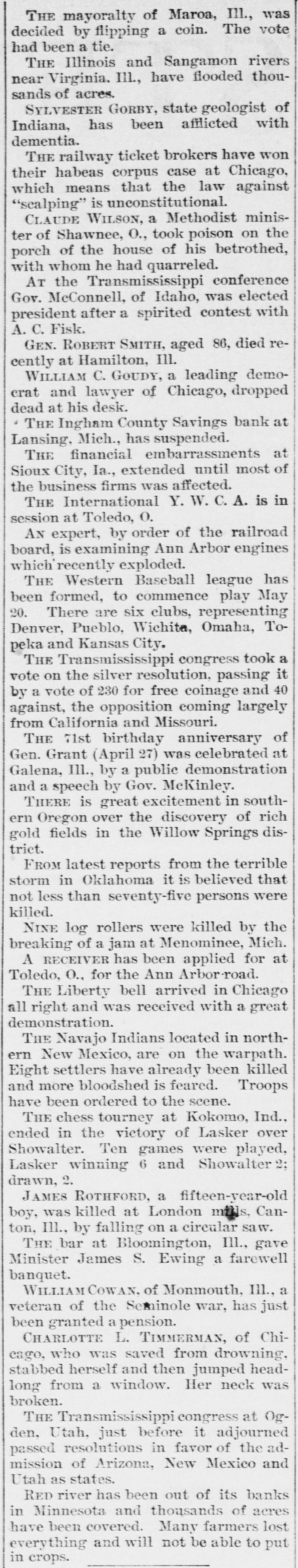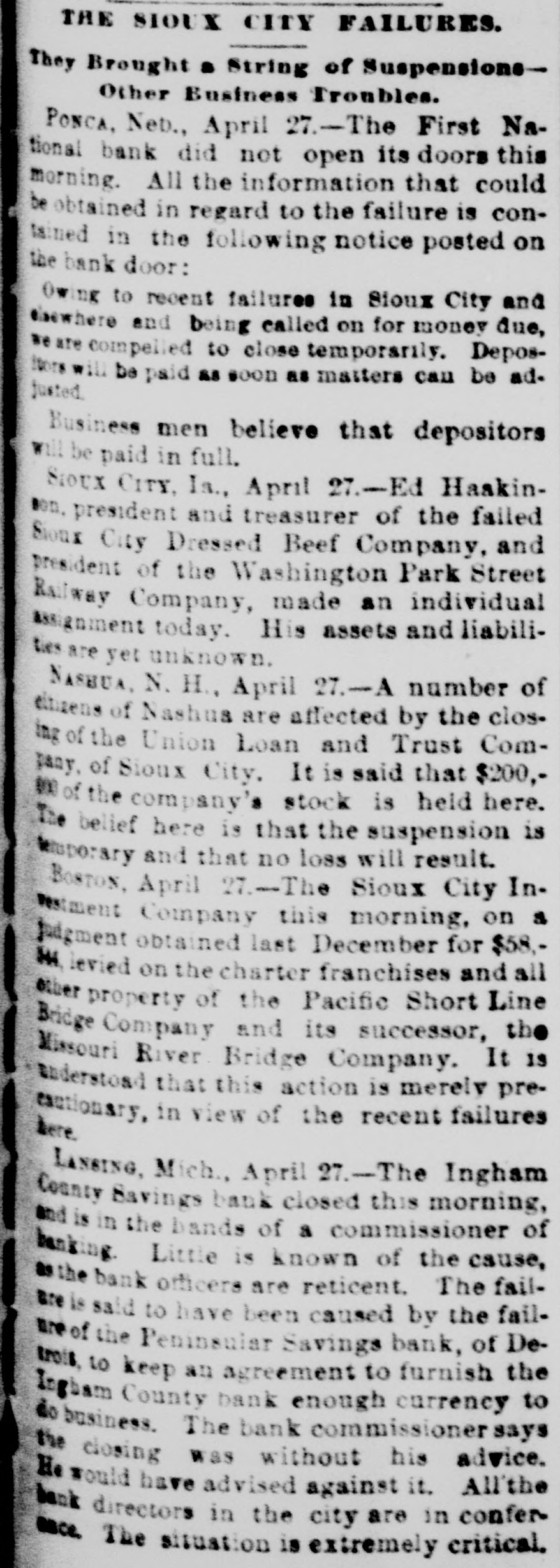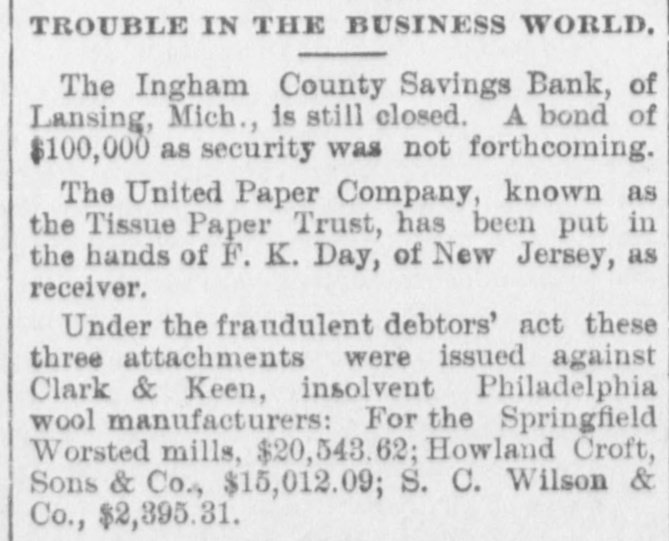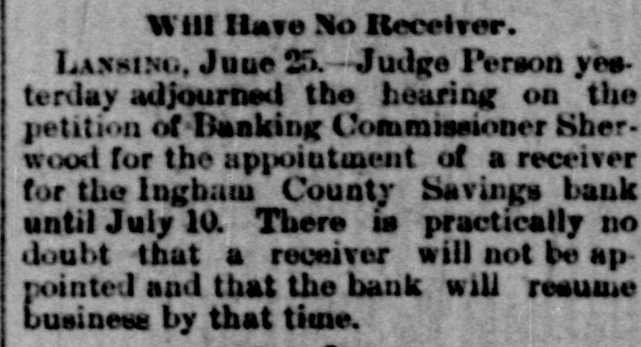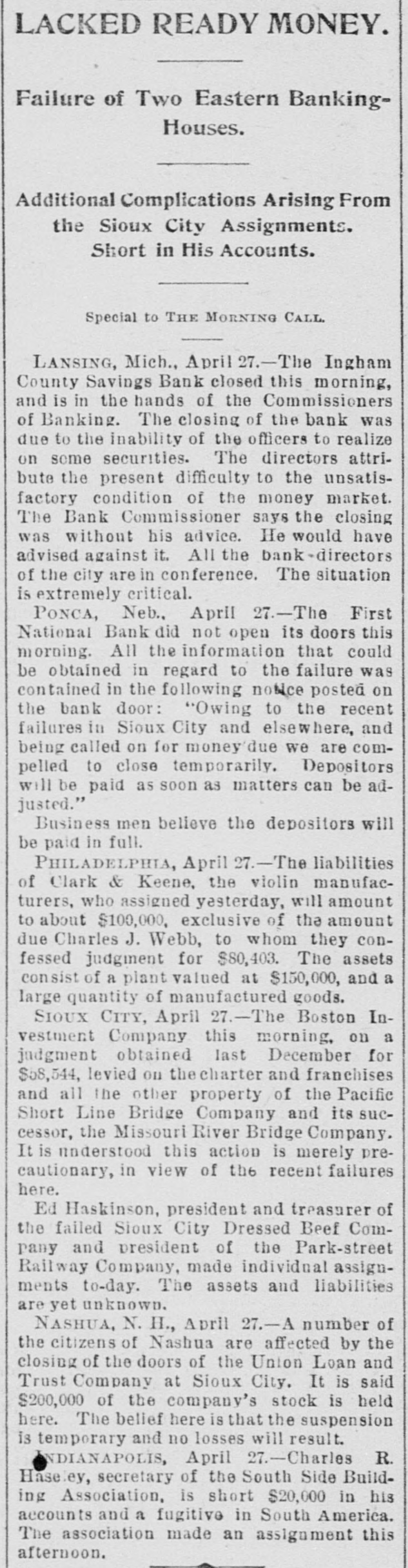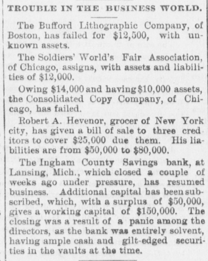 HAD A SMALL PANIC Run on the Ingham County Bank Yesterday SAVED BY THE 90-DAY LIMIT The Crisis of the Laneing Banks Has Been Passed and Confidence le Restored. LANSING, Mich. April 19.- The condition of bank affairs this morning was little changed from last evening. Most ridiculous rumore had been net affoat, and they assumed gigantic proportions during the night. and early this forenoon women and workingmen could be seen hurrying to the respective banks with their bank books. bound to withdraw their deposits. The Ingham County Savings bank sustained the worst siege, and at the time of opening a largecrowd had gathered. The Central Michigan, whose doors were closed yesterday. had but a few applicants for admission. However, the banks had all made provision for this emergency. Last evening the directors of all the banks met at the Downey house to dis cuss and consider the situation. Bank Commissioner Sherwood and some Detroit capitalists were present. It was decided to take advantage of the law. and the ninety day limit was instituted. so that no savings deposits will be paid until the expiration of that time. only commercial and certificate business be ing done. This action was considered necessary and best by all concerned, as the savings depositors had become feightened and no bank could stand the result. Condemns Moffat. Yesterday afternoon a run of some $20,000 was made on the Ingham County Savings bank. The panic this morning seemed to touch the Ingham County bank especially, and even the commercial depositors began to draw heavily. In fact the bank became crowded. and many were waiting on the street. Bank Commissioner Sherwood was notified. and soon arrived at the bank. He mounted a chair and began to address the people. assuring them that there was no need for alarm. and that for the good of the city and themselves they had better go home and attend to their business. He strongly condemned the action of the vice president of the bank. who yesterday drew out several thou. sand dollars and at the same time tendered his resignation. The crowd. with cheers for Sherwood and groans for Moffat. the vice president, went away evidently satisfied. The Crisis Passed. The commissioner and his assistants are now busily engaged in examining books of the Central Michigan Savings bank. and are preparing a statement which is now impossible to obtain. The bank has a capital stock of $165,000 and a surplus of $100,000. The last state. ment made by this bank on December 16. 1892. showed that its resources and liabilities amounted to $920,601.01. It is believed now that the crisis is passed and that no further bad effects will be felt from the failures announced yesterday. There is not a riffle of ex eitement this afternoon. The action of J.S. Moffat. who, as vice president of the Ingham County bank. withdrew his funds and thereby created the impression that depositors had better get in out of the wet. is thoroughly condemned on all sides. The bank commissioner expects to conclude his examination of the Central Michigan tomorrow. and not until then will the assets and liabilities be known.