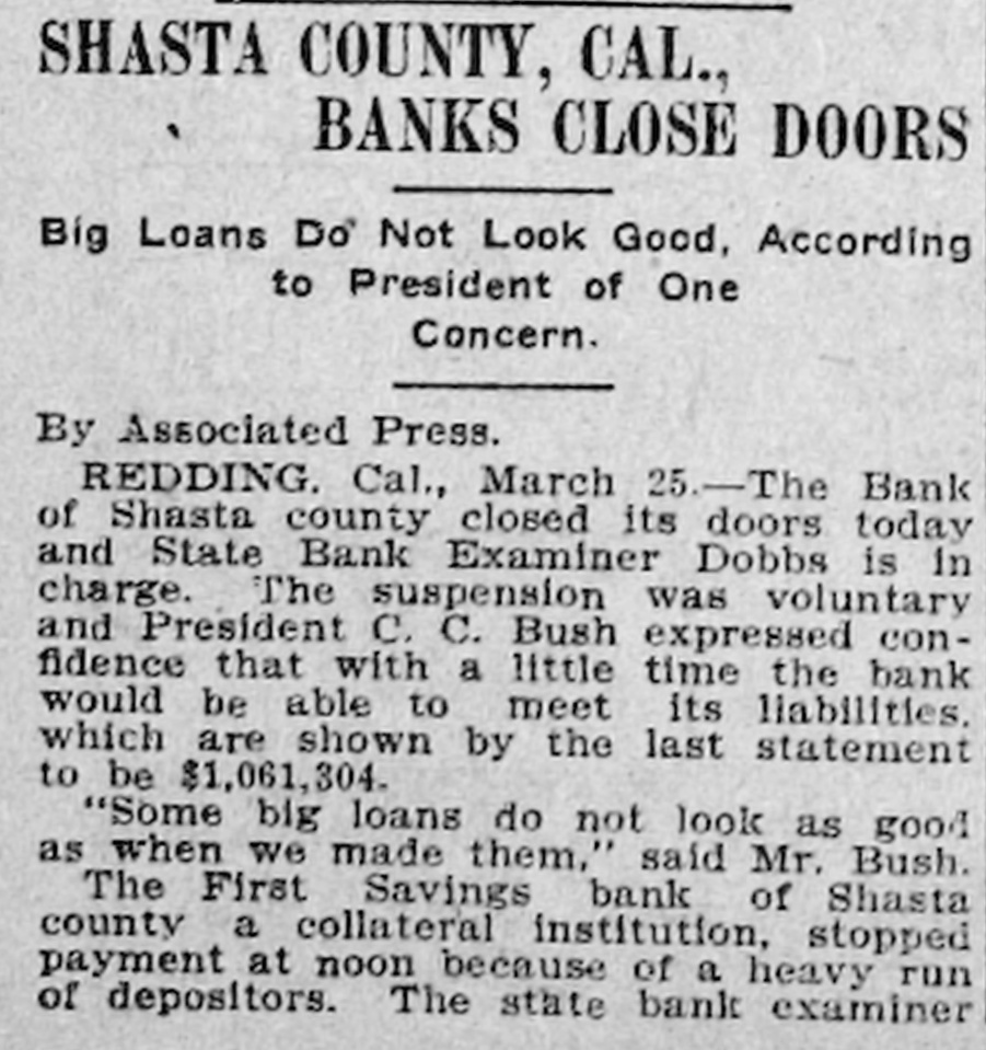 The Bank of Shasta county closed its doors today and State Bank Examiner Dobbs is in charge. The suspension was voluntary and President C. C. Bush expressed confidence that with a little time the bank would be able to meet its liabilities. Some big loans do not look as good as when we made them.