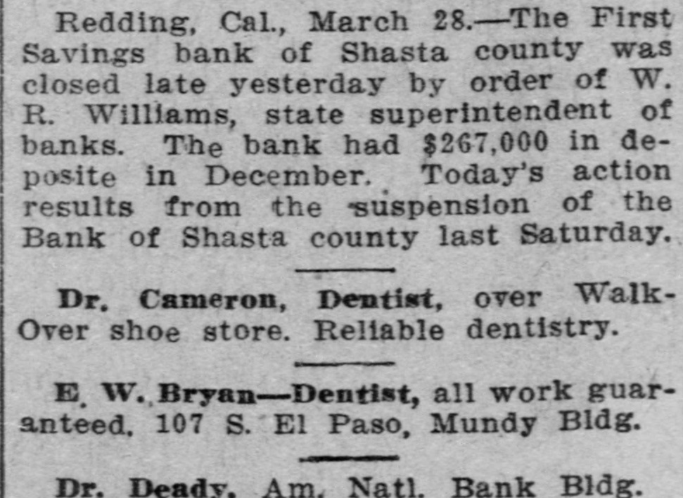Redding, Cal., March 28.-The First Savings bank of Shasta county was closed late yesterday by order of W. R. Williams, state superintendent of banks. The bank had $267,000 in deposite in December. Today's action results from the suspension of the Bank of Shasta county last Saturday. Dr. Cameron, Dentist, over WalkOver shoe store. Reliable dentistry. E. W. Bryan-Dentist, all work guaranteed, 107 S. El Paso, Mundy Bldg. Dr. Deady. Am. Natl. Bank Bldg.