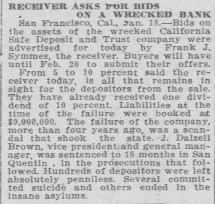 MUST TAKE CASH OR STOCK Depositors of California Safe Deposit and Trust Company Face Alternatives The depositors of the defunct Callfornia Safe Deposit and Trust company are facing the alternative of accepting a cash dividend on their deposits of 3 1-3 per cent, payable January 2, or taking as their quoto Western Pacific stock at $10 per share, an advance of $2 a share over the present market. At the time the court order was issued declaring a 3 1-3 per cent dividend Western Pacific stock was valued, fairly the court declared, at $10. Since then it has steadily decreased until yesterday morning $8 was the price asked, a quarter of a point higher than it was Saturday. Frank F. Symmes, receiver for the bank, said this morning that he put the proposition squarely up to the depositors, who were undecided as the to whether to take their cash or stock. CHANCE OR CASH tell them," said Symmes, "that no market for cific that unless they there "I and is Western wish the to rail- take Paa on it going up, as increases its earnings and on road its chance assessments interest and pays its bonds, they would better take their cash dividends. We have 39,700 shares of Western Pacific on hand. of which 600 shares have been subscribed for up to the present time. That plainly shows the attitude of the depositors. "It is true that some time ago we offered as high as $30 a share Pacific, but many were for depositors were Western unwilling to railroad accept of the that figure, believing the would increase its earnings by leaps and bounds. "The court has ordered that the stock be issued at $10 per share to less those to that change want that it, price." and I am powerPAYS NO DIVIDENDS A well known financier said yesterday: "The time the offer of $30 per share was made was the time for the stock to be sold. stock has no value as a stock, nor road is able to earn more dividend until "Now the the paying will it have than enough to pay the interest on its debt. "Last year its net earnings were The the Pacific is only Western $1,400,000. bonded $50,000,000 debt second first of bonds, $25,000,000 in bonds and total debt of mortgage notes-a mortgage $91,000,000. $16,000,000 "There is no chance of the stock having an interest paying value until the road has a net earning capacity of more than $4,550,000. This fact should be known and appreciated by all the depositors who consider accepting Western Pacific stock in lieu of cash. "There is a remote possibility that the stock may have an increased value at some time, if it is kept intact, but not if it is dissipated. THINKS CASH BETTER "Certainly, every depositor of the defunct California Safe Deposit and Trust company owns the stock If It it is retained by Receiver Symmes. is beyond my comprehension how any depositor can gain by accepting the stock in lieu of cash at $10 a share, when it does not earn dividends and has no chance of earning dividends for many years to come." Samuel Rosenheim, representing the Depositors' association, said that was convinced that Receiver he was administering the afthe depositors fairly the best for he fairs Symmes was of doing their and that interests that was possible.