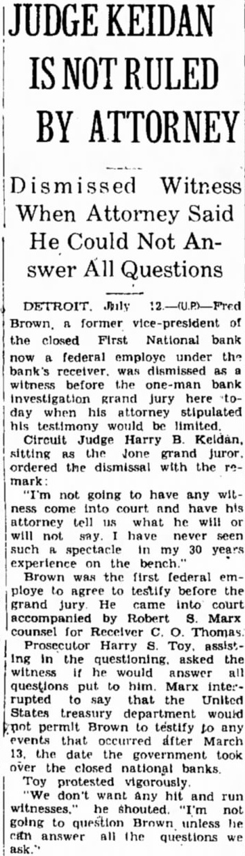 BY ATTORNEY Dismissed Witness When Attorney Said He Could Not Answer Questions July former of the closed First National bank now federal employe under the bank's receiver. was dismissed witness before the one-man bank investigation grand jury here day when his attorney stipulated his testimony would limited. Circuit Judge Harry B. Keldan, sitting the Jone grand Juror. ordered the dismissal with the mark: not going to have any witness come into court and have his attorney tell what he will will not have never seen such spectacle my 30 years experience on the bench. Brown was the first federal ploye to agree to testify before the grand jury He came into court accompanied by Robert S. Marx counsel for Receiver Thomas Prosecutor Harry Toy. assistIng in the questioning. asked the witness he would answer all questions put to him. Marx interrupted to say that United States treasury department would permit Brown to testify any events that after March the date the government took over the closed national Toy protested vigorously. don't want Any hit and run he not going to question Brown unless he can answer all the questions