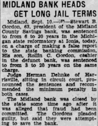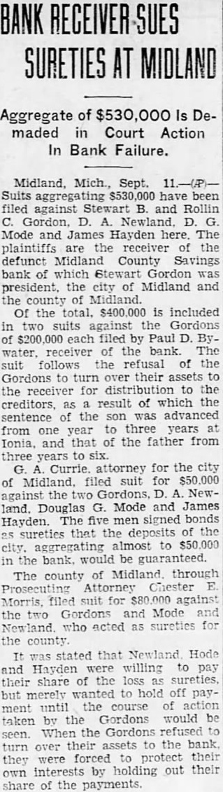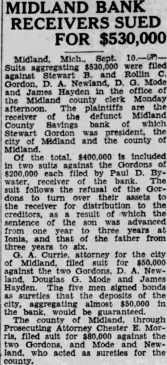 Midland, Sept. $530,000 were filed Suits Stewart and Rollin against D. Newland, D. G. Mode Gordon, James Hayden in the office and the Midland county Monday afternoon. The plaintiffs are the of defunct Midland receiver County Savings bank of which Stewart Gordon president, the Midland and the county of Midland. Of the $400,000 is included suits the each filed D. the follows the refusal of the Gordons their assets the receiver for distribution creditors, result of which sentence the was advanced one year three and that the father from three years to six. Currie, attorney for the city filed for $50,000 against the two D. Newland, and James Hayden. The five signed as sureties that the the city, aggregating almost $50,000 in the bank, would be guaranteed. The county through Chester E. Morris, filed suit for against the Mode who acted as sureties for the county.