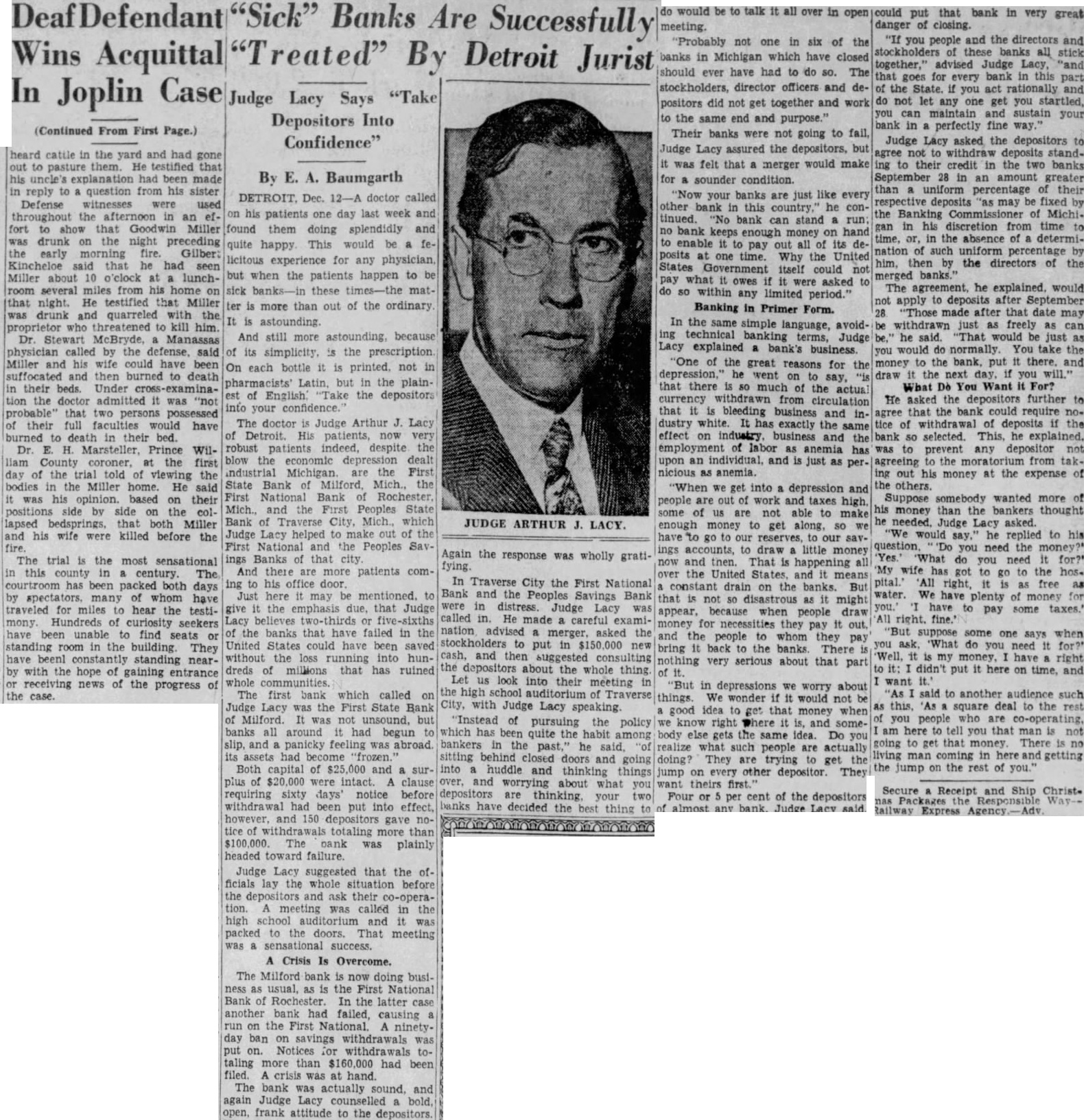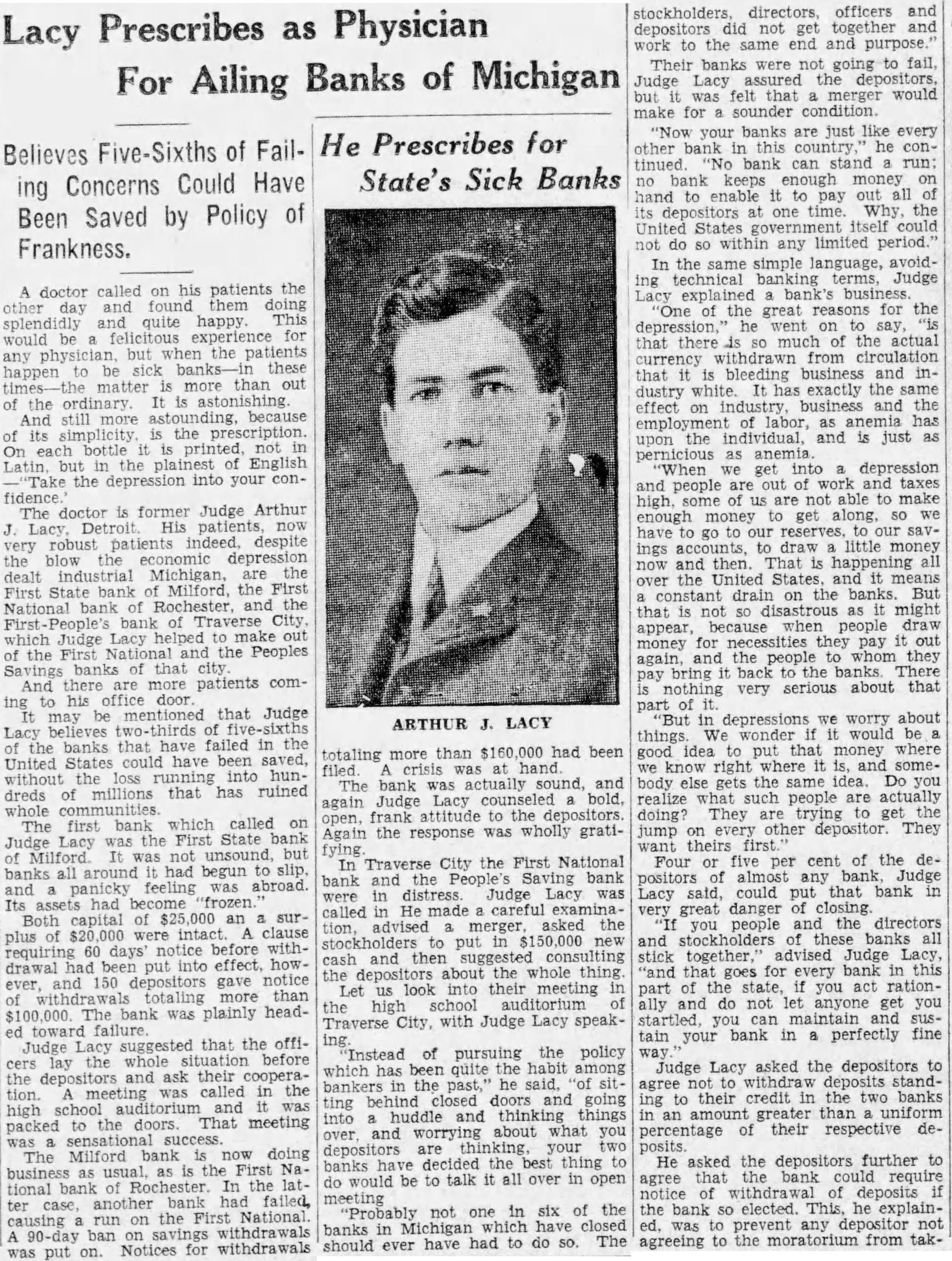 A DOCTOR WHOSE PATIENTS ARE SICK BANKS USES COMMON SENSE MEDICINE So Far, All of the Treatments Administered for Financial IIIs Such as Lack of Confidence and Frozen Assets Have Resulted in Arthur Lacy of Détroit Gives as His First Prescription an Order for Bankers to Tell Depositors DOCTOR called on his patients one last week and found them doing splendidly and quite happy. This would any but when the patients happen matter more the ordinary: And still astounding, because its the prescription. each bottle printed, not pharmacists but in the plainest the depositors your doctor Judge Arthur Lacy of Detroit. His robust patients indeed, depression dealt industrial Michigan, are the First State Bank of Mich., the First National Rochester Mich., and the FirstPeoples State Traverse City, Mich., which Judge Lacy helped make of the National and the Peoples Savings banks that city And there are more patients coming his office Just here mentioned. give the emphasis that Judge Lacy believes thirds of the banks that failed in United States could have without the loss running hundreds millions ruined The which Judge Lacy the First State Bank Milford unsound, banks around had to slip panicky feeling was abroad. assets had capital $25,000 and surplus sixty days notice before had put into effect. however, and 150 gave totaling than 000. The bank was plainly headed toward failure. Judge Lacy suggested that the officials lay situation before the And their was called the high school and was packed the doors. That meeting was sensational CRISIS IS The Milford bank now doing business First National Bank the latter case, another bank had failed, causing run on the First National 90-day on savings was Notices for totaling more had been filed. crisis was hand. The actually sound, Judge Lacy frank attitude depositors. Again the response was wholly Traverse City First National Bank the Peoples Savings Bank were in distress. Judge Lacy called in. He made careful examination, advised merger, asked stockholders put $150,000 cash then suggested consulting the depositors about the whole thing look into their meeting in the high school auditorium of Traverse with Judge speaking. "Instead pursuing the policy which has the habit among bankers the been said, sitting closed doors into huddle and things going and worrying about what you are thinking, your two banks the thing do would be to talk all over in meeting. 'Probably one in six of the banks in closed should had to The director and did not get together and the same Their not fail Judge Lacy the but felt that merger would make for sounder condition. "Now your banks just like every other this country bank run: bank keeps money hand out all its posits the United States itself could not pay what owes were asked to do so within any limited BANKING IN PRIMER FORM. In the simple techbanking terms, Judge Lacy explained "One the great reasons for the present he say, that there much the actual so that bleeding business from industry white. has exactly the same and effect on industry. business and the employment anemia has an individual and pernicious anemia. into depression and people and taxes high, able money get along, have to our accounts, money and That happening over the United States, and means constant drain the banks. But that not disastrous might because when people money necessities they pay and the people whom they back the banks. There nothing very serious about that part in depressions we worry about wonder would be good that money when we right where and somebody else the same idea. Do realize what are actually They trying get jump other They want theirs Four five the of alany bank, Judge Lacy said, could put that bank very great danger closing. people and the directors and stockholders these banks stick together," vised Judge Lacy, "and that goes for every bank in this part the state, you act tionally and not let anyone get you startled, you can maintain and sustain your bank in perfectly fine Judge asked the depositors to agree not withdraw deposits standing to their credit the two banks September 28 in an amount greater than uniform their respective deposits be by the banking in his time to or. the absence him, then by the directors the merged The he explained, would not apdeposits September "Those after that may be just freely "That would just do You take the the bank, there and draw the next day, WHAT DO YOU WANT FOR? He asked the depositors further to agree that the bank could require notice withdrawal of deposits if the bank elected. This, he was prevent any depositor not agreeing to the moratorium from taking out money the expense the others. Suppose somebody wanted of money than the bankers thought he needed, Judge Lacy asked. would say," he replied to his question, Do you need What for?' go to the hospital. right, free water. We have plenty have some taxes.' suppose says when you ask, 'What do you need "Well, money, have right didn't and want such as this: square the you people here you not going to get that money. There here and the jump the chief examiner the state banking dewas called on Judge Lacy and he the depositors proposal had made sound and workable. Finally vote asked the outlined by Judge Lacy Only one person indicated objection and the objection was promptly met and overcome That September few days Judge Lacy made inquiries how matters progressing with his patients. actual, merger the First National Bank and the Peoples Savings Bank October Kalahar, executive vice-president the new replied. the capital October Ninety per cent the have signed the are living up its public appear very pleased and state of business as We very happy the outcome. Deposits are coming in almost normal fashion." Similar are the reports from other banks where Judge Lacy has taken have the comthe people, Judge Lacy what people know. but what do not know causes the worry But tell them the plain, unvarnished and they will co-operate. is the good spirit."