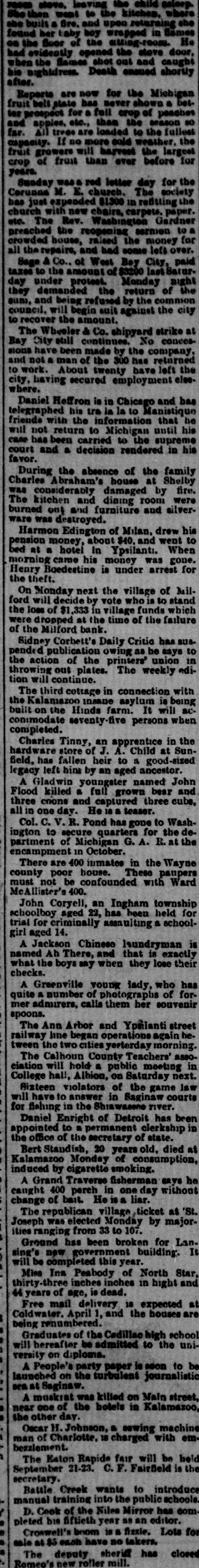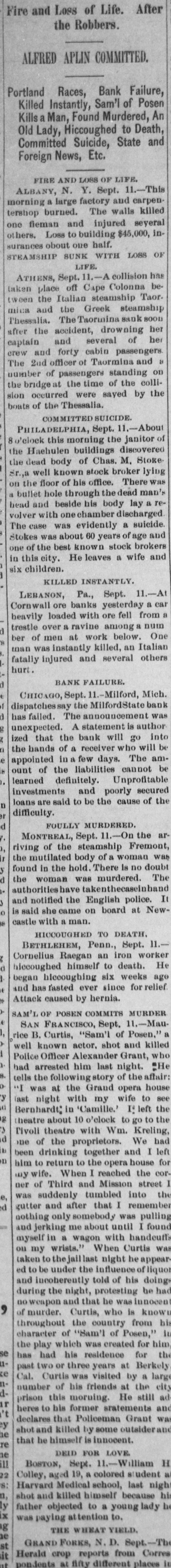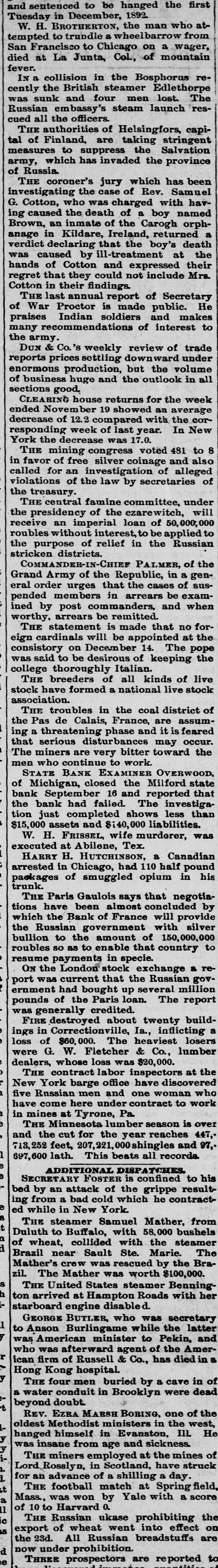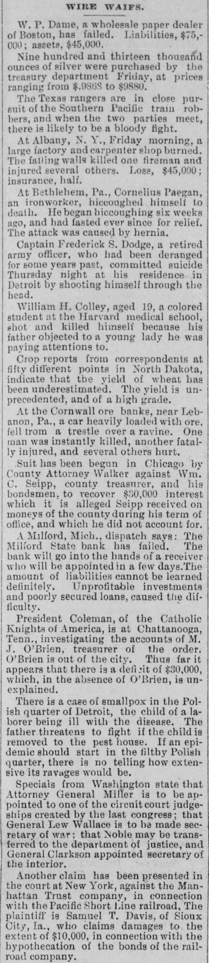leaving an indebtedness 17. A London bank lost £11,590 over the counter by sneak thieves. 23. A shooting affair between two Columbus (O.) editors resulted in the killing of one of the principals and also a bystander. MARCH. 9. Cloak factory at Jamaica, L. 1., burned by riotous strikers 10. David H. Poston. a rival lawyer, shot by H. Clay King in Memphis. APRIL 28. The late president of the Ninth National bank of New York a defaulter to the amount of $450,000. MAY. 10. An express car on the Santa Fe railroad in Oklahoma robbed by masked men. JULY. 8. Defaulting City Treasurer John Bardsley. of Philadelphia, sentenced to 15 years in the penitentiary and to pay a fineof $237,530. 19. A diamond importer of New York robbed of $10,000 worth of jewels. 24. 3 people killed and others injured by a negro murderer named Craig. who broke jail at Cynthiana. Ky.: he was finally killed. AUGUST 1. Fight with revolvers between LN. Baker. Col. Ingersoll's secretary. and Orville Anderson. & New York lawyer. at Croton Landing. N. Y.: Baker was wounded four times. 8. Daylight robbery of the Exchange bank at Columbus Grove. O.; the cashier and 2 others shot and the thief killed. 10. A train gang at New Haven attacked by Italians laborers to avenge an accident in which Italians were the victims. SEPTEMBER. 2. Southern Pacific train held up by masked men near Samuels. Tex. OCTOBER. 9. Robbers raided the National bank of Enterprise, Or., in broad light. 23. Discovery of defalcation of $190,000 of Teller E. F. Garcia, of the Louisiana National bank, in New Orleans. 25. Incendiaries burned 9 trestles on the Georgia Central railroad NOVEMBER 15. Suicide of a Salvation Army murderess in Omaha. 29. Rev. Dr. John Hall, Presbyterian clergy. man. of New York, assailed by a maniac, who fired three shots at him. 30. $75,000 stolen from an express train near St. Louis. DECEMBER 4. Russell Sage, banker, attacked by a maniac, who wrecked the office with dynamite: the maniac and I other killed. but Mr Sage escaped with slight injuries. 12. Brutal murder of Mrs. A. H. Bruce Mrs. L D. Hatch and child. and young Frank Packwood at New Smyrna, Fla. UPS AND DOWNS OF BUSINESS. JANUARY. 5. Failure of Dueber Watch company, Can ton. O.: liabilities. $450,000. 14. Failure of O'Donnell. Spencer & Co., lumber dealers at Saginaw, Mich.: $100,000. 30. Failure of the American National bank of Kansas City for $300,000. FEBRUARY. 18. Suspension of the American Loan and Trust company of New York: deficit of $656,000. MARCH. 20. Suspension of the Keystone National bank of Philadelphia. Failure of the banking house of Theodore Schwartz & Co. at Louisville: liabilities, $750,000. B. Suspension of the Washington National bank in New York city: shortage. $148,000. MAY. 4. Failure of J. H. Lippincott, of the American Graphophone company and North American Phonograph company. for $100.000. 8. Suspension of the Spring Garden bank and the Penn Trust and Safe Deposit company in Philadelphia. 12. Failure of Levy Bros. & Co., clothing manufacturers, in New York, for nearly $1,000,000. 19. Failure of Satterlee, Bostwick & Martin. insurance brokers, in New York, for over $100,000. 20. Assignment of the Davis Shoe company at Richmond, Va.: liabilities, $3,000,000. 25. Failure of Potter, White & Bayley, shoe manufacturers, in Boston, for $1,000,000. JUNE 4. Assignment of the Connell-Hall-McLester company. dry goods house, in Nashville: liabilities, $464,000. 12. Failure of the London and Liverpool Cloth. ing company and Mack Co. in New York: liabilities over $250,000. 22. Failure of Sax Bros., bankers, in Nashville, for $600,000. 25. Assignment of the wholesale shoe firm of Emile Marqueze & Co., in Boston: liabilities, $460,000. JULY. 11. Failure of Hard Bros. & Co., spring bed makers. in Oneida. N. Y., for $125,000. 13. Failure of R. M. Bingham & Co., wagon makers, in Rome, N. for $225,000. 20. Suspension of the Merchants' National bank of Fort Worth, Tex.: liabilities, $500,000. AUGUST. 2. Assignment of Abraham Backer. commission merchant and note broker, in New York: liabilities. $4,000,000. 8. Assignment of the Masonic Savings bank in Louisville, owing $1,000,000. 19. appointed for the American Wheel company. of Chicago, which has plants in six different states: liabilities. $1,800,000. 21. Seizure of the assetso the Mexican Northern railway in New York on a claim for $109,000. 22. Failure of S. V. White & Co., grain speculators of New York and Chicago, for nearly $3,000,000. OCTOBER. 19. Assignment of Jonathan Stewart. of Trenton: liabilities, $329,000. 22. Assignment of the Bank of Lewisburg, Tenn. NOVEMBER. 1. Failure of Maverick National bank in Boston: liabilities, $8,000,000. 7. Supension of National bank of Corry. Pa.: liabilities, $740,000. 10. Assignment of C. B. Paul, Louisville, lumber dealer, for $200,000. 12. Assignment of H. B. Smith & Co., New York ship brokers, for $300,000. 13. Failure of Louis Adler, New York cloak manufacturer, for $150,000. S. N. Stroube, California horse breeder, failed for $150,000. 15. Failure of Bonner & Bonner, bankers, for $560,000, in Tyler. Tex. 20. Shortage of $133,000 causes closing of Milford (Mich.)bank. 25. Failure of First National bank. Wilmington. N.C. 27. Assignment of New York banking firm of Fleld. Lindley. Wiechers & Co., with liabilities of over $1,000,000. DECEMBER 1. Receiver appointed for Richmond. Nicholasville and Beattyville railroad, Kentucky: debt. $3,000,000. 11. $250,000 assignment by Francis H. Baker Co., dry goods dealers of New York. DAME NATURE'S TANTRUG