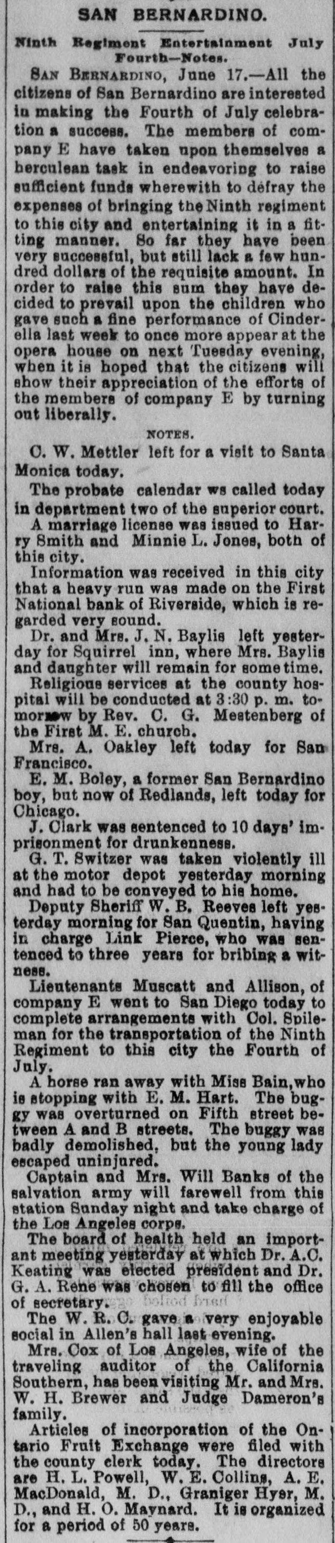 SAN BERNARDINO. Ninth Regiment Entertainment July Fourth-Notes. SAN BERNARDINO, June 17.-All the citizens of San Bernardino are interested in making the Fourth of July celebration a success. The members of company E have taken upon themselves a herculean task in endeavoring to raise sufficient funds wherewith to defray the expenses of bringing the Ninth regiment to this city and entertaining it in a fitting manner. So far they have been very successful, but still lack a few hundred dollars of the requisite amount. In order to raise this sum they have decided to prevail upon the children who gave such a fine performance of Cinderella last week to once more appear at the opera house on next Tueeday evening, when it is hoped that the citizens will show their appreciation of the efforts of the members of company E by turning out liberally. NOTES. C. W. Mettler left for a visit to Santa Monica today. The probate calendar ws called today in department two of the superior court. A marriage license was issued to Harry Smith and Minnie L. Jones, both of this city. Information was received in this city that a heavy run was made on the First National bank of Riverside, which is regarded very sound. Dr. and Mrs. J. N. Baylis left yesterday for Squirrel inn, where Mrs. Baylis and daughter will remain for sometime. Religious services at the county hospital will be conducted at 3:30 p. m. tomorm by Rev. C. G. Mestenberg of the First M. E. church. Mrs. A. Oakley left today for San Francisco. E. M. Boley, a former San Bernardino boy, but now of Redlands, left today for Chicago. J. Clark was sentenced to 10 days' imprisonment for drunkenness. G. T. Switzer was taken violently ill at the motor depot yesterday morning and had to be conveyed to his home. Deputy Sheriff W. B. Reeves left yesterday morning for San Quentin, having in charge Link Pierce, who was sentenced to three years for bribing a witness. Lieutenants Muscatt and Allison, of company E went to San Diego today to complete arrangements with Col. Spileman for the transportation of the Ninth Regiment to this city the Fourth of July. A horse ran away with Miss Bain, who is stopping with E. M. Hart. The buggy was overturned on Fifth street between A and B streets. The buggy was badly demolished, but the young lady escaped uninjured. Captain and Mrs. Will Banks of the salvation army will farewell from this station Sunday night and take charge of the Los Angeles corps. The board of health held an important meeting yesterday at which Dr.A.C. Keating was elected president and Dr. G.. A. Rene was chosen to fill the office Brad of secretary. The W.R.C. gave a very enjoyable social in Allen's hall last evening. Mrs. Cox of Los Angeles, wife of the traveling auditor of the California Southern, has been visiting Mr. and Mrs. W. H. Brewer and Judge Dameron's family. Articles of incorporation of the Ontario Fruit Exchange were filed with the county elerk today. The directors are H. L. Powell, W. E. Collins, A.E. MacDonald, M. D., Graniger Hyer, M. D., and H. o. Maynard. It is organized for a period of 50 years.