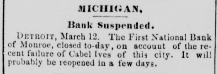 MICHIGAN, Bank Suspended. DETROIT, March 12. The First National Bank of Monroe, closed to-day, on account of the recent failure of Cabel Ives of this city. It will probably be reopened in a few days.