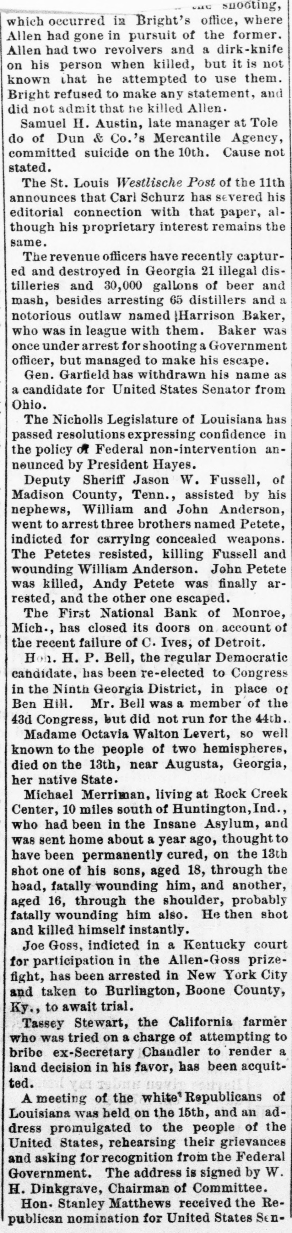CALC which occurred in Bright's snooting, office, where Allen had gone in pursuit of the former. Allen had two revolvers and a dirk-knife on his person when killed, but it is not known that he attempted to use them. Bright refused to make any statement, and did not admit that he killed Allen. Samuel H. Austin, late manager at Toledo of Dun & Co.'s Mercantile Agency, committed suicide on the 10th. Cause not stated. The St. Louis Westlische Post of the 11th announces that Carl Schurz has severed his editorial connection with that paper, although his proprietary interest remains the same. The revenue officers have recently captured and destroyed in Georgia 21 illegal distilleries and 30,000 gallons of beer and mash, besides arresting 65 distillers and a notorious outlaw named Harrison Baker, who was in league with them. Baker was once under arrest for shooting a Government officer, but managed to make his escape. Gen. Garfield has withdrawn his name as a candidate for United States Senator from Ohio. The Nicholls Legislature of Louisiana has passed resolutions expressing confidence in the policy of Federal non-intervention announced by President Hayes. Deputy Sheriff Jason W. Fussell, of Madison County, Tenn., assisted by his nephews, William and John Anderson, went to arrest three brothers named Petete, indicted for carrying concealed weapons. The Petetes resisted, killing Fussell and wounding William Anderson. John Petete was killed, Andy Petete was finally arrested, and the other one escaped. The First National Bank of Monroe, Mich., has closed its doors on account of the recent failure of C. Ives, of Detroit. Hon. H. P. Bell, the regular Democratic candidate, has been re-elected to Congress in the Ninth Georgia District, in place of Ben Hill. Mr. Bell was a member of the 43d Congress, but did not run for the 44th. Madame Octavia Walton Levert, so well known to the people of two hemispheres, died on the 13th, near Augusta, Georgia, her native State. Michael Merriman, living at Rock Creek Center, 10 miles south of Huntington, Ind., who had been in the Insane Asylum, and was sent home about a year ago, thought to have been permanently cured, on the 13th shot one of his sons, aged 18, through the head, fatally wounding him, and another, aged 16, through the shoulder, probably fatally wounding him also. He then shot and killed himself instantly. Joe Goss, indicted in a Kentucky court for participation in the Allen-Goss prize-fight, has been arrested in New York City and taken to Burlington, Boone County, Ky., to await trial. Tassey Stewart, the California farmer who was tried on a charge of attempting to bribe ex-Secretary Chandler to render a land decision in his favor, has been acquitted. A meeting of the white Republicans of Louisiana was held on the 15th, and an address promulgated to the people of the United States, rehearsing their grievances and asking for recognition from the Federal Government. The address is signed by W. H. Dinkgrave, Chairman of Committee. Hon. Stanley Matthews received the Republican nomination for United States Sen-