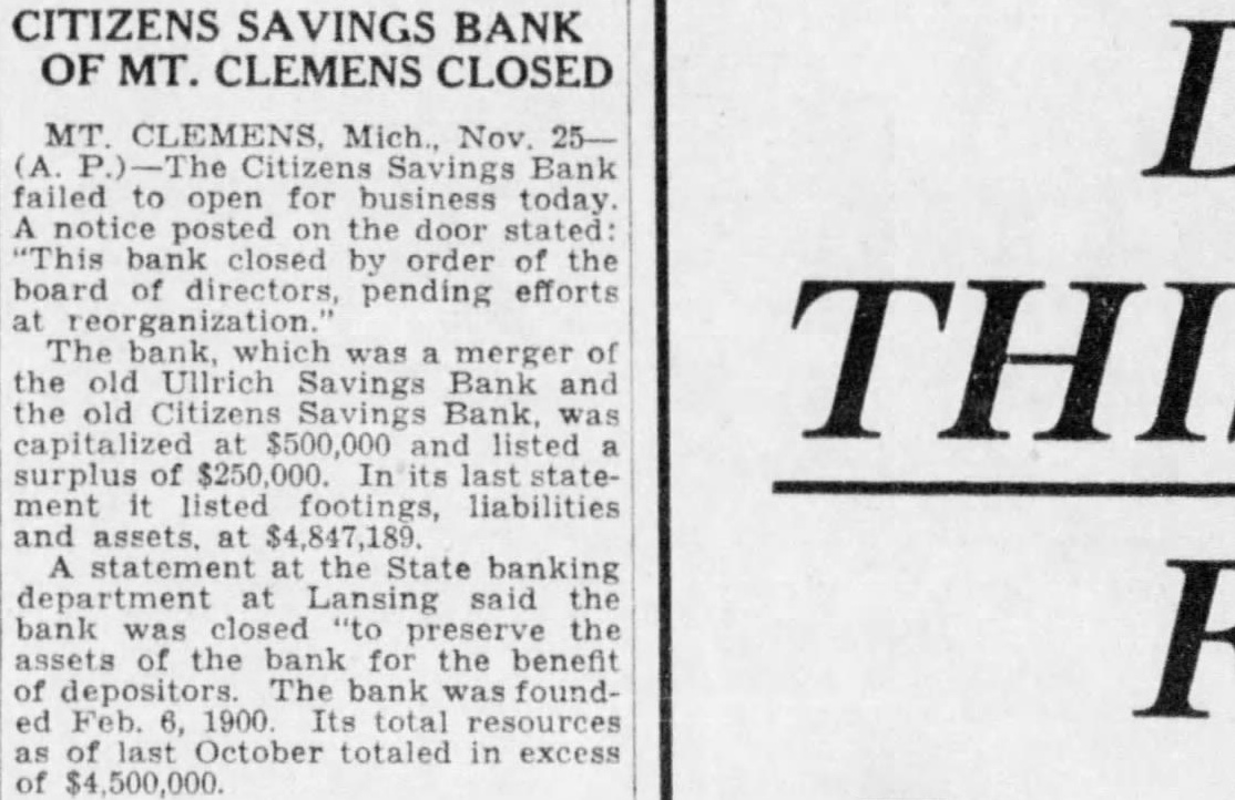MT. CLEMENS, Mich., Nov. 25(A. The Citizens Savings Bank failed to open for business today A notice posted on the door stated: "This bank closed by order of the board of directors, pending efforts at reorganization.' The bank, which was merger of the old Ullrich Savings Bank and the old Citizens Savings Bank, was capitalized at $500,000 and listed surplus of $250,000. In its last statement it listed footings, liabilities and assets, at $4,847,189. statement at the State banking department at Lansing said the bank was closed preserve the assets of the bank for the benefit of depositors. The bank was founded Feb. 6, 1900. Its total resources of last October totaled in excess of $4,500,000.
