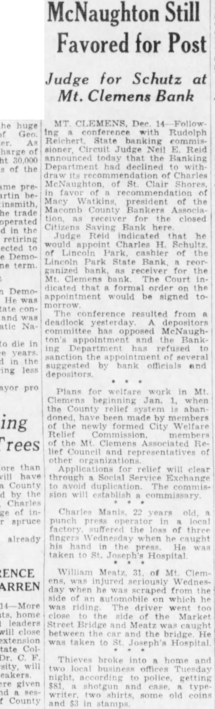 MT CLEMENS, Dec Rudolph Reichert State banking commisCircuit Judge Reid today the Banking Department had declined with Charles of St. Clair Shores, favor Macy president the Macomb County Association, receiver for the closed Citizens Saving Bank here Judge Reid indicated he appoint Charles H. Schultz of Park, cashier of the Lincoln Park State reorganized for the bank Court that the would be signed The conference resulted from deadlock depositors committee opposed appointment and the Bank Department has refused to sanction by bank officials and