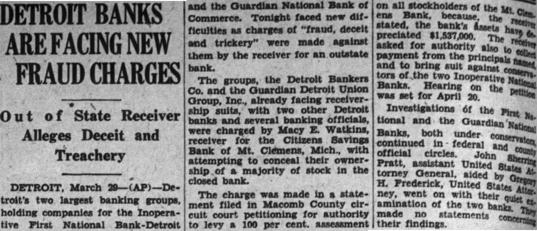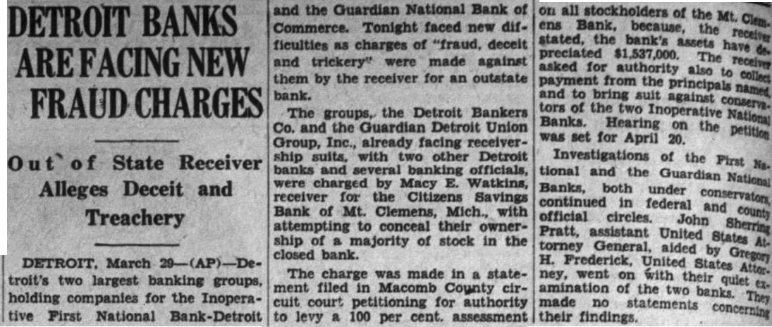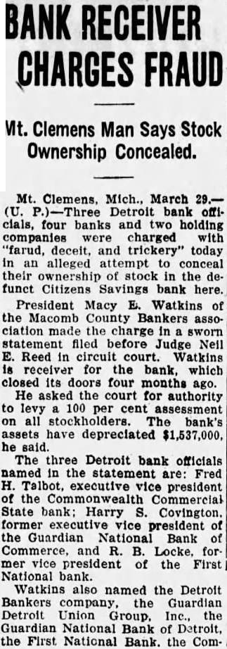 Mt. Clemens, Mich., March Detroit bank officials, four banks and two holding companies were charged with "farud, deceit, and trickery" today an alleged conceal their ownership stock the funct Citizens Savings bank here. President Macy E. Watkins of the Macomb County Bankers association made charge sworn statement filed before Judge Neil E. Reed circuit court. Watkins receiver the which closed its doors four months ago. He asked the court for authority levy 100 per cent assessment on all The bank's assets have depreciated $1,537,000 he said. The three Detroit bank officials named the statement are: Fred H. Talbot, executive vice president the Commonwealth Commercial State Harry Covington. former executive vice president of the Guardian National Bank Commerce. and R B. Locke, for vice president of the First National bank. Watkins also named the Detroit Bankers company, the Guardian the First National Bank. the Com-