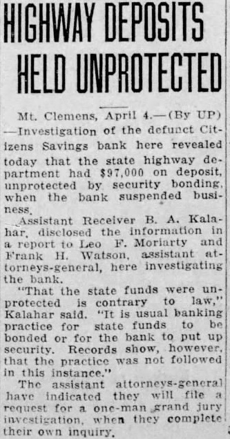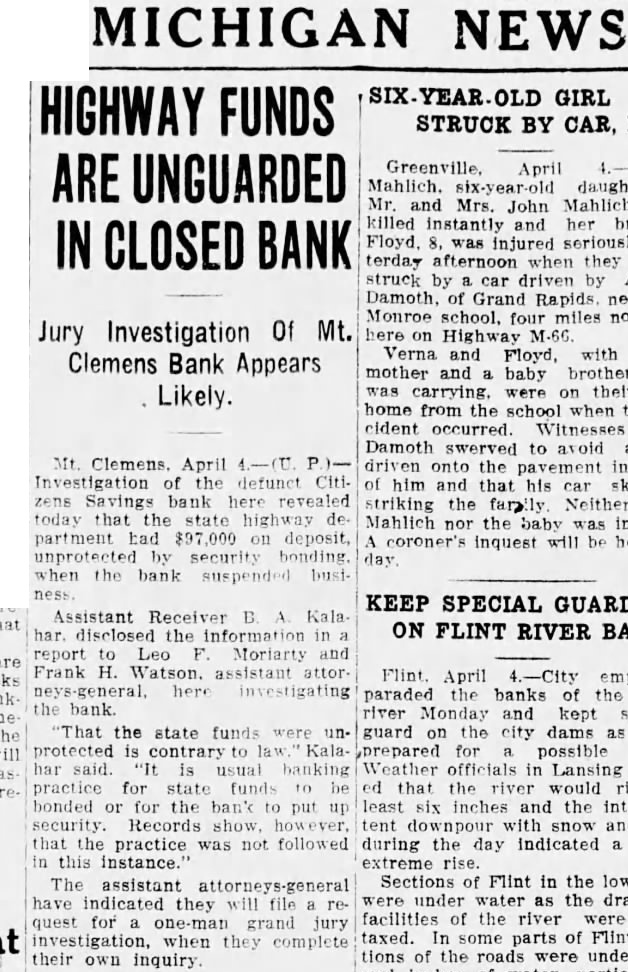 Mt. Clemens. April Investigation the defunct Citizens Savings bank here revealed today that the state highway department had deposit, unprotected security bonding. when the bank suspended busi-