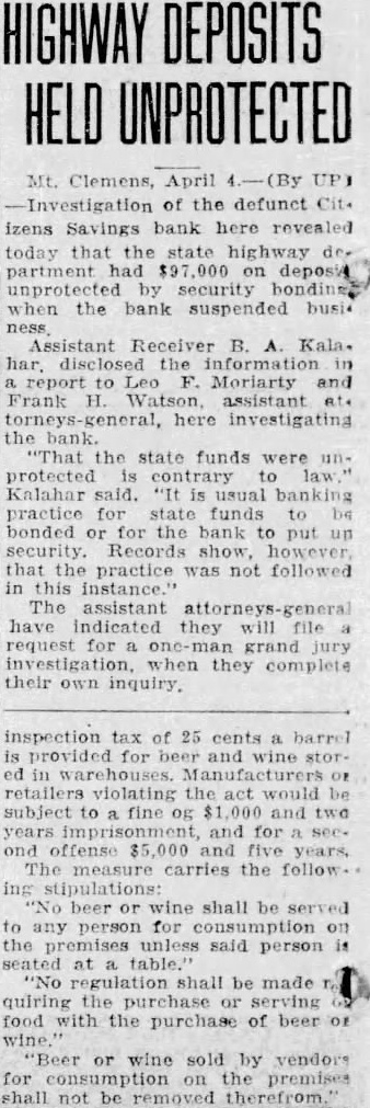 Mt. Clemens, April Investigation of the defunct izens Savings bank here revealed today that state highway partment deposit by security the bank suspended Assistant Receiver B. Kala. har, the Moriarty and Frank assistant torneys here investigating the "That the state funds were protected contrary said. usual practice funds bonded or the bank put Records that practice was not followed in this The assistant have indicated they request for grand they complete their inquiry. inspection tax of 25 cents barrel provided for and retailers violating the act would subject fine og and two years and $5,000 years. The carries the follow beer wine shall be served to any person for consumption the said person seated at table.' "No regulation shall be made quiring food with the purchase of beer "Beer wine sold by vendors for on the premises