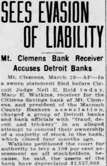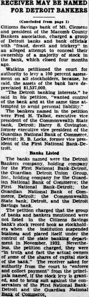 Watkins petitioned the court for authority to levy 100 percent assess ment on all stockholders, because, he said, the assets of the bank have depreciated $1,537,000. "The Detroit banking interests." he said in his petition, 'wanted control of the bank and at the same time attempted to avoid personal liability The bankers named in the petition were Fred H. Talbot, executive vice president of the State bank, Detroit: Harry S. Covington, former executive vice president of the Guardian National Bank of Commerce, Detroit: R. B. Locke, former vice president of the First National Bank-De-