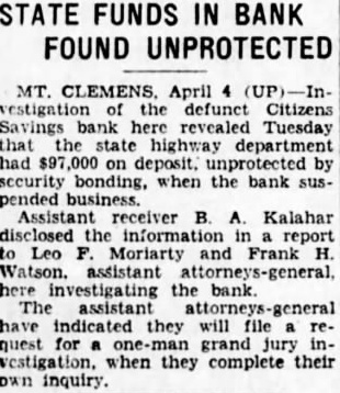 Mt. Clemens, April (By UP) Investigation of the Cit. izens Savings bank revealed today that the department deposit, unprotected by bonding when the bank suspended busiAssistant Receiver B. Kalahar, information Moriarty and report Frank assistant here investigating the "That the state funds were unprotected contrary to Kalahar said. usual banking practice for state funds bonded or for bank put security. Records show, the practice not followed in this instance." assistant have indicated they file request grand when complete their own