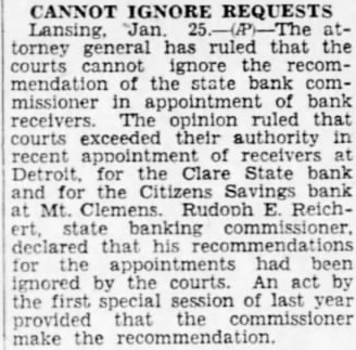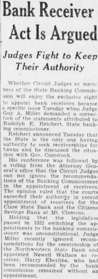 Whether Circuit Judges or members of the State Banking Commission will enjoy the exclusive right to appoint bank became specific issue Tuesday when Judge Guy Miller demanded tion of the statements attributed to Rudolph E. Reichert. State banking Reichert announced Tuesday that the State is the only one authority to seek for banks and he discussed the situa tion with Gov. Comstock His conference was followed by ruling from the Attorney General's office that the Circuit Judges can not ignore the recommendations of the Banking Commissioner in the appointment of receivers. The opinion ruled that the courts exceeded their authority in recent appointment of receivers for the Clare State Bank and the Citizens Savings Bank at Mt Clemens Holding that the legislation passed in 1932 switching the appointments to the banking commissioner was unconstitutional, Judge Miller recently ignored recommendations for the receivership of the Northw State Bank and appointed Newell Wallace as ceiver. Harry Eberline, who had been by the bank commission remained without an appointment.