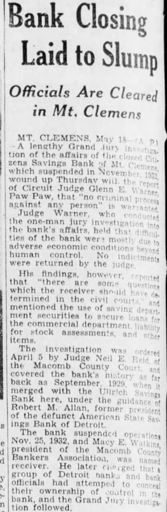 MT. CLEMENS May Grand Jury tion of the affairs zens Savings Bank which suspended in wound up Thursday will of Circuit Judge Glenn Paw that cruninal against any Judge Warner who the one-man jury investigat the bank's held that ties of the bank were most adverse economic human control No returned by the judge His findings, however. that are some which the termined the civi] mentioned the use of saving ment securities to secure the commercial department for stock assessments, The investigation was April by Judge Neil the Macomb County covered the bank's back September, 1929 merged with the Ultrich Bank under the Robert M. Allan, former of the American ings Bank Detroit. The bank suspended Nov. and Macy president the Macomb Bankers Association. receiver. He later group Detroit banks officials had their ownership bank, and the Grand Jury tion