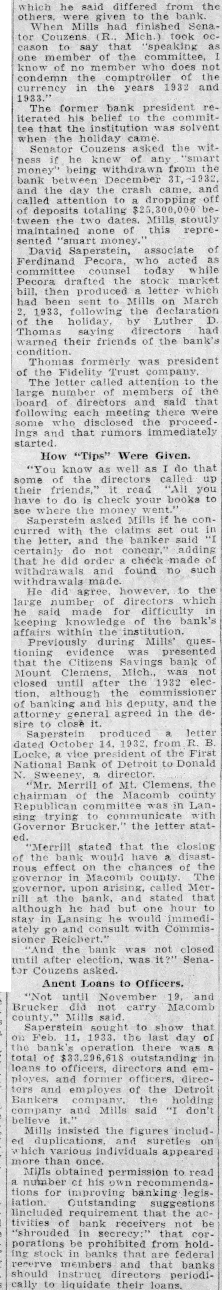 he differed from the given When Mills finished Couzens took say that no does not condemn the comptroller the in the years 1932 and The bank president rehis tee that institution solvent holiday Couzens asked the ness knew money" being withdrawn from the bank December 31, and crash and dropping off of be. Mills stoutly none this represented money. David Saperstein, associate of Ferdinand Pecora, today Pecora the stock bill. then letter had sent to Mills on March 1933, following the by Luther Thomas warned their friends of the bank's condition. was president of Fidelity Trust company The letter attention the large board and said that some ings and that rumors immediately